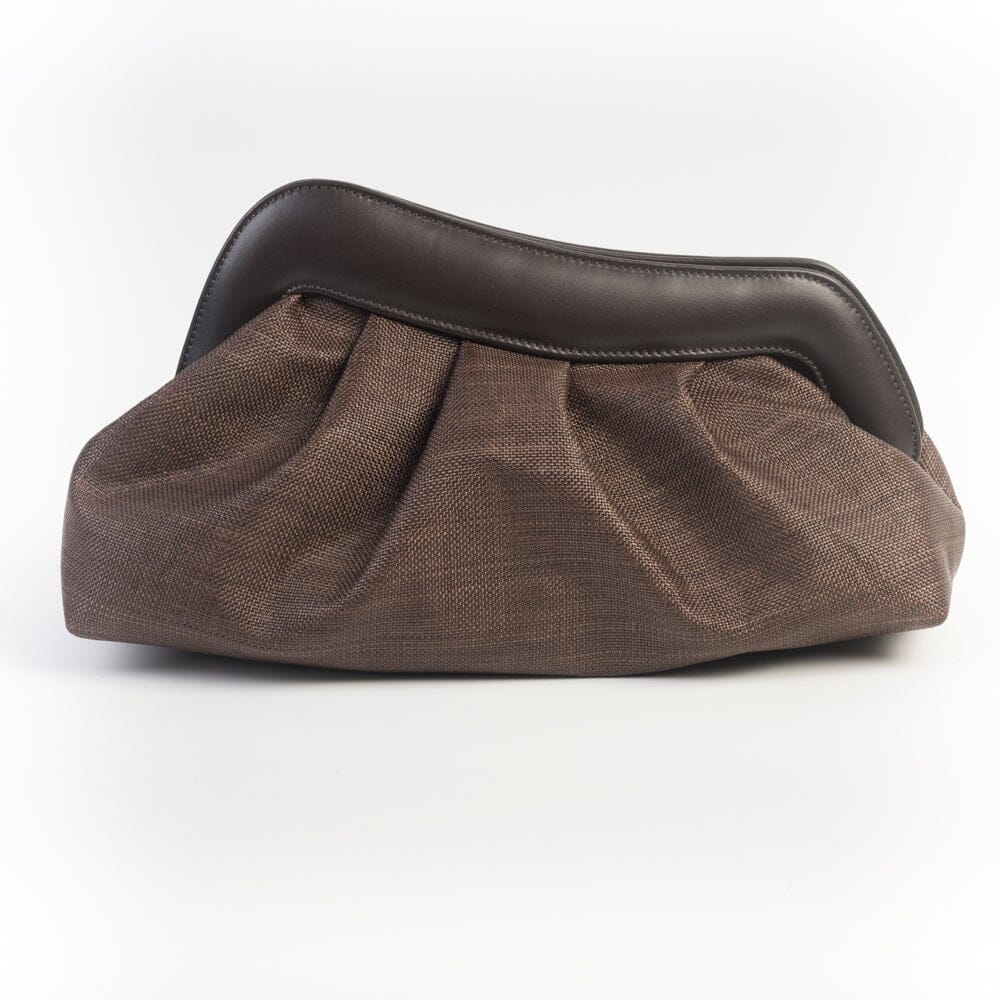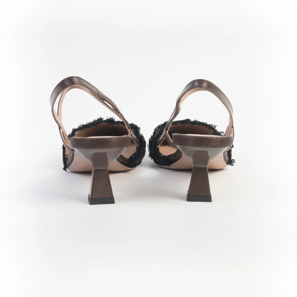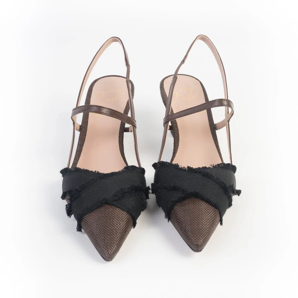 Sling Back a punta di Roberto Festa, realizzate in pelle e rafia di colore marrone con due fasce accavallate in tessuto rigato e sfrangiato di colore nero. Cinturino con elastico alla caviglia e sul collo del piede. Fodera interna e sottopiede in pelle. Tacco rocchetto in nuance, di cm 6 circa. Suola in cuoio.