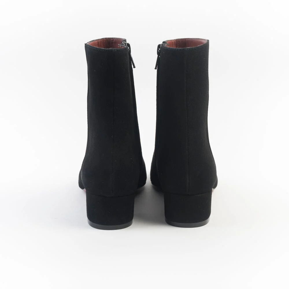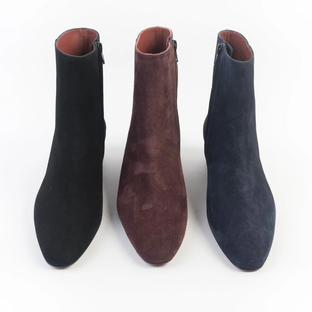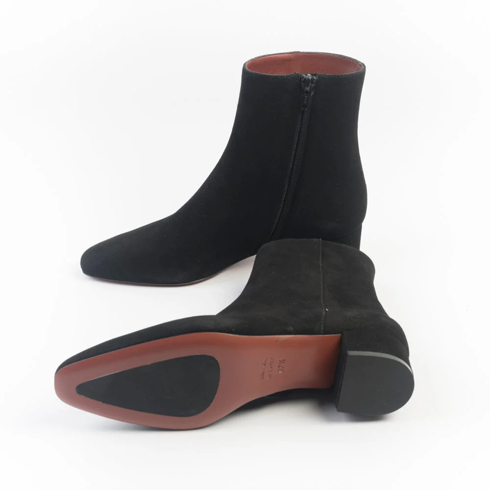 Elegante stivaletto di Roberto Festa realizzato in morbido camoscio di colore nero. Cerniera su lato interno per agevolare la calzata. Fodera interna e sottopiede in pelle. Tacco foderato di altezza 3 cm circa. Suola in cuoio con inserti in gomma. Disponibile anche nella varianti di colore prugna e blu.