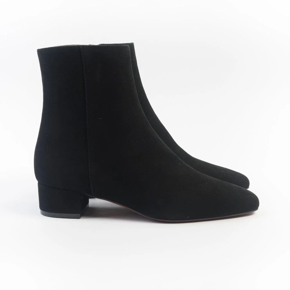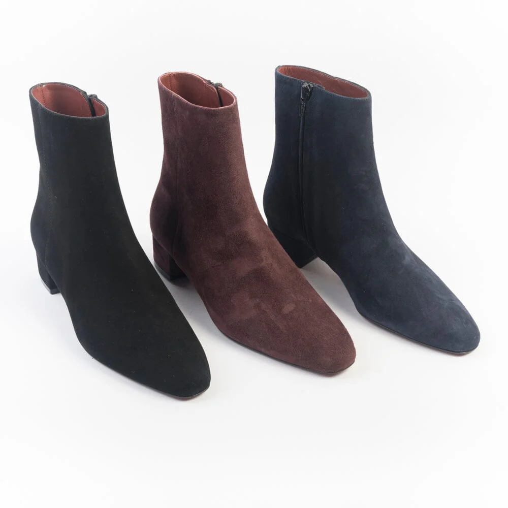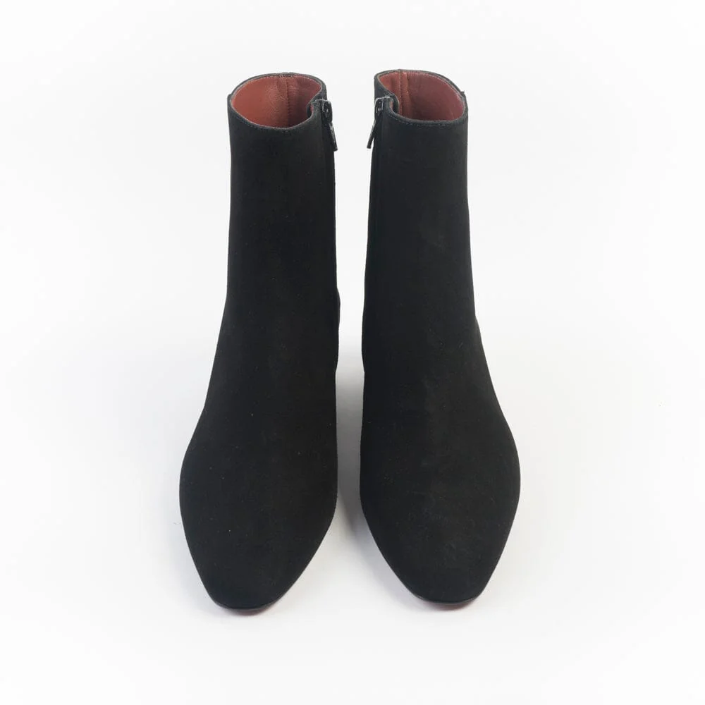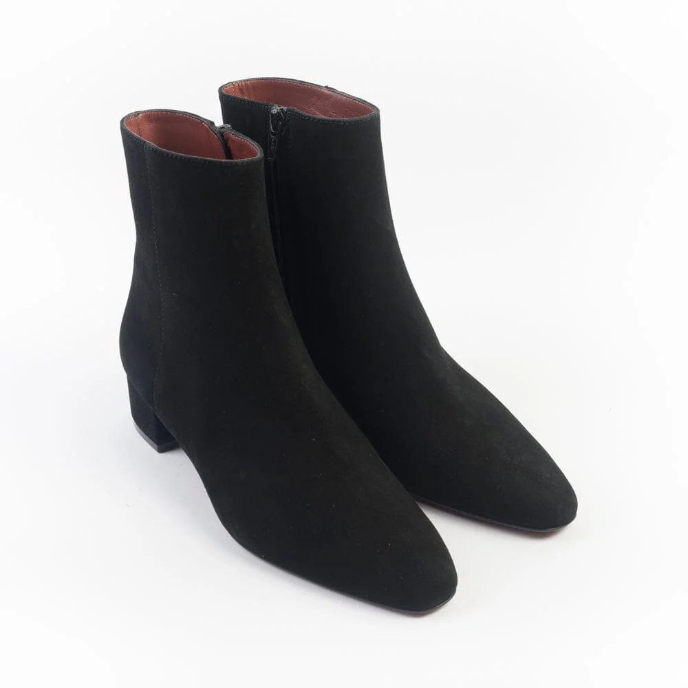 Elegante stivaletto di Roberto Festa realizzato in morbido camoscio di colore nero. Cerniera su lato interno per agevolare la calzata. Fodera interna e sottopiede in pelle. Tacco foderato di altezza 3 cm circa. Suola in cuoio con inserti in gomma. Disponibile anche nella varianti di colore prugna e blu.