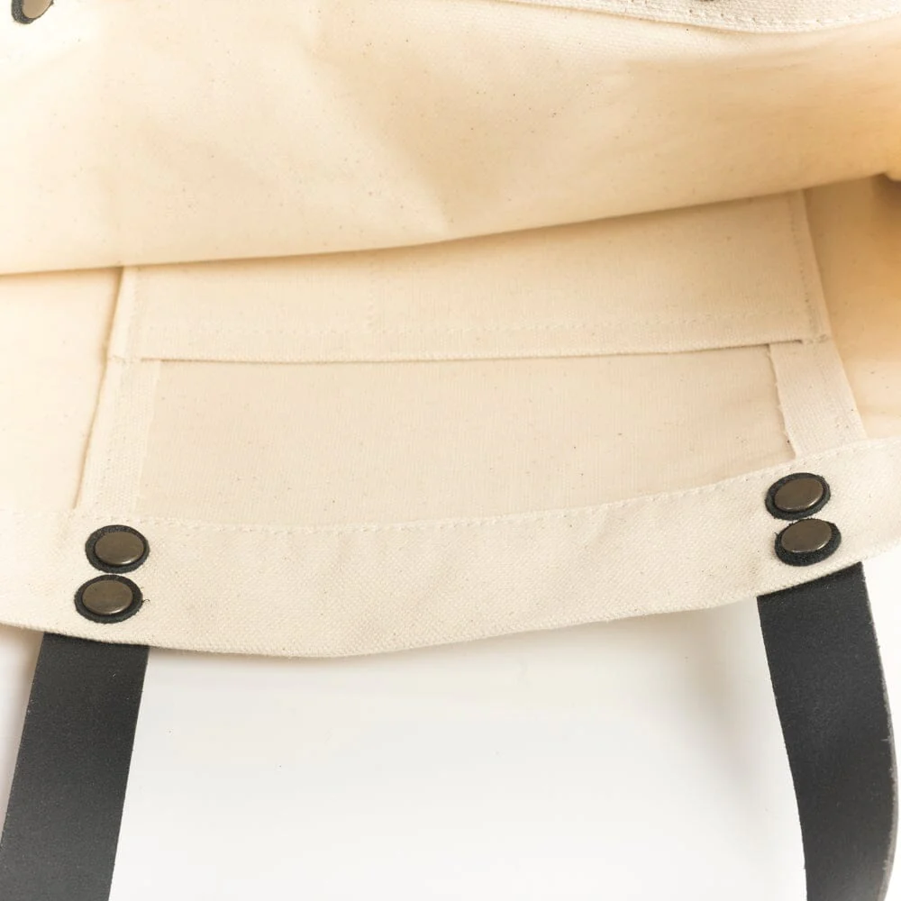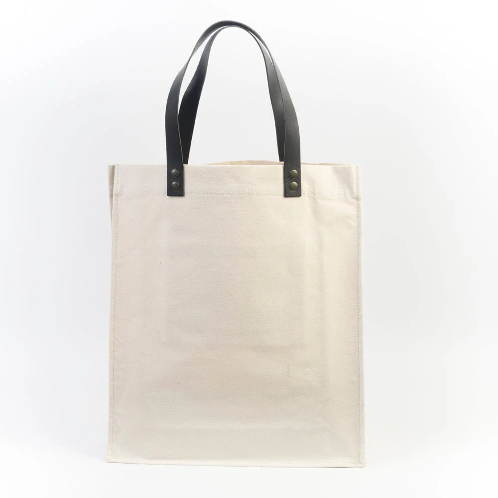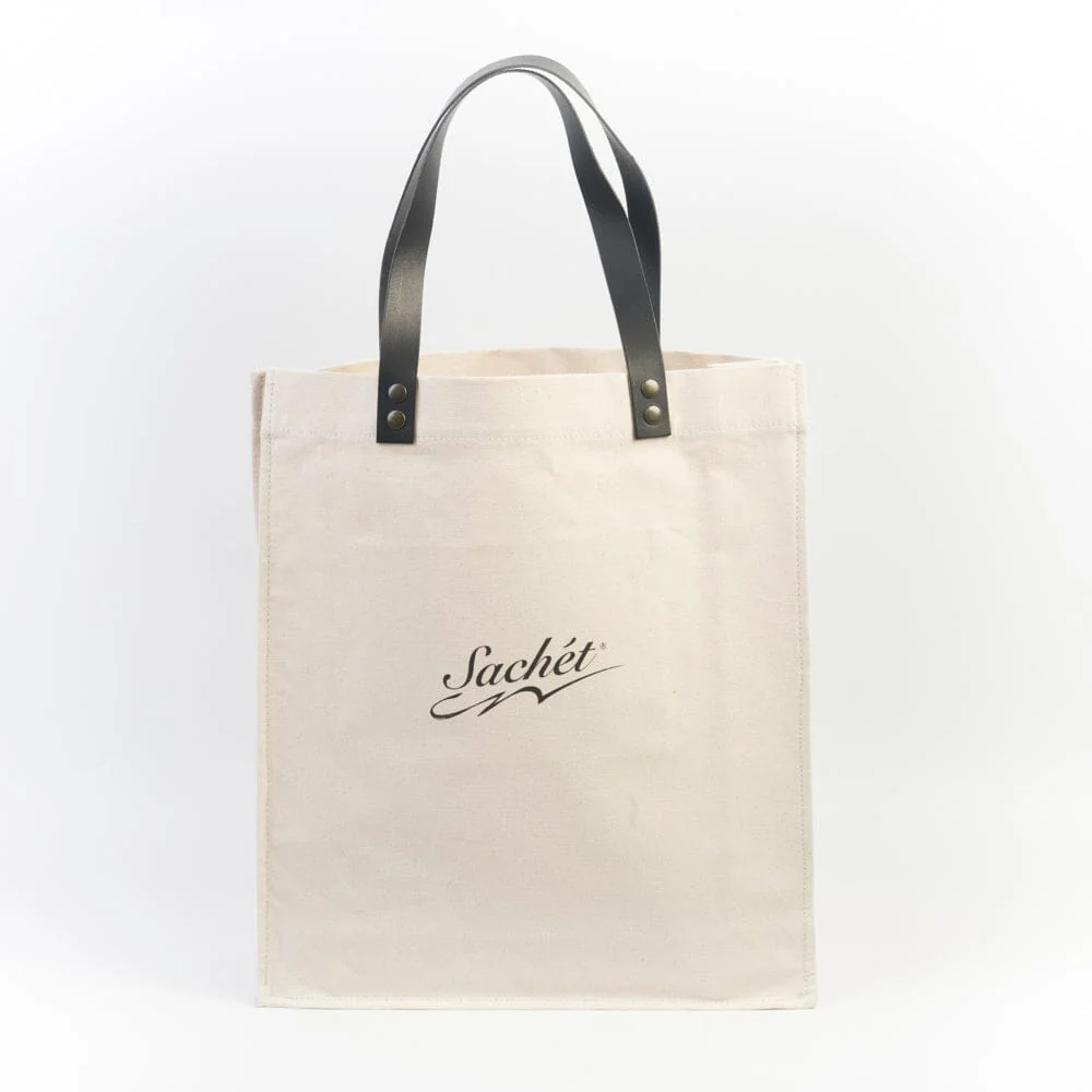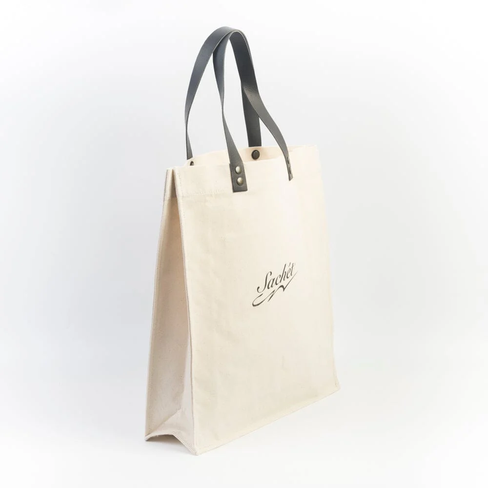 Borsa in tela di cotone, realizzata per Sachet, di colore beige. Interno plastificato, ideale anche per l’utilizzo quotidiano. Logo Sachèt su parte frontale. Taschina interna. Manici in pelle di colore nero.