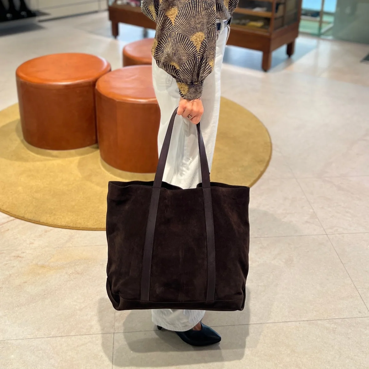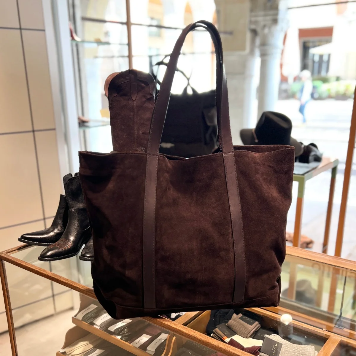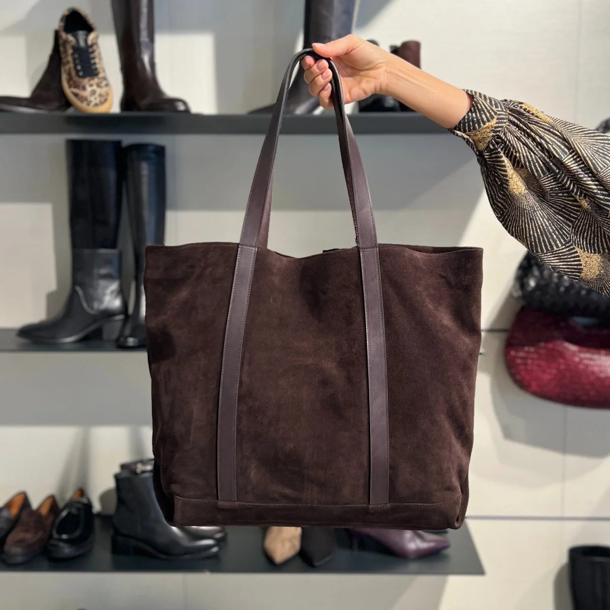 Borsa a spalla di Sachet realizzata in pregiato camoscio di colore moro. Foderata internamente in tessuto logato con taschino chiuso da zip. Doppi manici in vacchetta, in nuance, per essere portata a spalla Sacca anti-polvere.