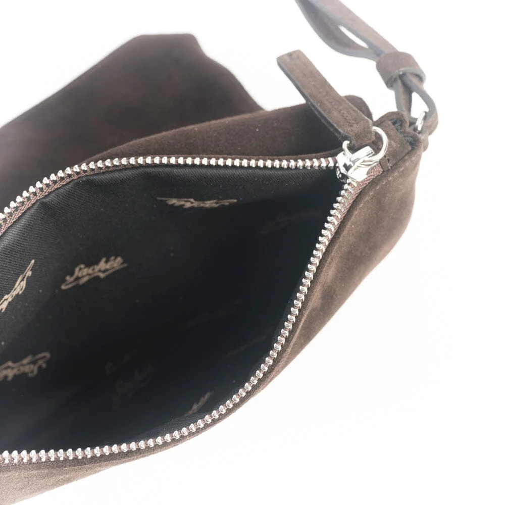 Pochette di Sachet, realizzata in camoscio di colore testa di moro. Chiusura con patta e zip interna. Interno foderato in tessuto. Tracolla lunga regolabile in camoscio in nuance.