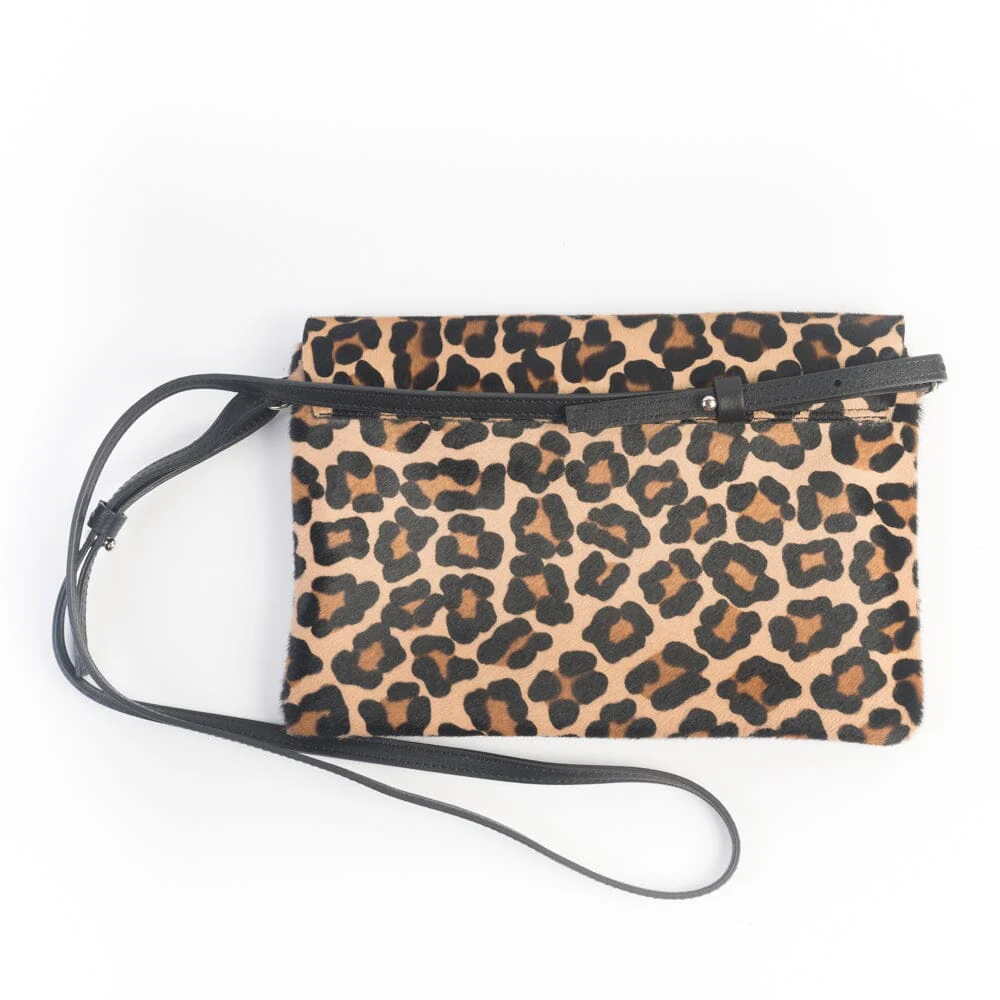 Pochette di Sachet, realizzata in cavallino fantasia maculato di colore nero, beige e marrone. Chiusura con patta e zip interno. Interno foderato in tessuto. Tracolla lunga regolabile in pelle di colore nero.