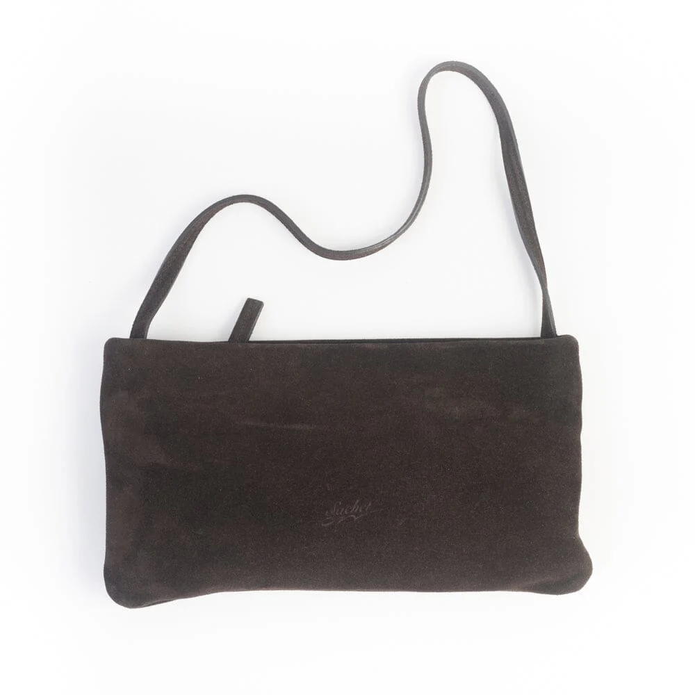 Raffinata pochette di Sachet, realizzata in camoscio di colore testa di moro. Chiusura con zip centrale. Interno foderato in tessuto. Tracolla a spalla in camoscio in nuance.