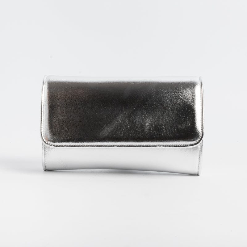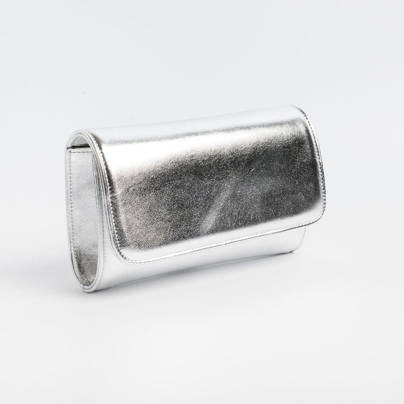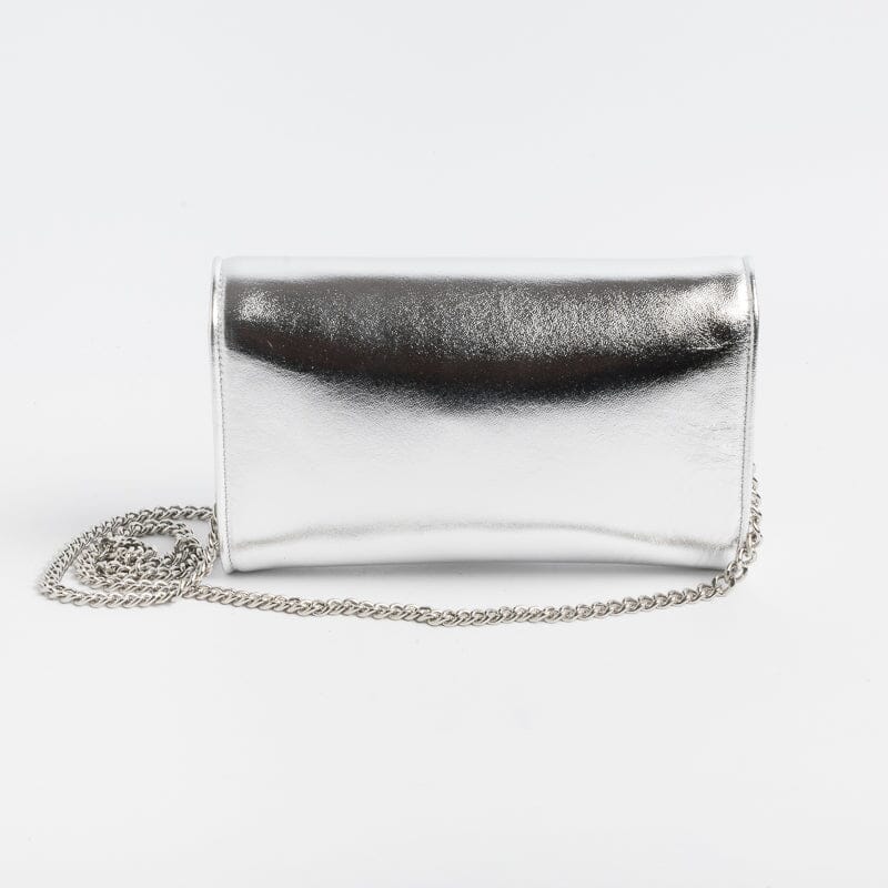 Pochette elegante di Sachet, modello Bride, realizzata in pelle laminata di colore argento. Interno foderato. Tracolla a catenella in metallo in nuance.
