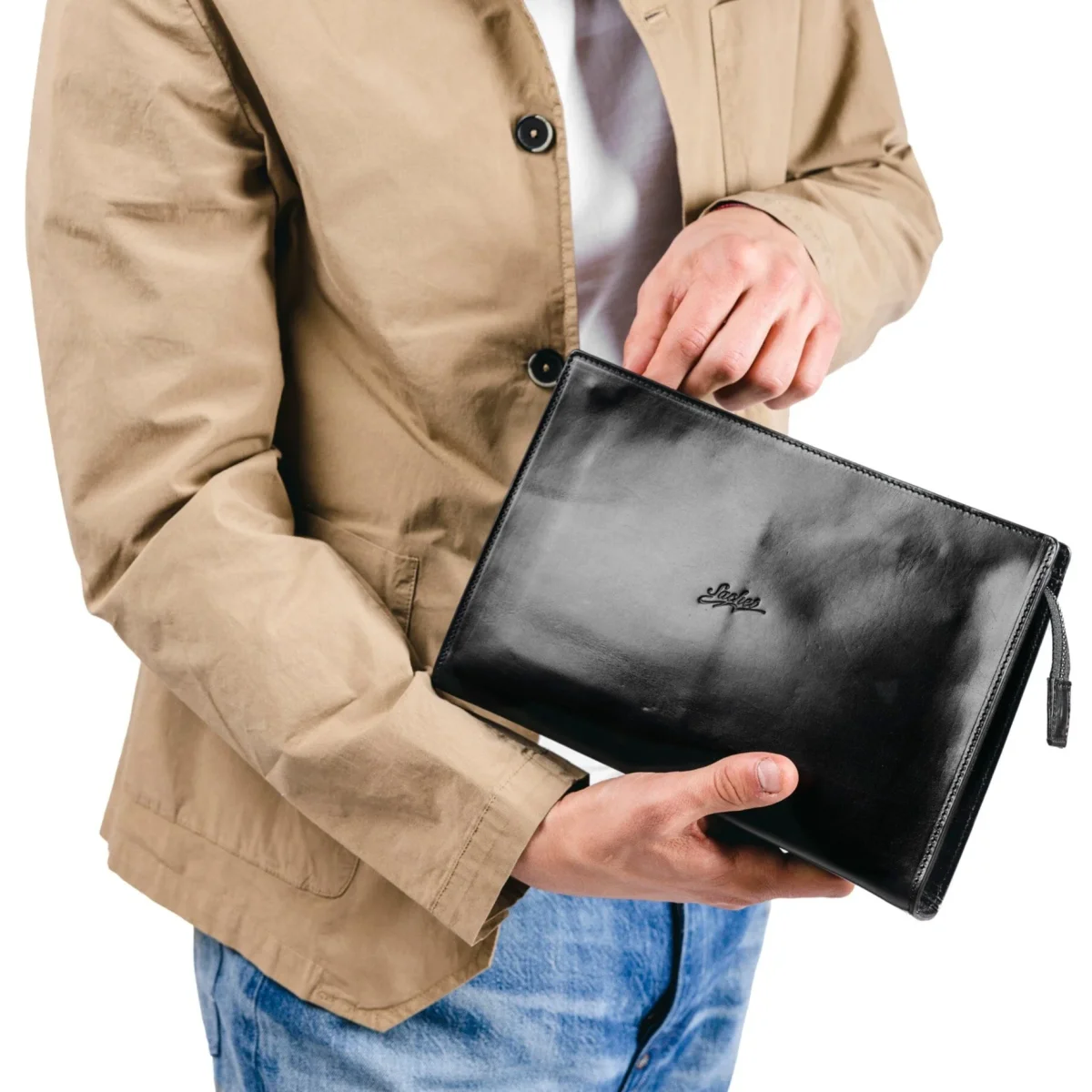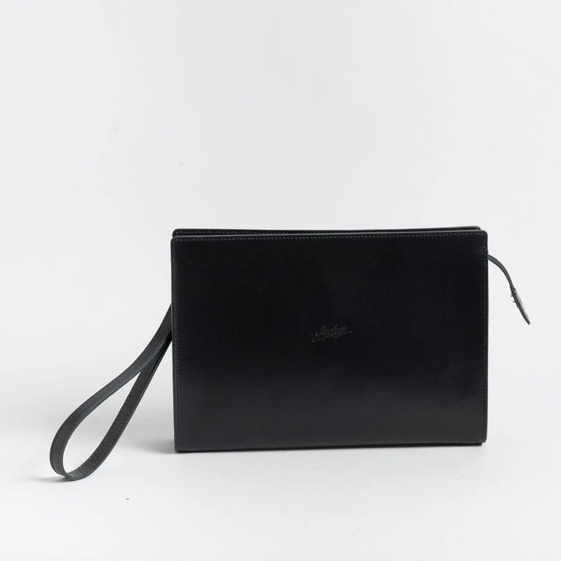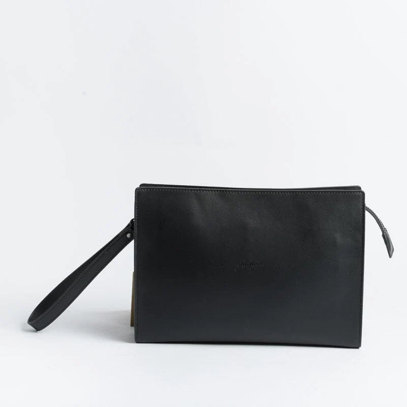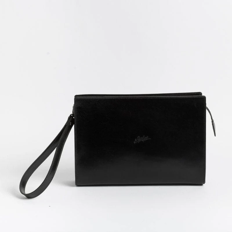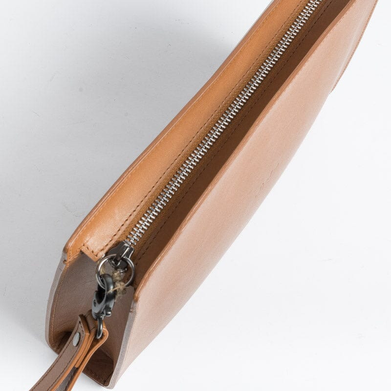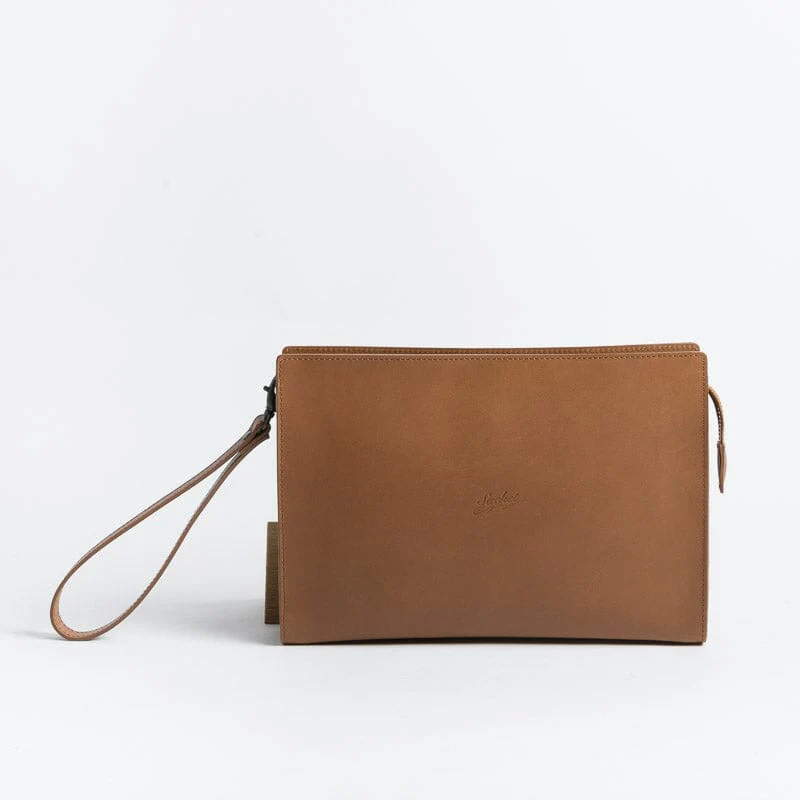 Pochette di Sachet , unisex, dalla forma rettangolare, realizzata in pelle nei colori nero, cuoio e cognac. Accessibile con zip, interno in tessuto. Comoda polsiera in pelle con gancio amovibile. Sacchetto antipolvere in dotazione.