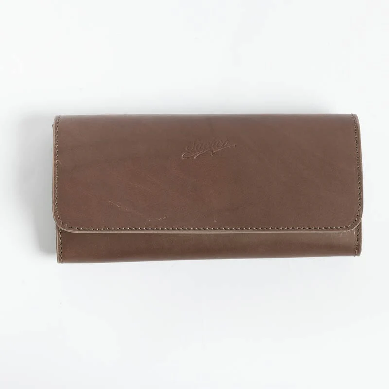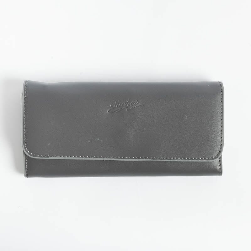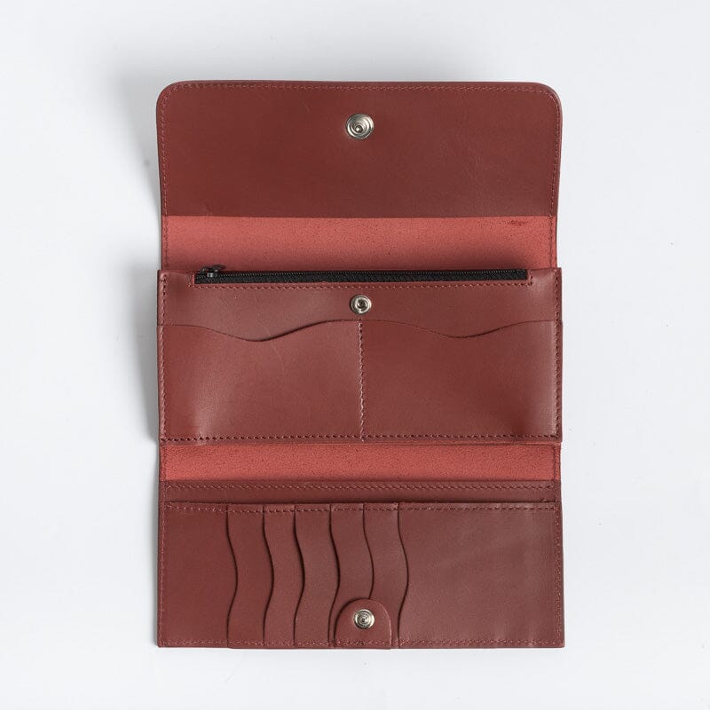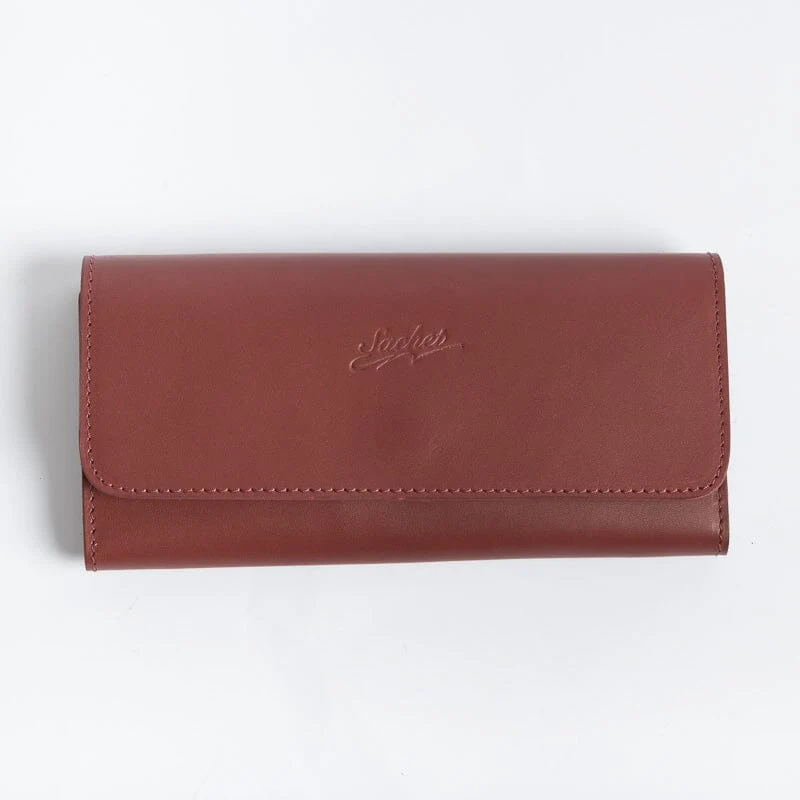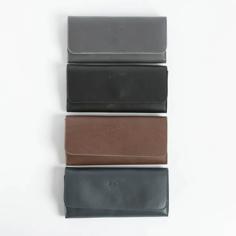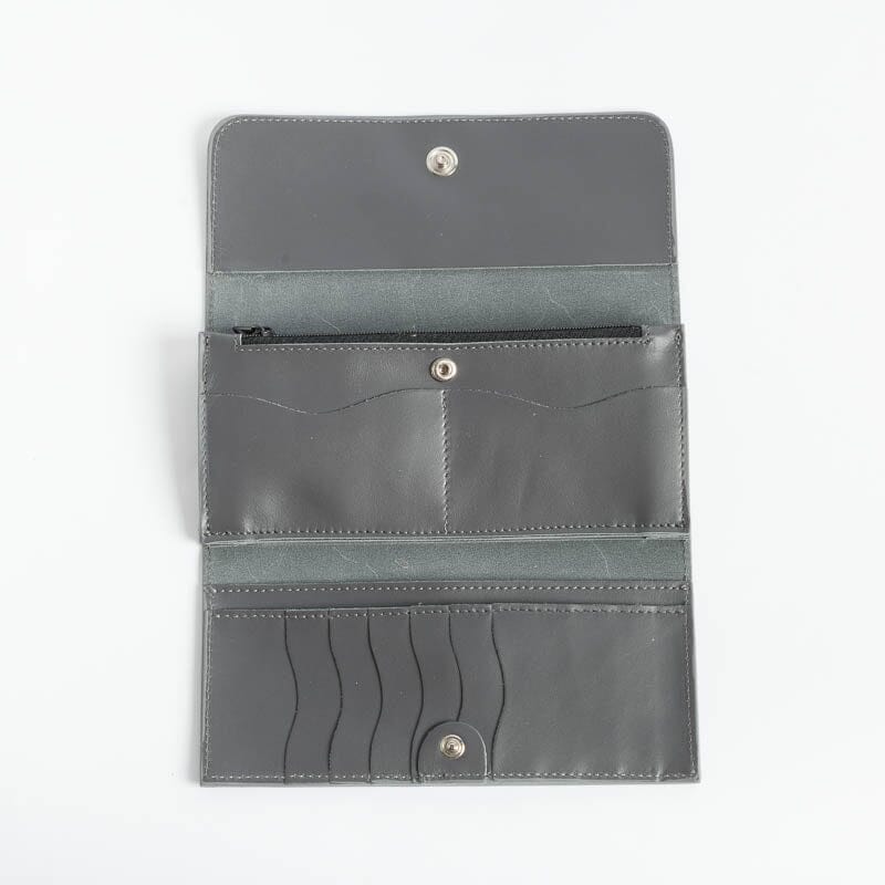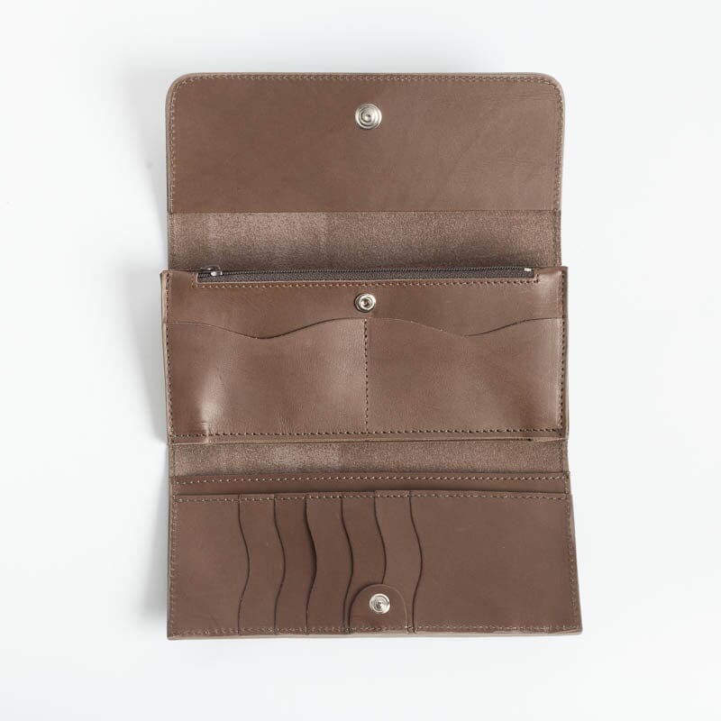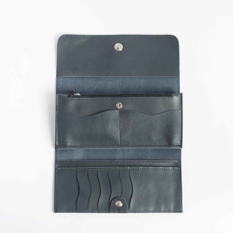 Portafoglio in pelle di vitello di colori vari. Interno con apertura a libro dotato di taschine carte, doppio soffietto banconote e cerniera monete. Chiusura con bottone a pressione, logo impresso sul fronte.