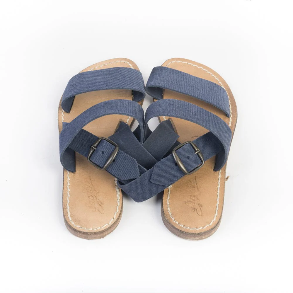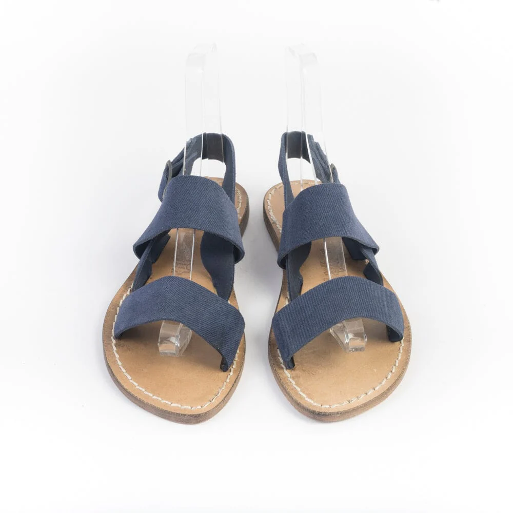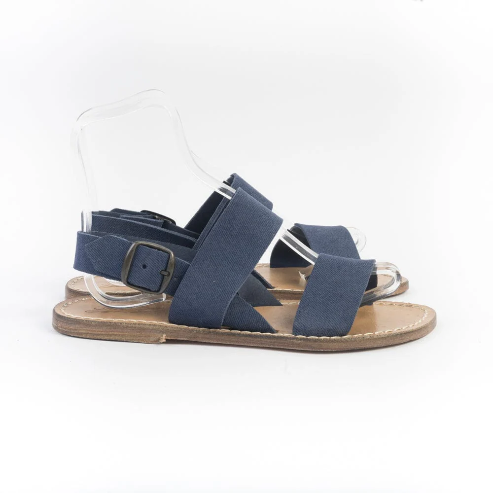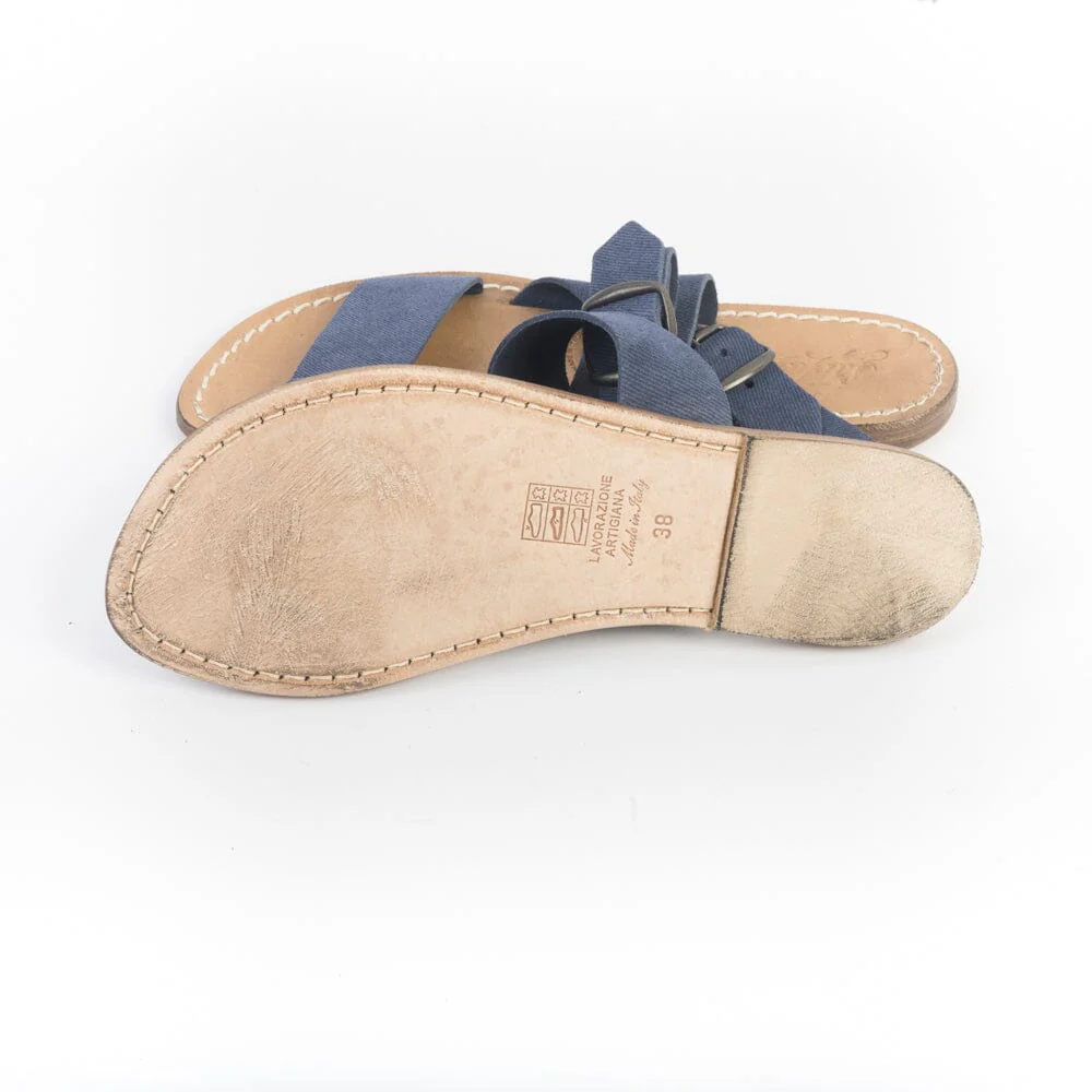 Sandalo artigianale realizzato per Sachet in camoscio di colore blu. Tomaia con doppia fascia e chiusura con cinturino regolabile alla caviglia. Suola e profili in cuoio fresati ed anticati per un effetto vintage.