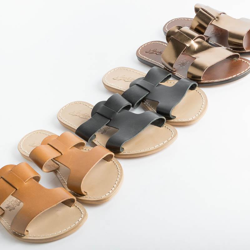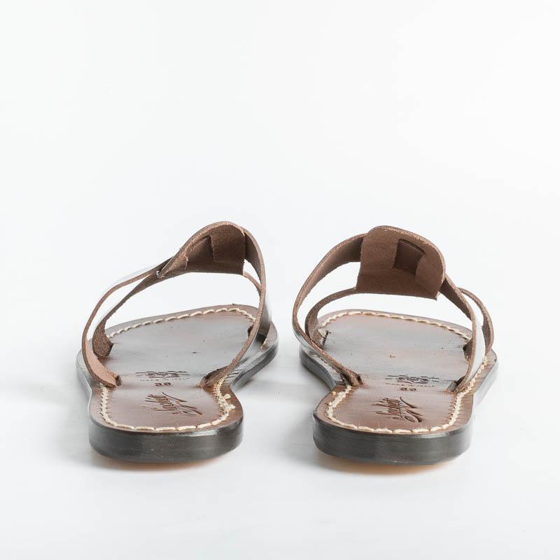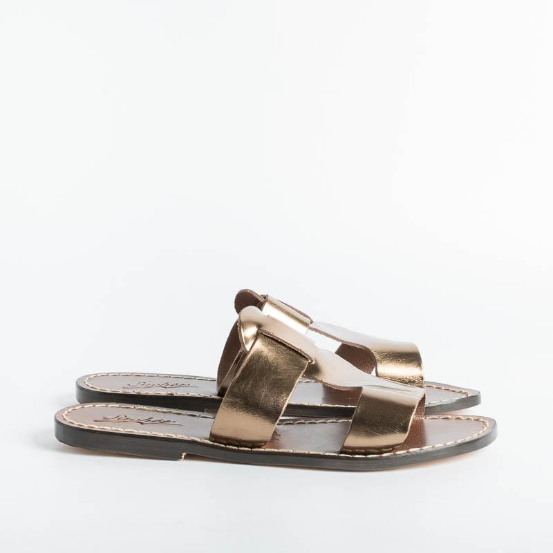 Ciabattina realizzata per Sachet con incrocio di tomaia in morbida pelle laminata di colore bronzo. Disponibile anche nei colori nero e cuoio. Sottopiede in cuoio tuffato. Suola in cuoio.