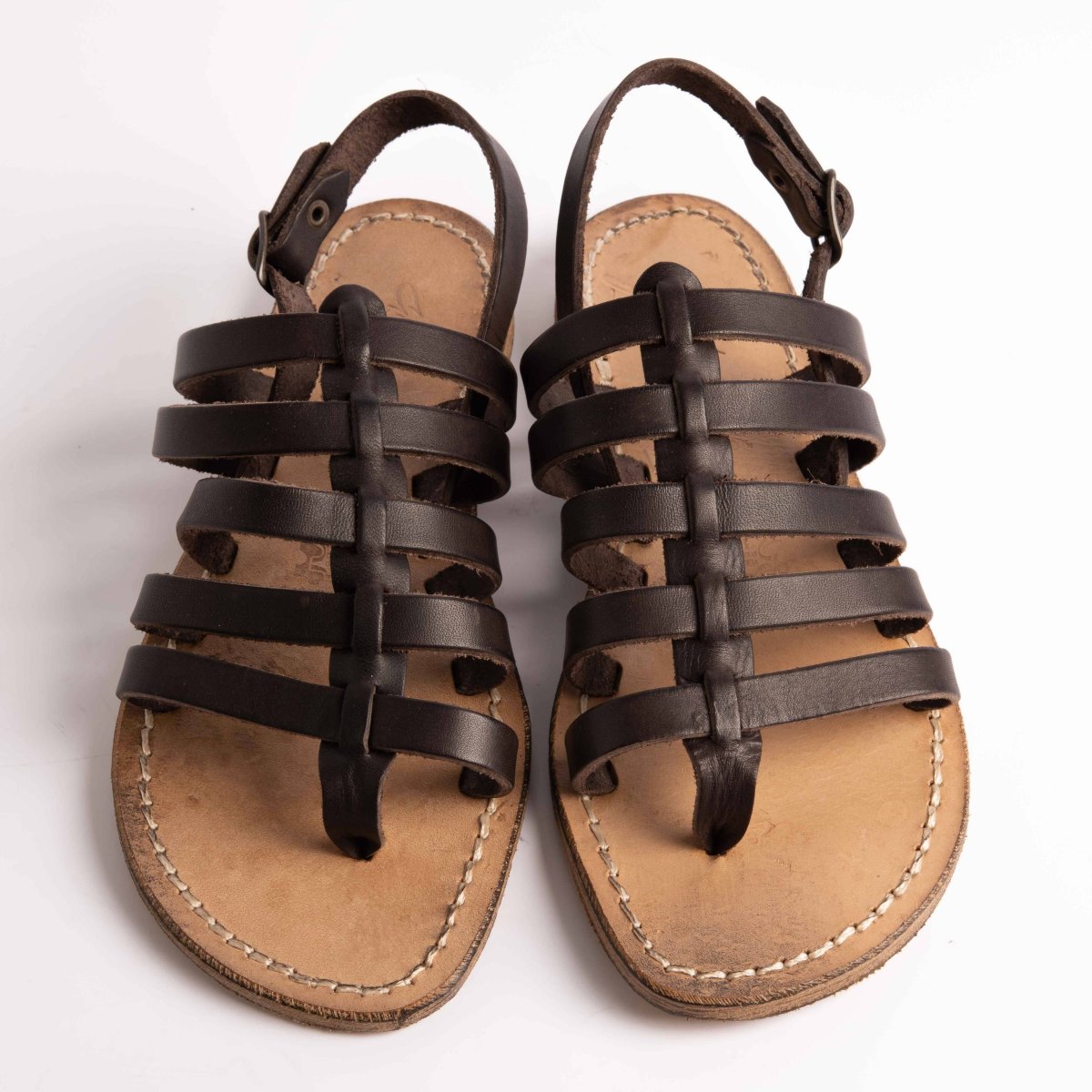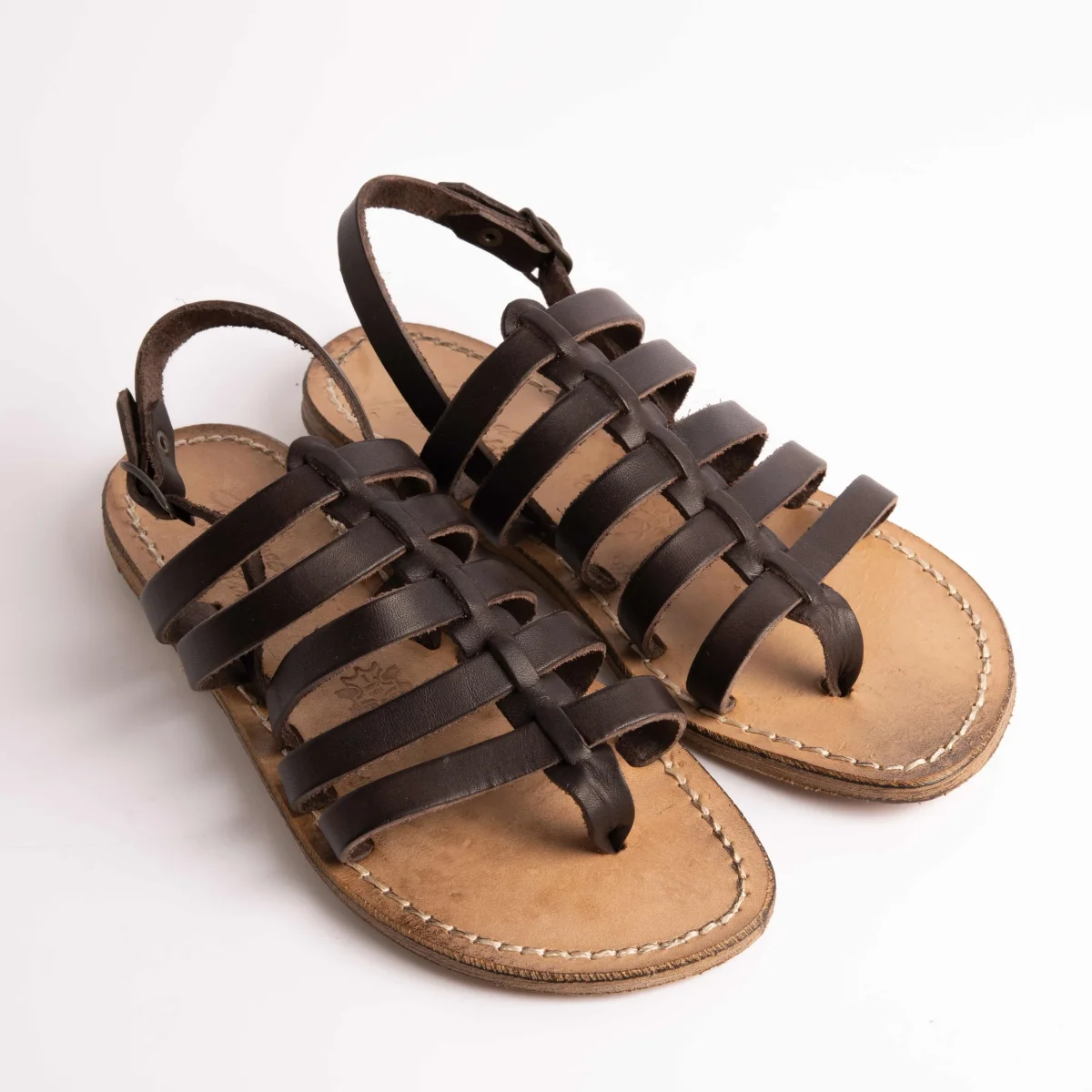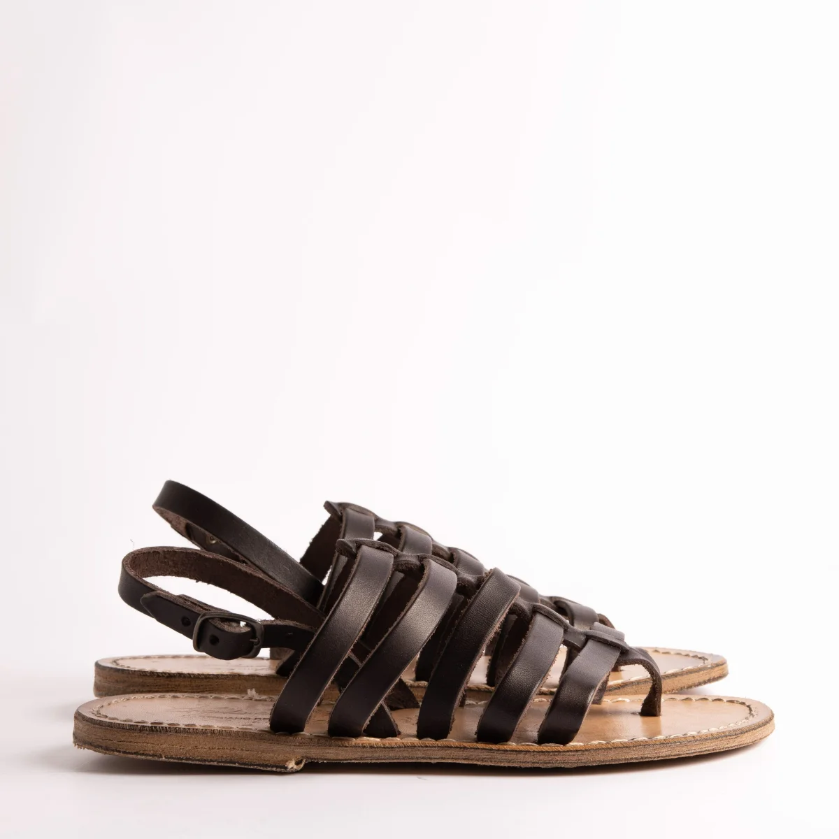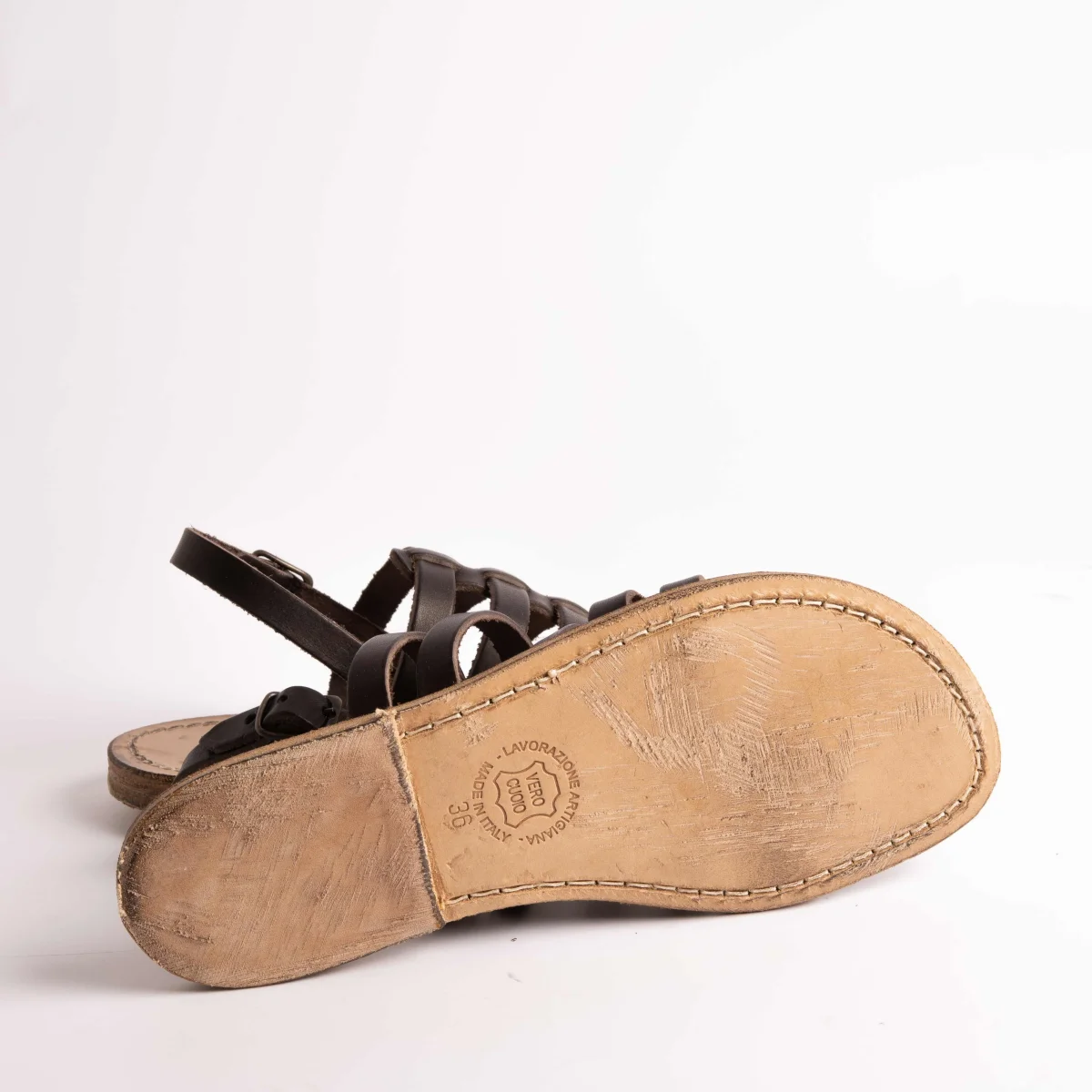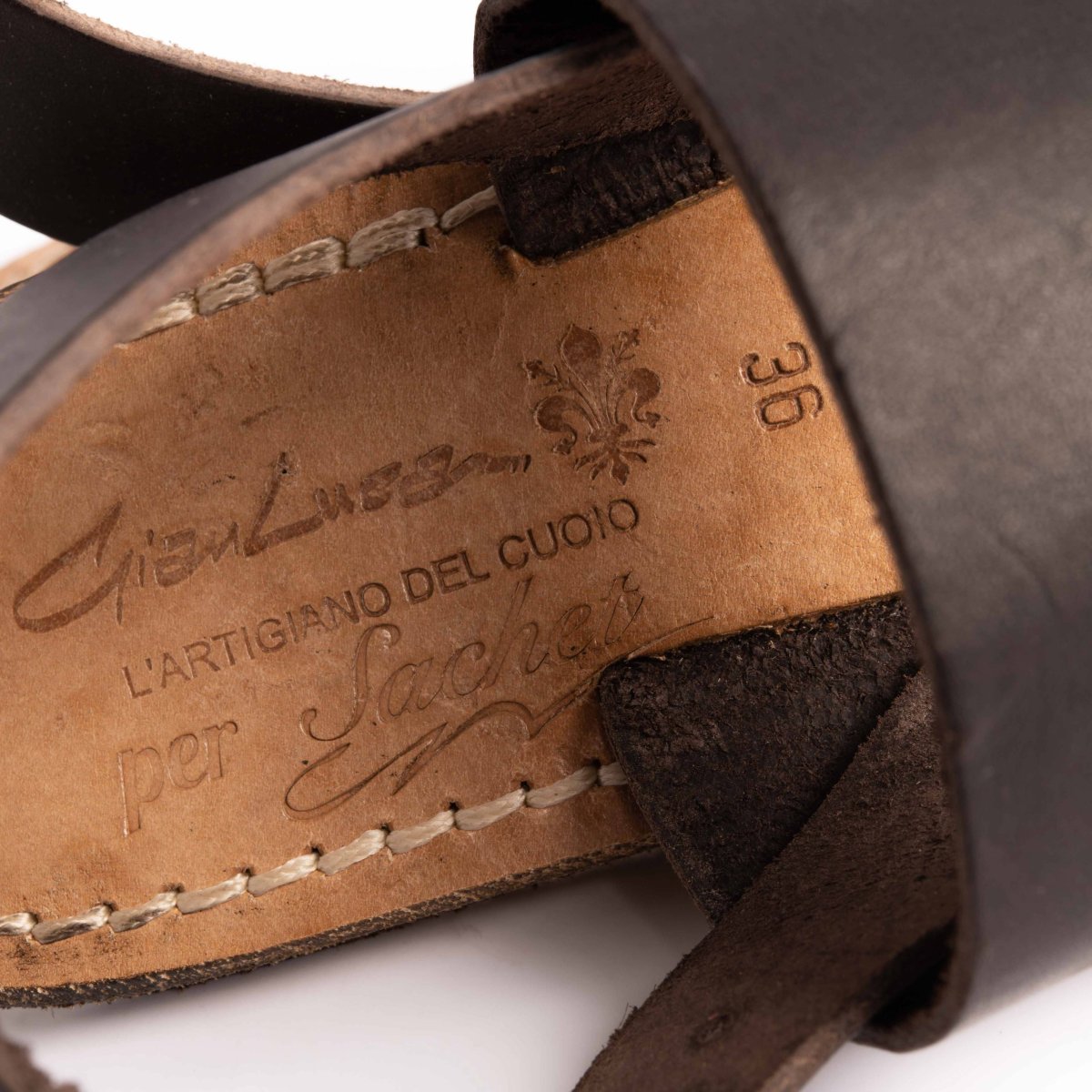 Infradito Sachet in morbida pelle di vitello, tomaia con fascette sottili colore testa di moro, chiusura regolabile alla caviglia. Suola e profili in cuoio fresati ed anticati per un effetto vintage.
