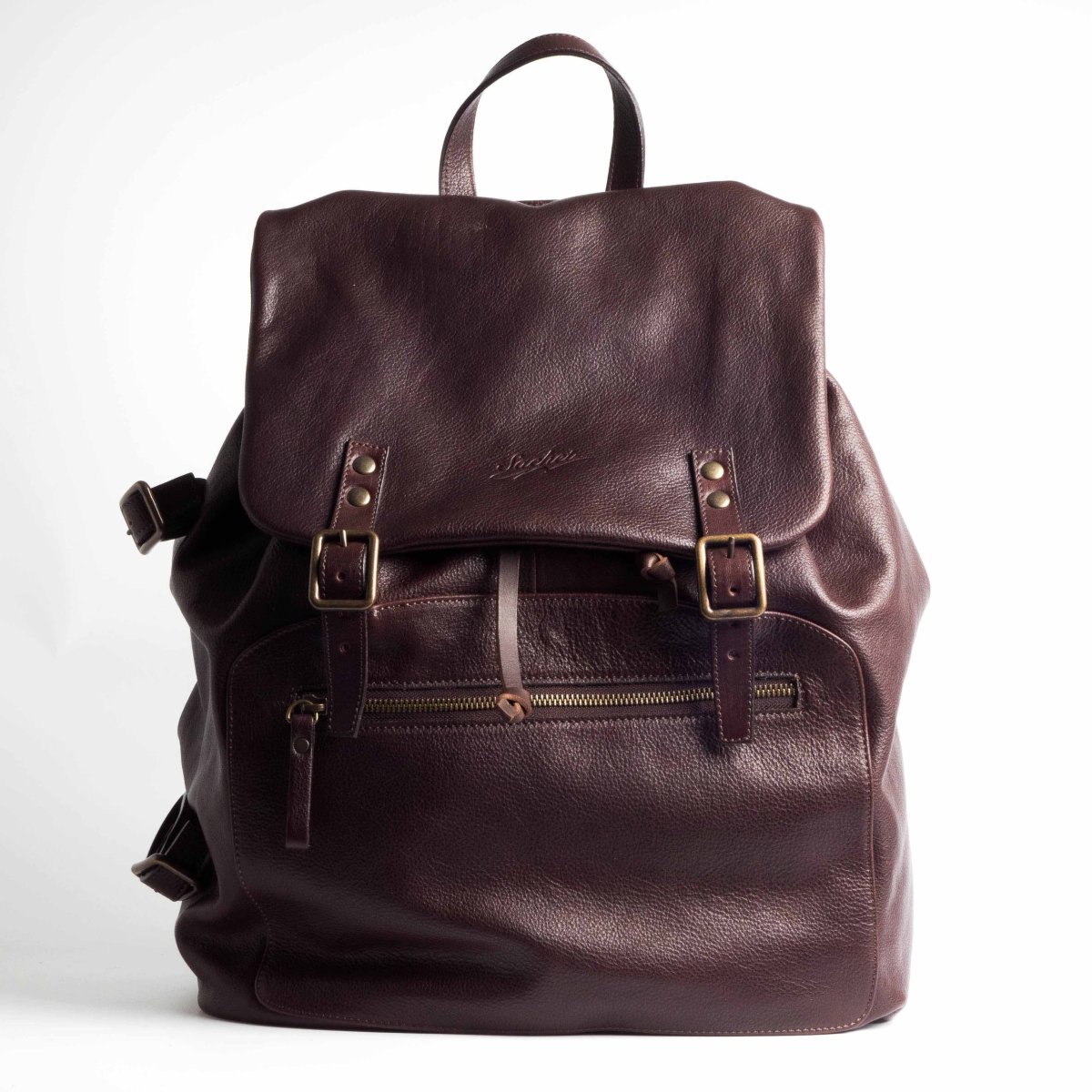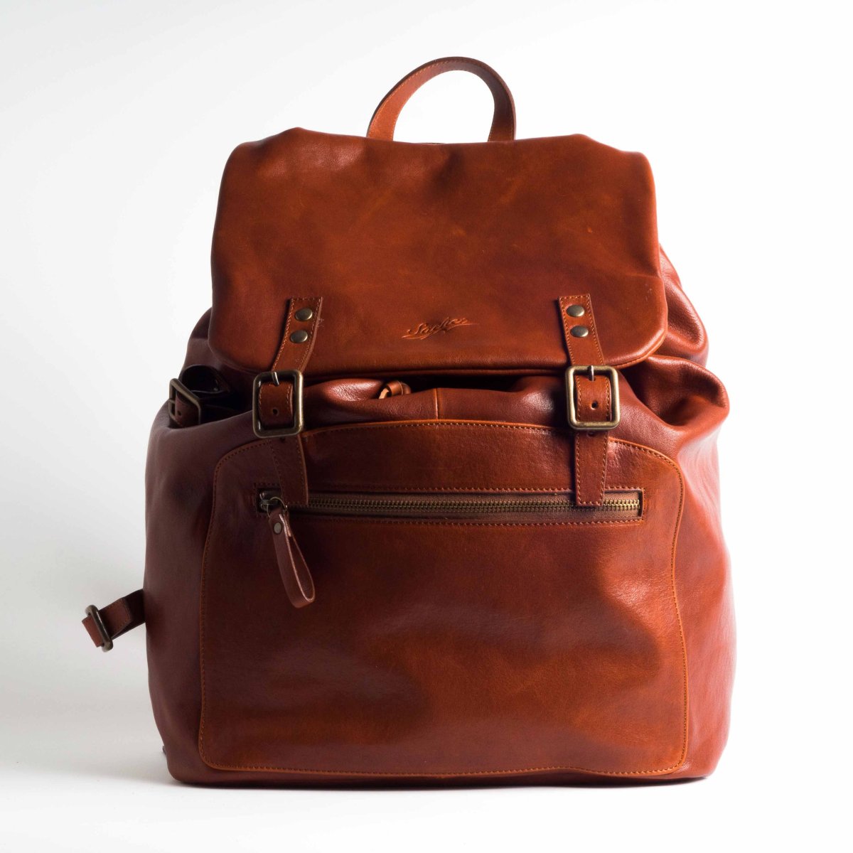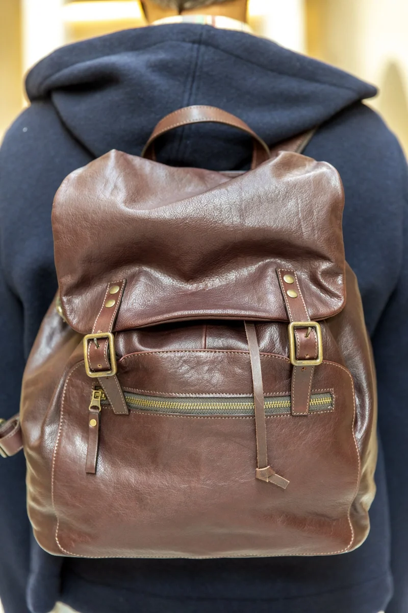 Zaino Sachet in pelle di vacchetta. Chiusura interna con cordini in vacchetta, tasca interna centrale con zip, interno completamente foderato in tessuto. Chiusura esterna con patta con doppia fibbia in metallo di color brunito/oro. Extra tasca frontale con zip, doppi passanti laterali da utilizzarsi come porta ombrello o porta giornale. Bretelle in pelle vacchetta e cotone. Minuteria metallica di color brunito/oro. In dotazione sacca anti-polvere.
