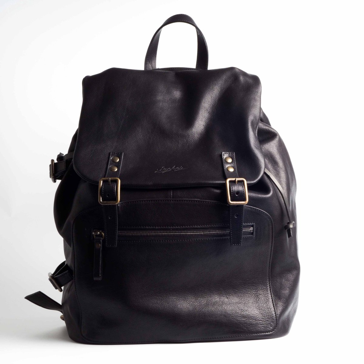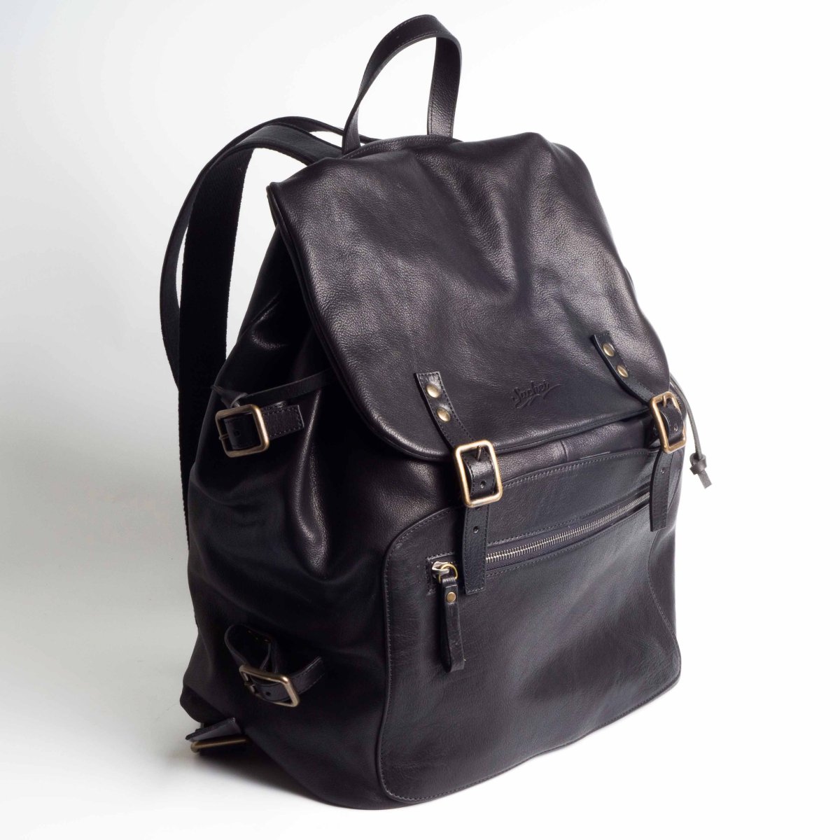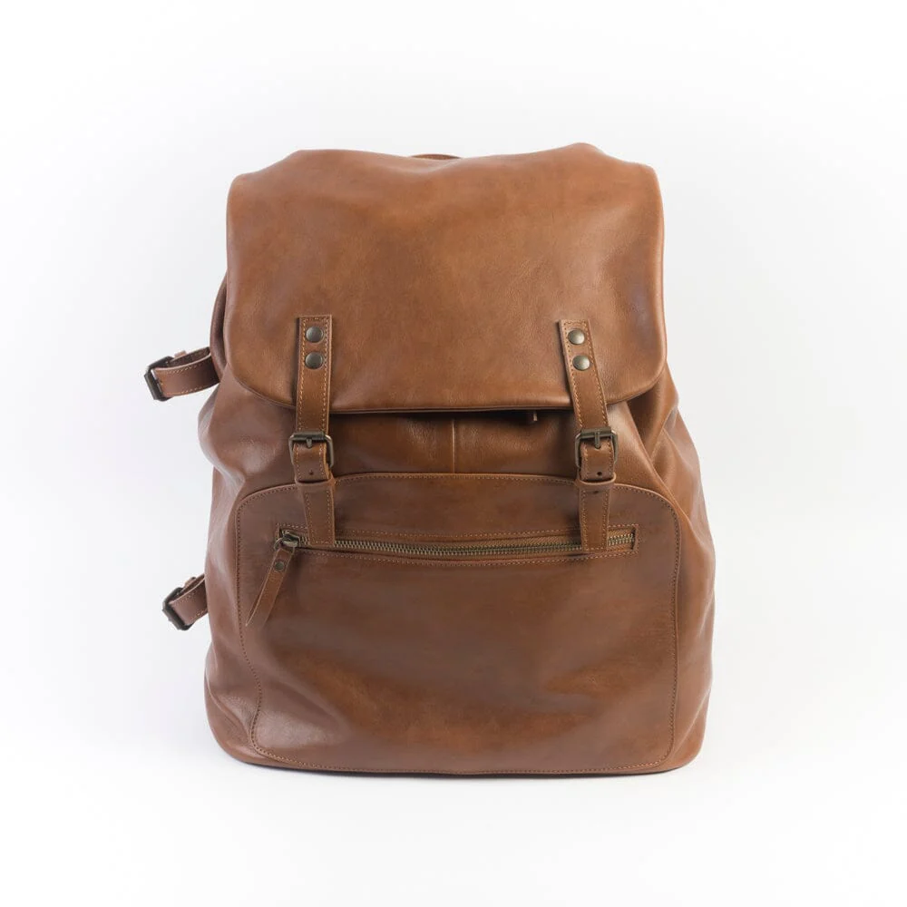 Zaino Sachet in pelle di vacchetta. Chiusura interna con cordini in vacchetta, tasca interna centrale con zip, interno completamente foderato in tessuto. Chiusura esterna con patta con doppia fibbia in metallo di color brunito/oro. Extra tasca frontale con zip, doppi passanti laterali da utilizzarsi come porta ombrello o porta giornale. Bretelle in pelle vacchetta e cotone. Minuteria metallica di color brunito/oro. In dotazione sacca anti-polvere.