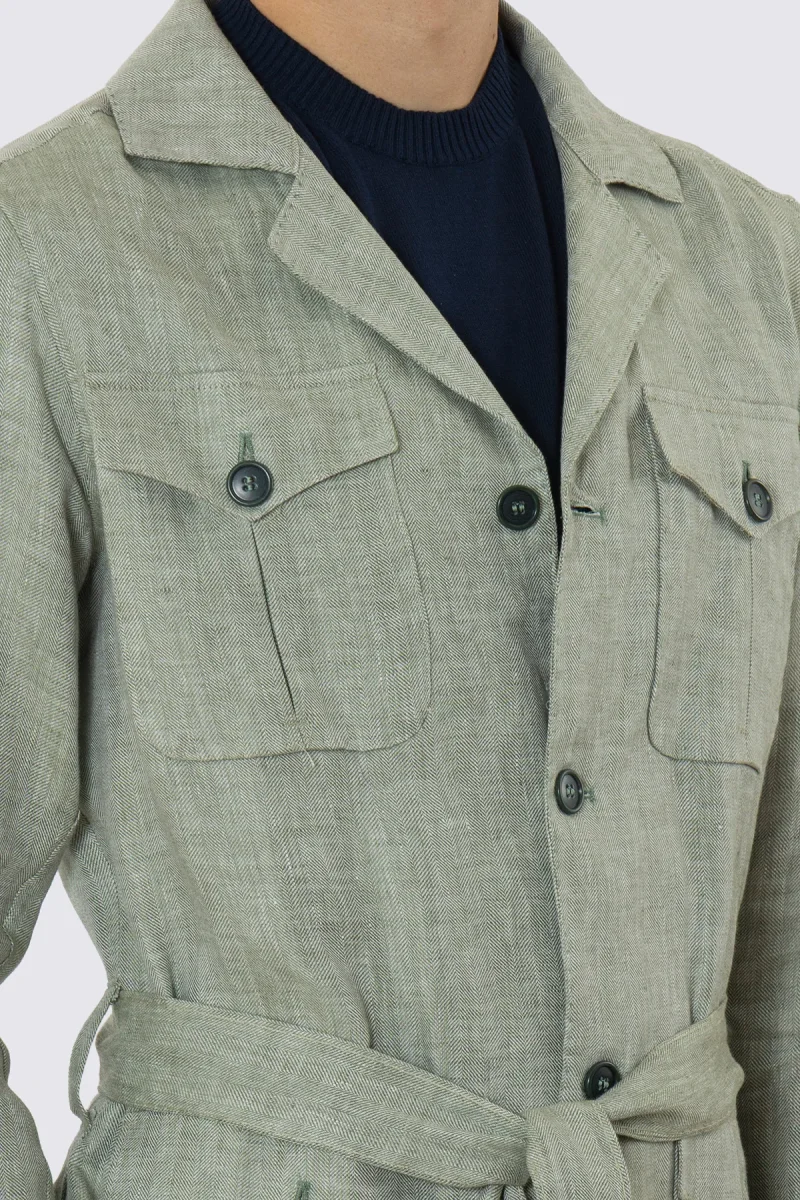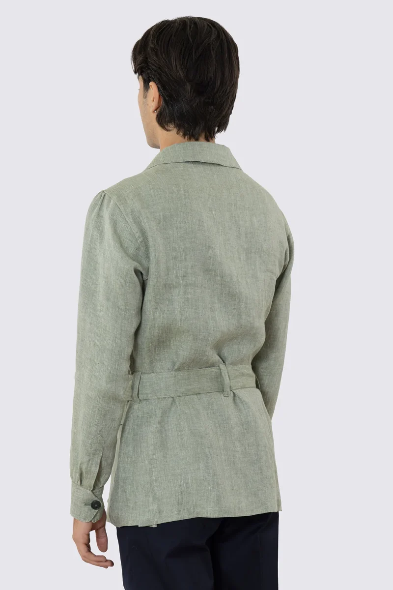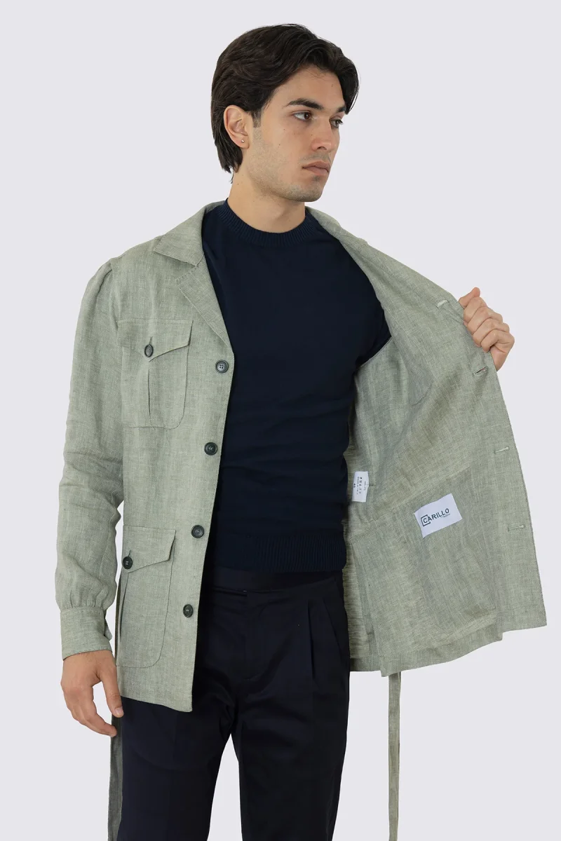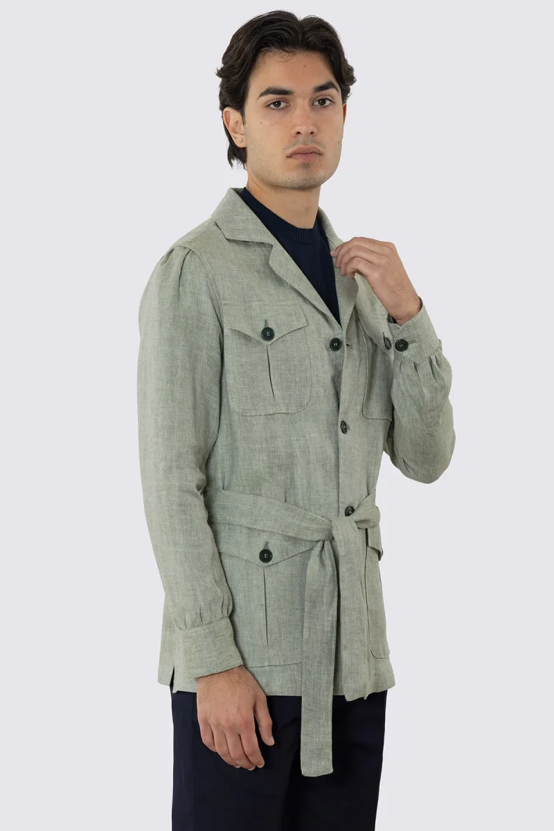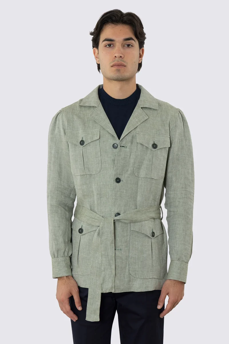 Sahariana verde 100% lino Fordam Tessuti Napoli con tasconi e soffietto cintura in vita e polso camicia