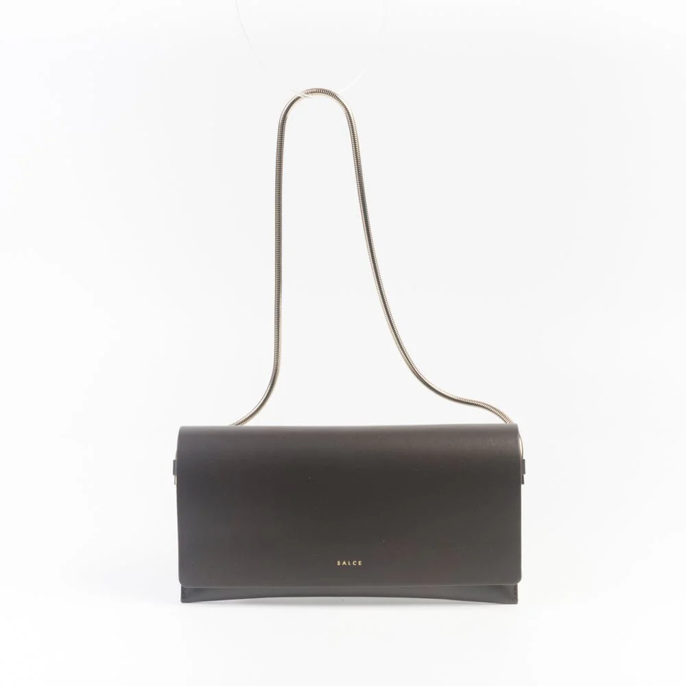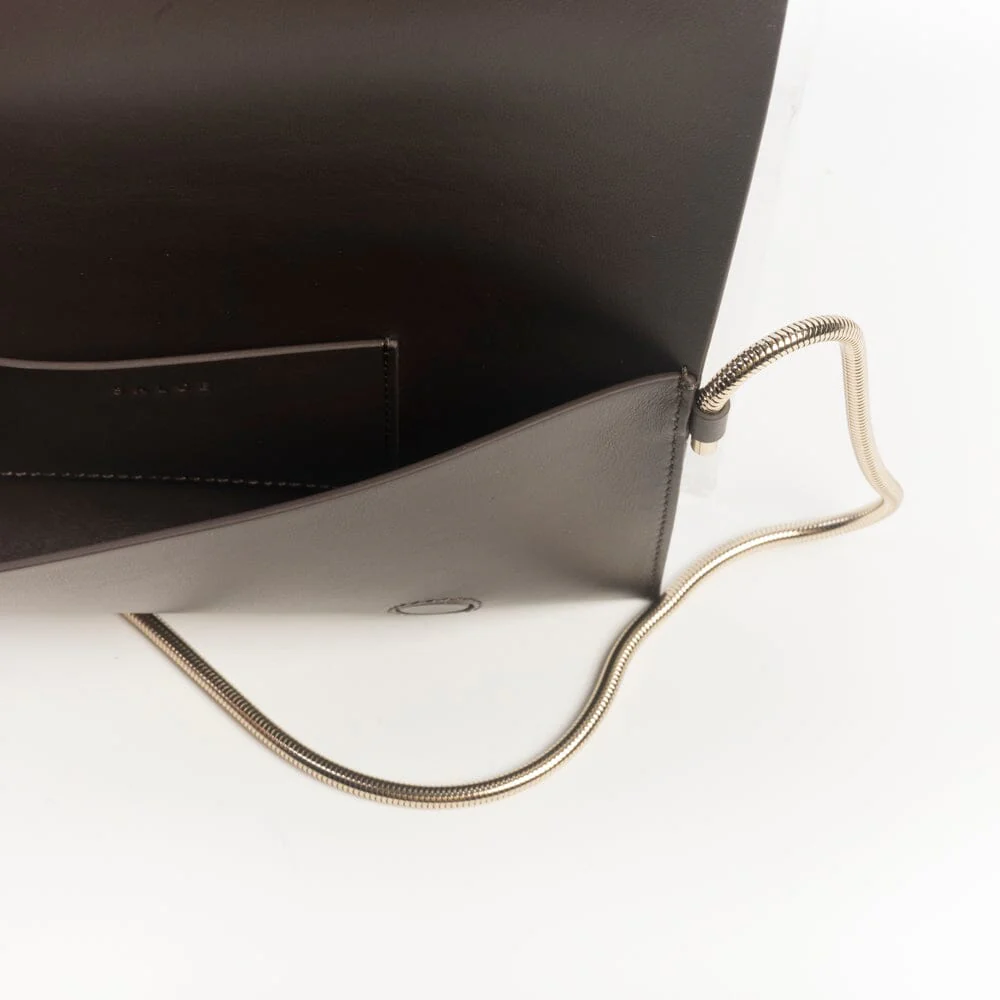 Clutch a mano e a spalla di Salce, realizzata in pelle liscia di colore cioccolato. Unica apertura con patta magnetica. Catena serpentina e logo stampato a caldo di colore oro. Interno sfoderato in nuance.