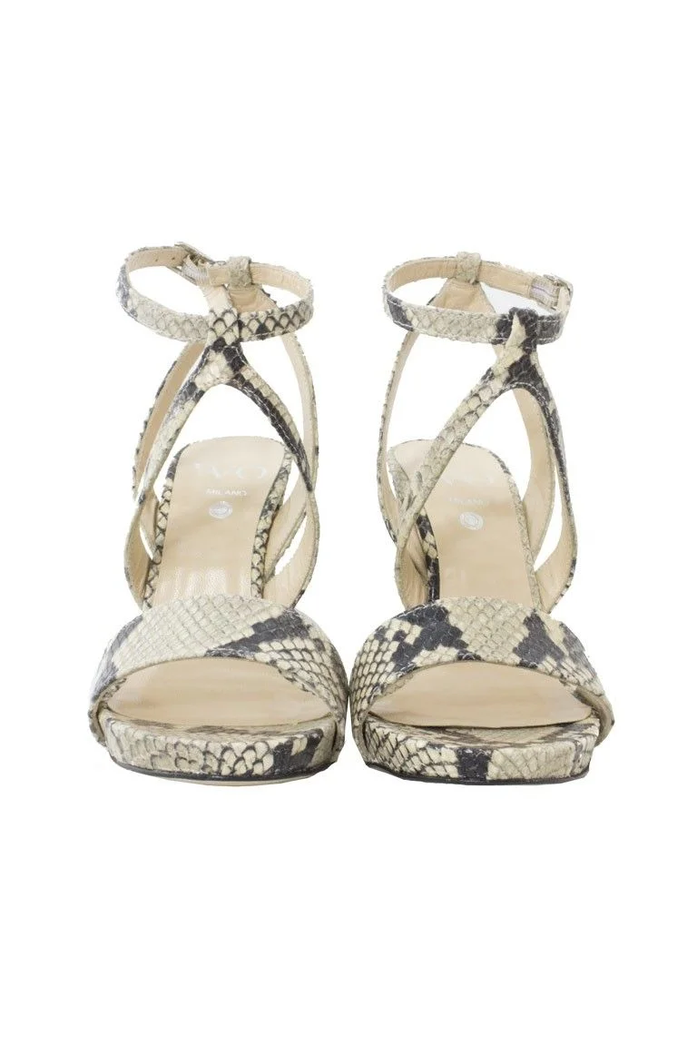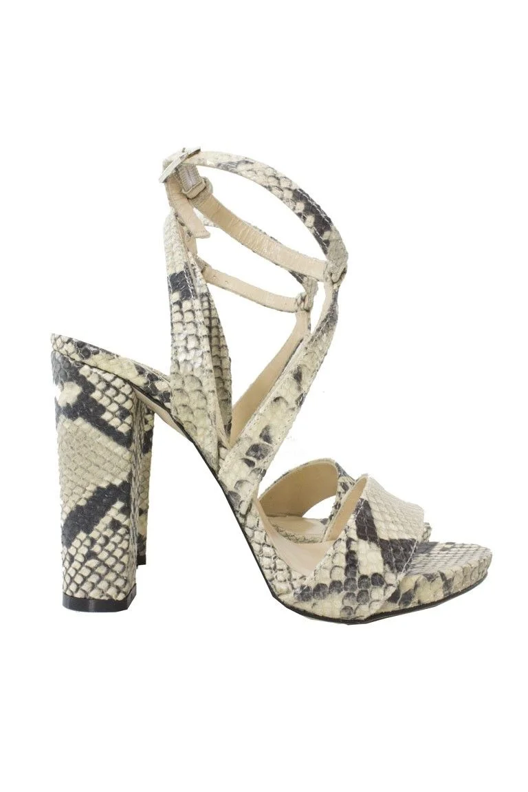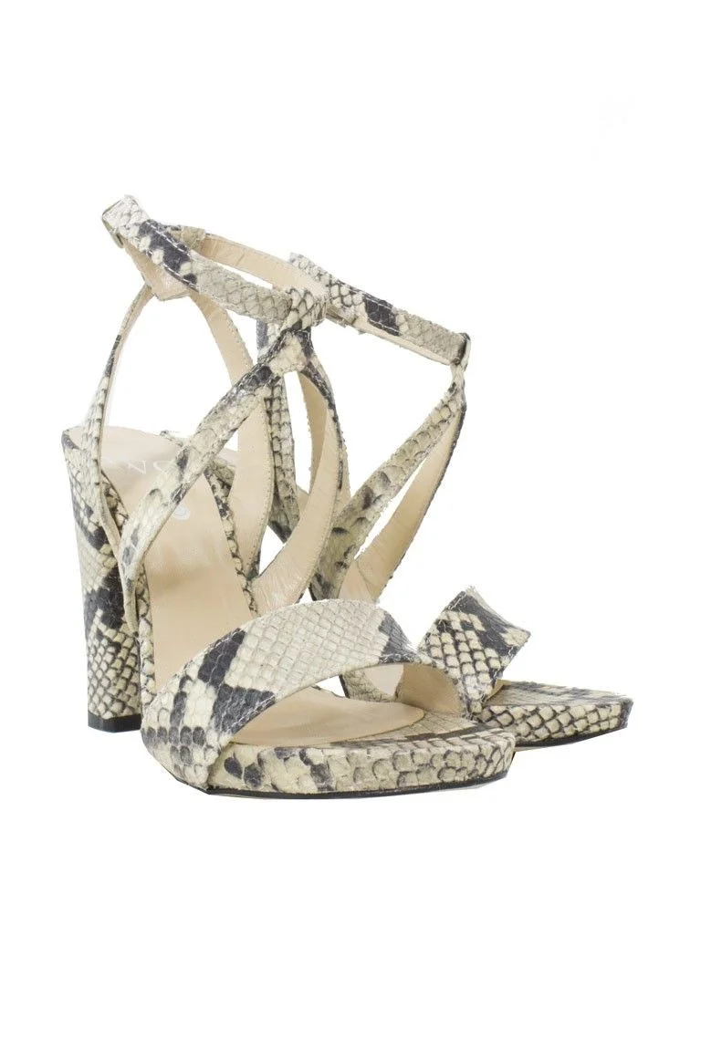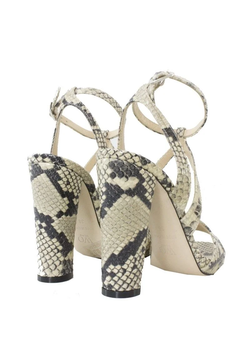 Sandali donna estivi casual in pelle pitonata con tacco a cilindro altezza 12 cm con plateau chiusura con fibbia alla caviglia made in italy.