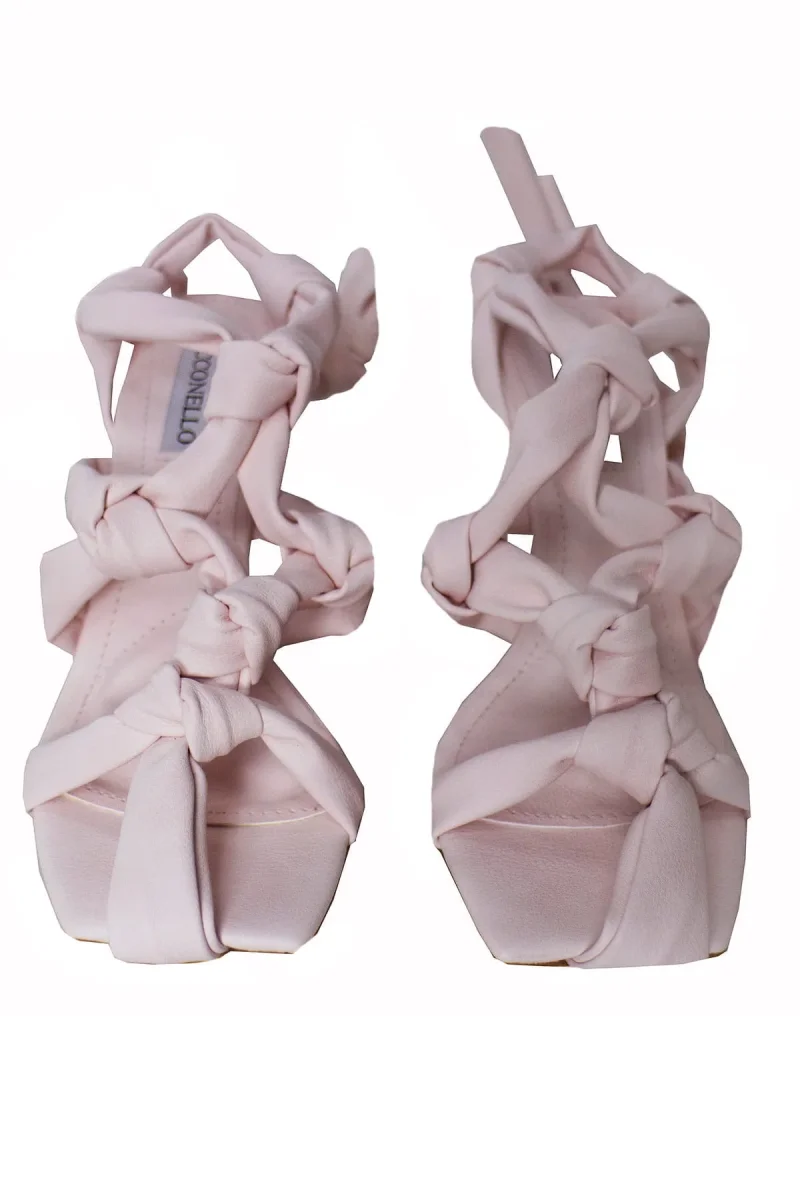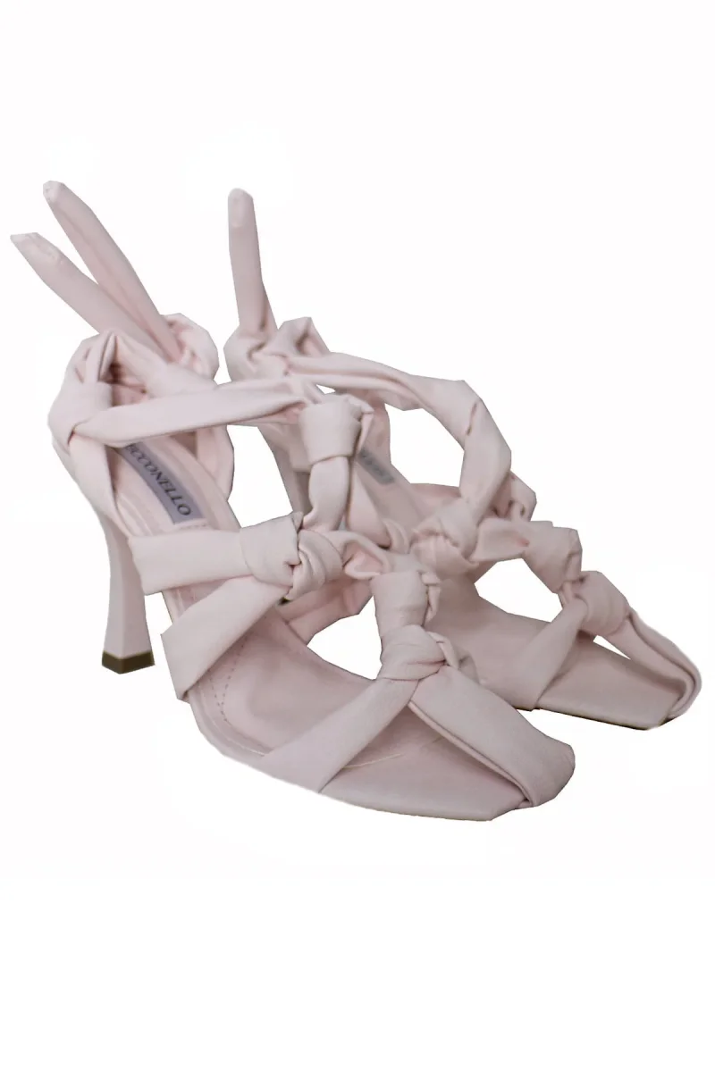 Sandalo donna in pelle nappa fasce motivo nodi allacciati alla caviglia tacco 8cm a spillo svasato