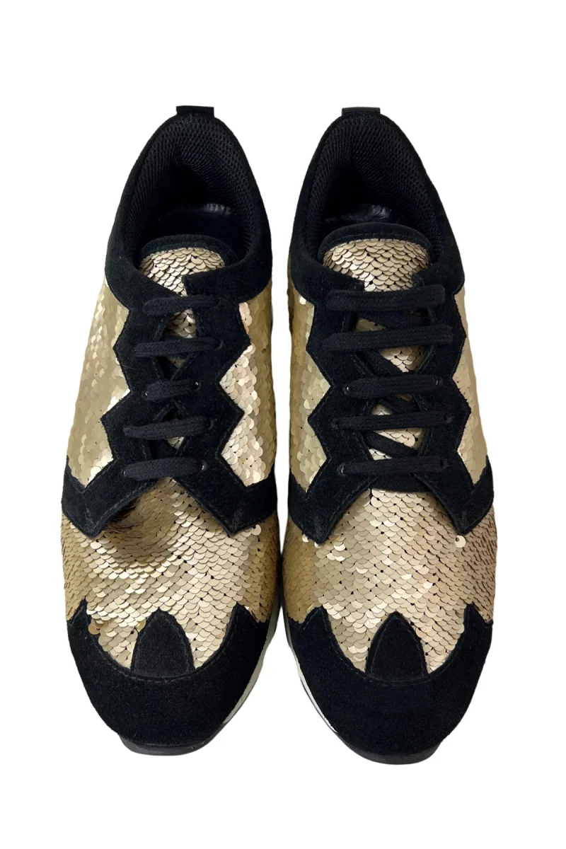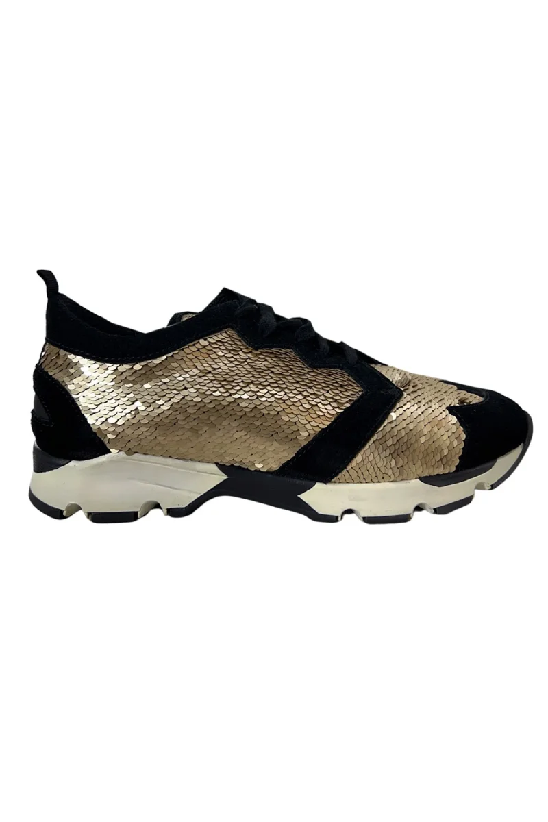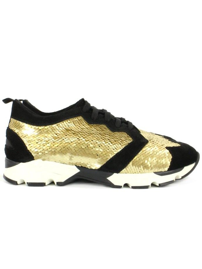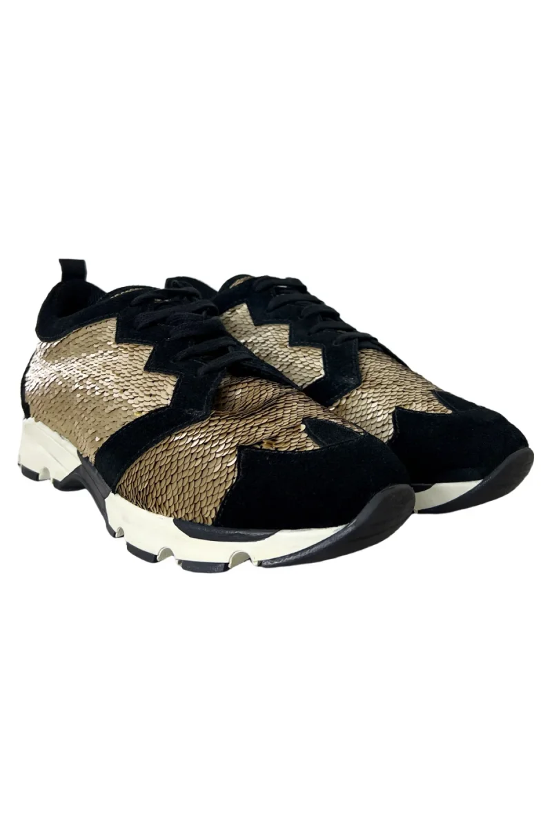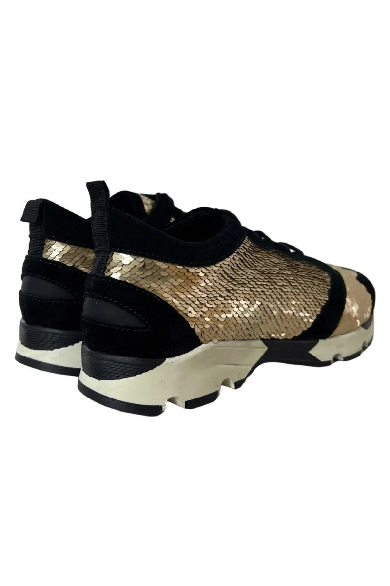 Sneakers paillettes oro e camoscio. Con suola in gomma e lacci neri.