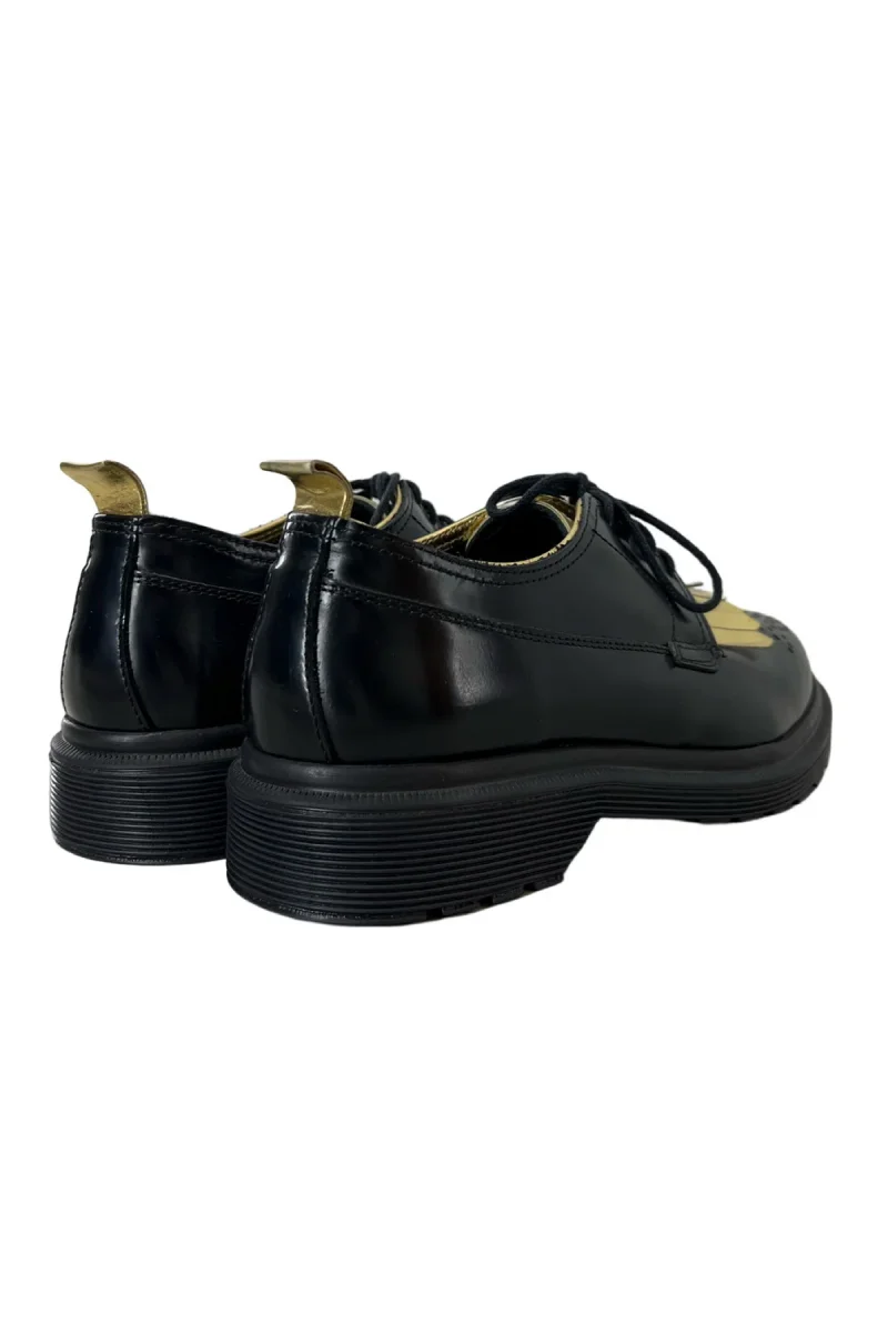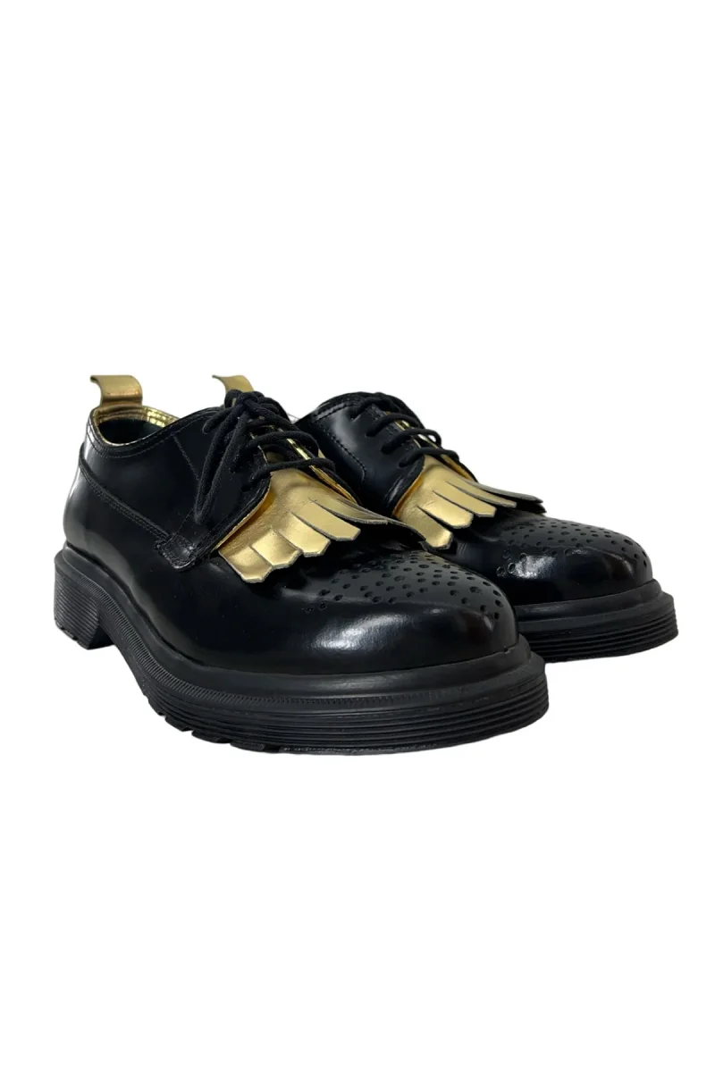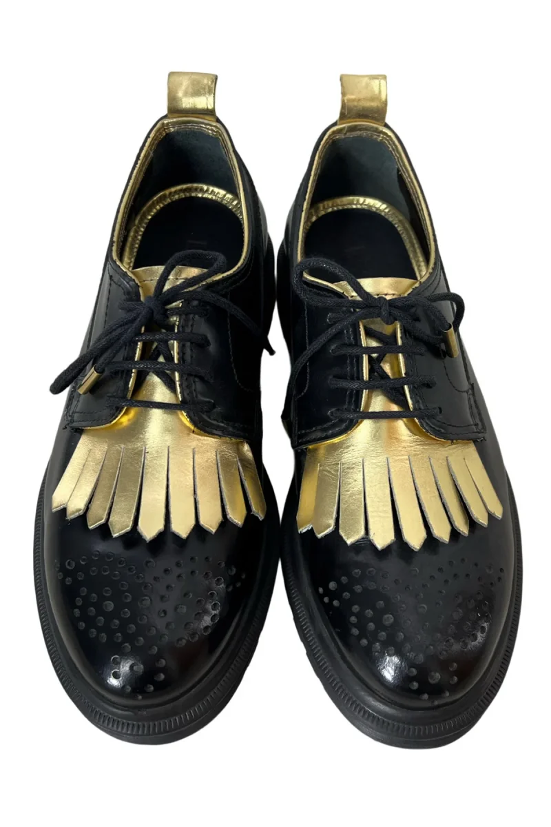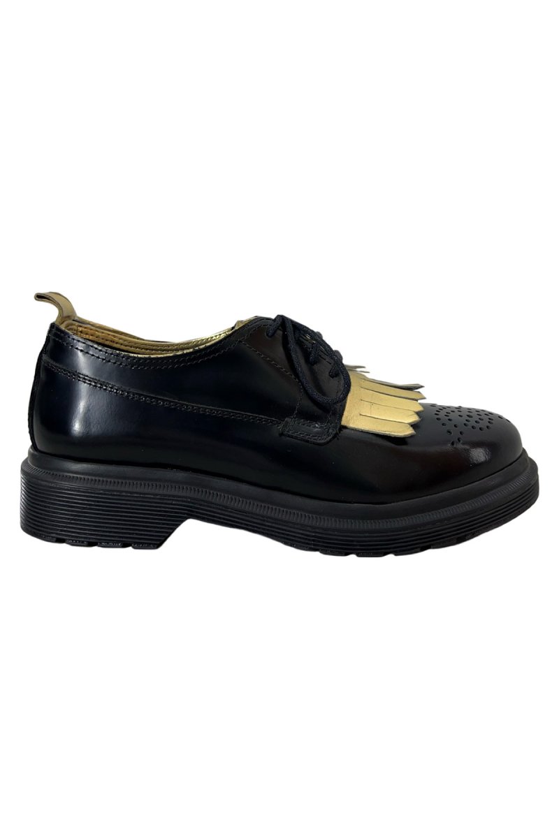 Scarpe in pelle donna, modello stringate stile inglese, con frangia oro e suola in gomma.