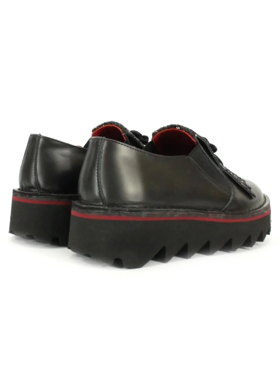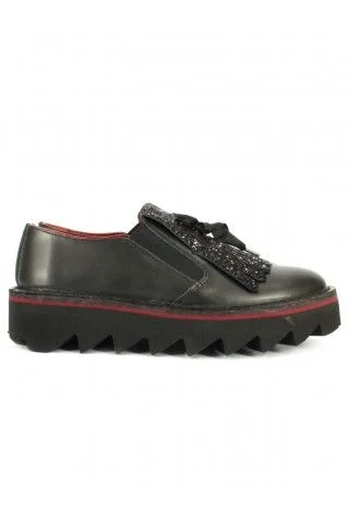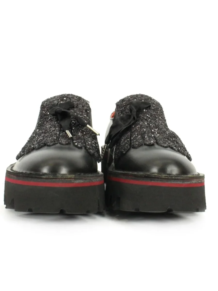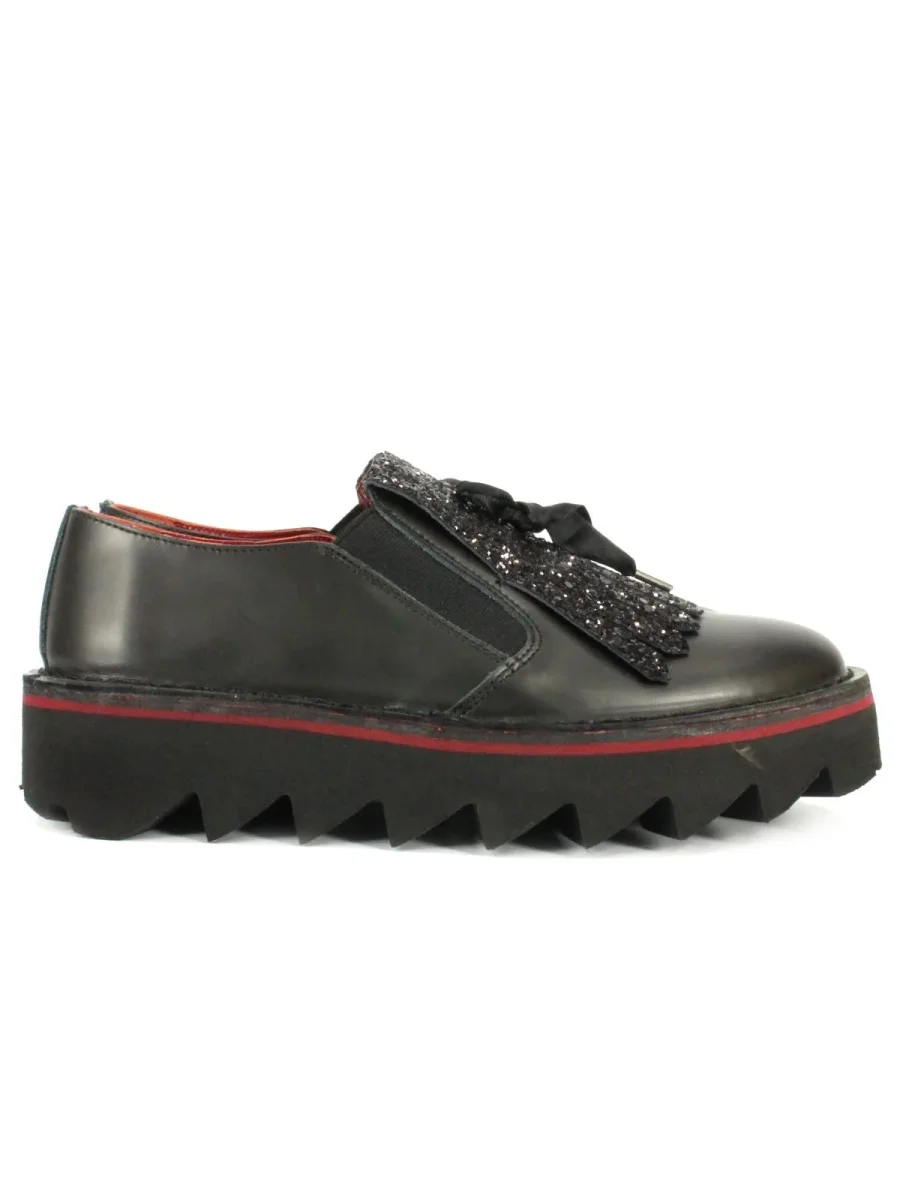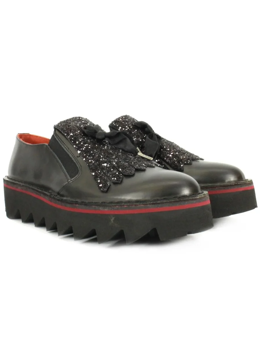 Scarpe in pelle donna, senza lacci, con frangia glitterata e suola alta in gomma.