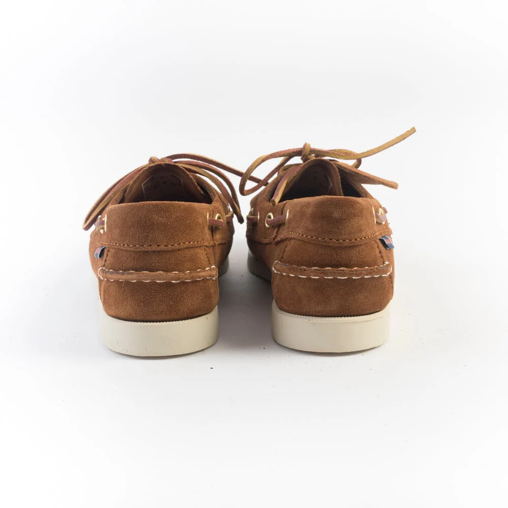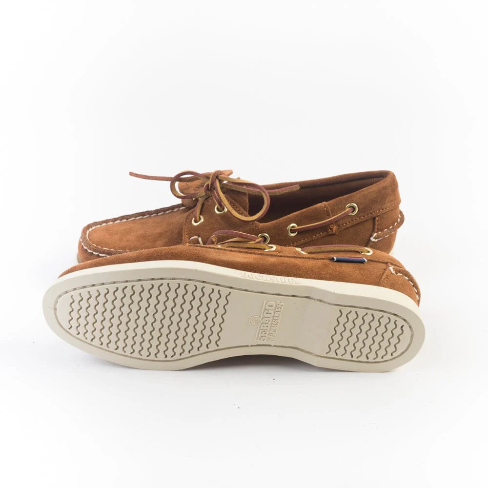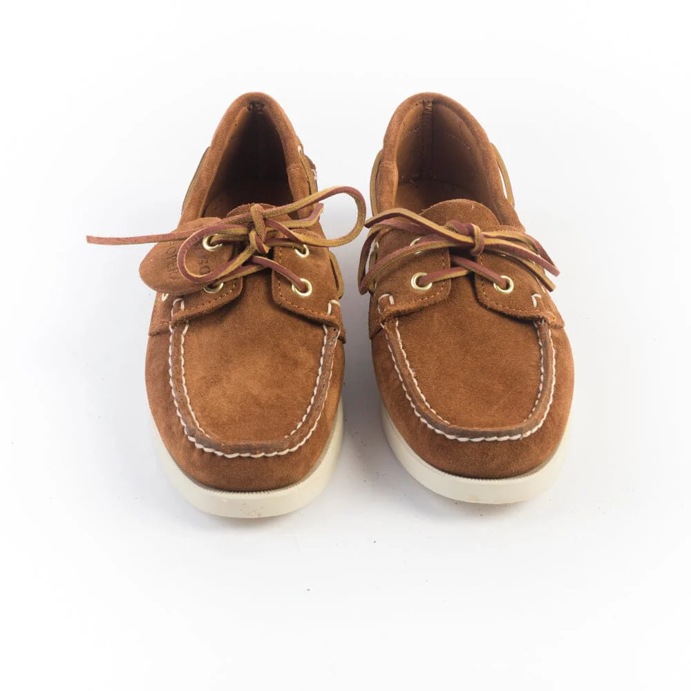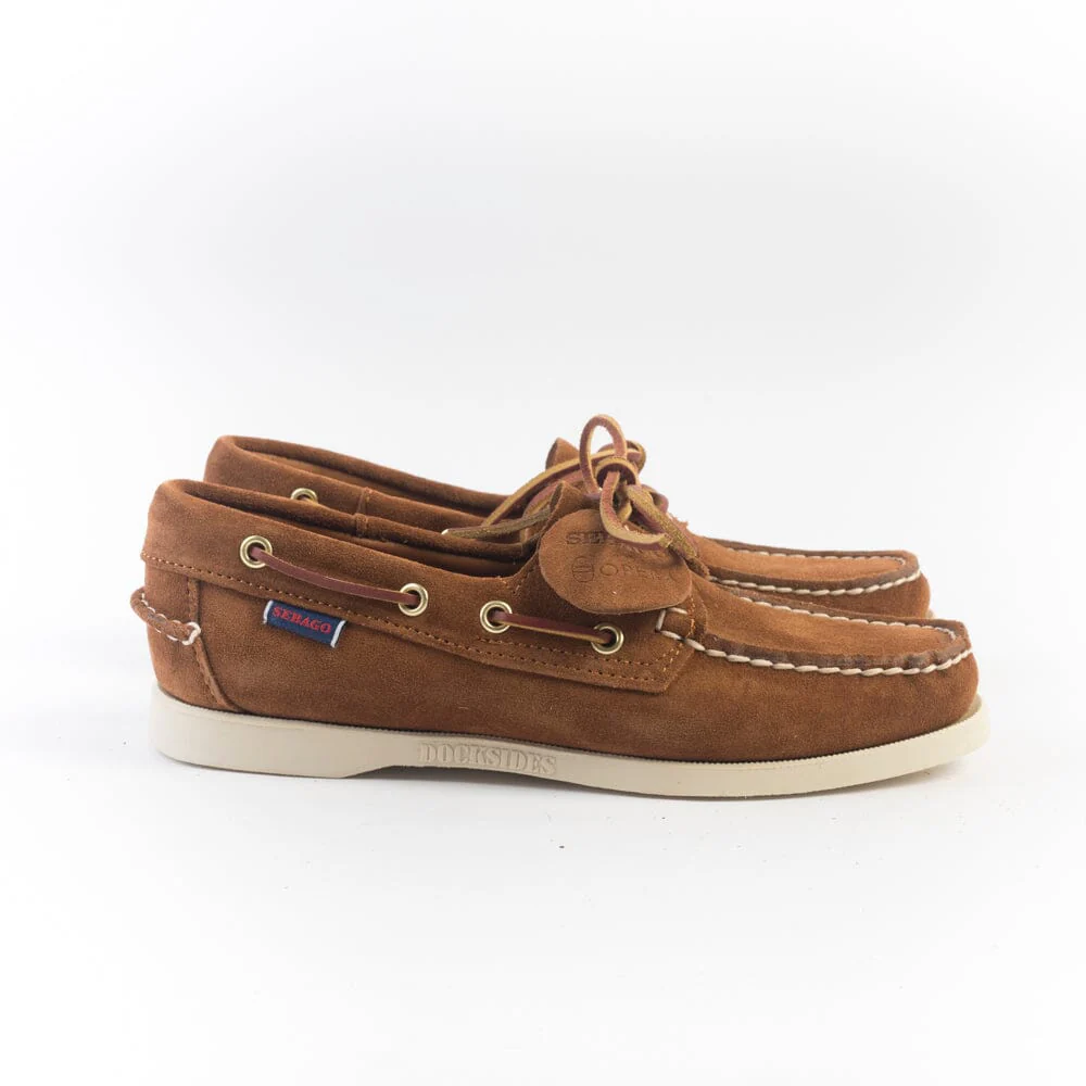 Scarpe da barca Sebago, unico pezzo di pelle e cucita a mano con la migliore lavorazione artigianale, in nabuck di colore castagna. Creata per avere un look esclusivo e durare a lungo, è dotata di soletta in pelle, sistema di allacciatura a 360° in cuoio e suola in gomma striata antiscivolo di colore beige, per offrire una presa stabile in tutte le condizioni atmosferiche. I mocassini “Portland” hanno nel loro stesso DNA un legame e un affetto innato verso la città di Portland, uno dei più grandi porti marittimi del New England, e sede del famoso Yachting Club omonimo.