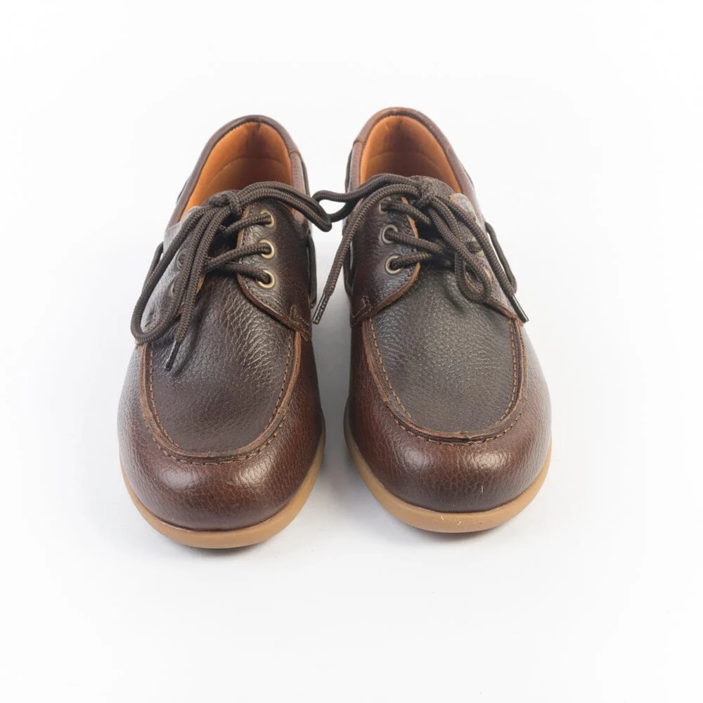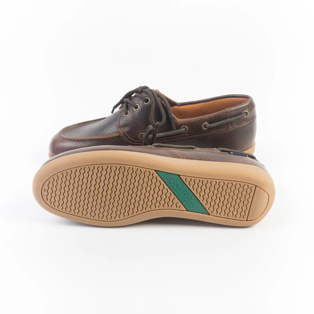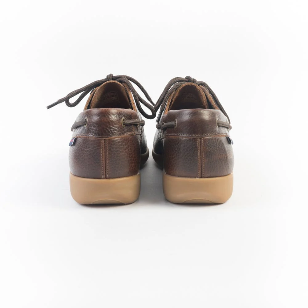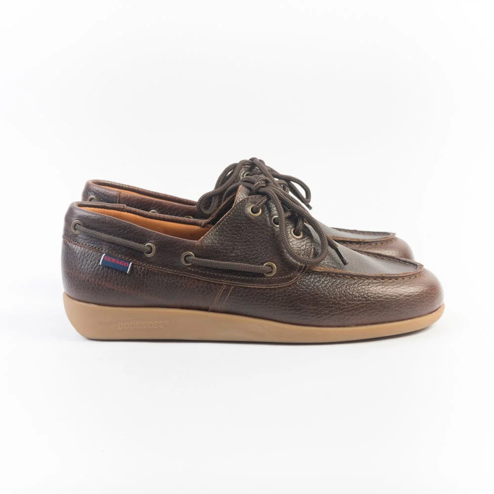 Scarpa da barca Sebago ispirata alla più grande leggenda vivente della vela americana: Gary Jobson. Realizzata in pelle pieno fiore e cucita a mano con la migliore lavorazione artigianale, di colore testa di moro effetto vintage e martellato. Tre fori, lacci in corda in nuance. Progettata per la vita all’aria aperta. Suola in gomma naturale.