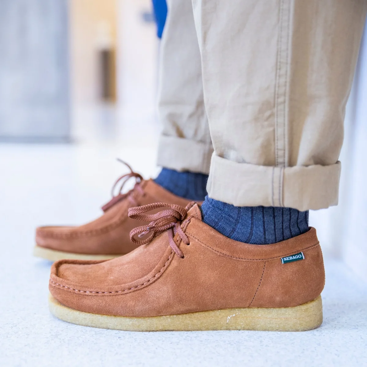 Iconica scarpa Koala di Sebago dalle linee pulite e semplici, cucita a mano. Realizzata in morbida pelle scamosciata di colore cognac, struttura tubolare lacci di cotone in nuance. Internamente foderata in pelle e suola in para di 2 centimetri.