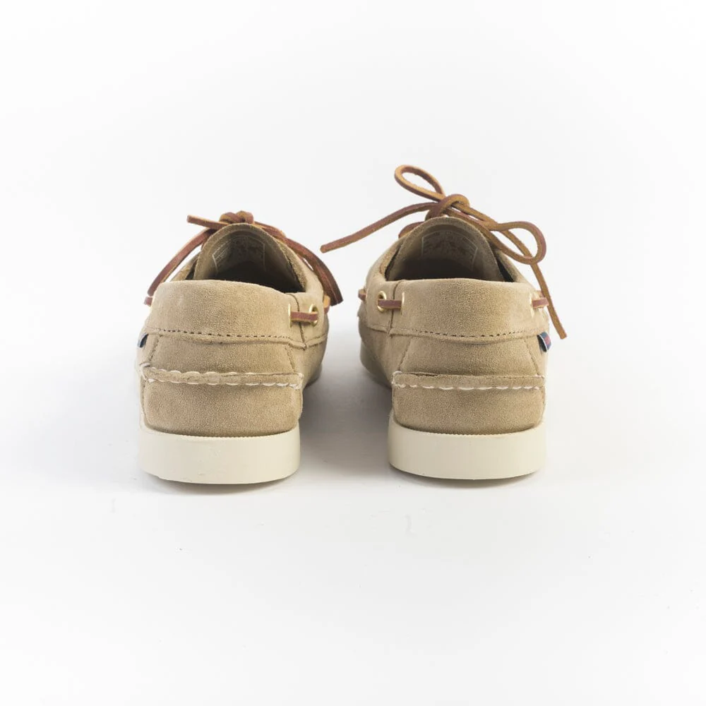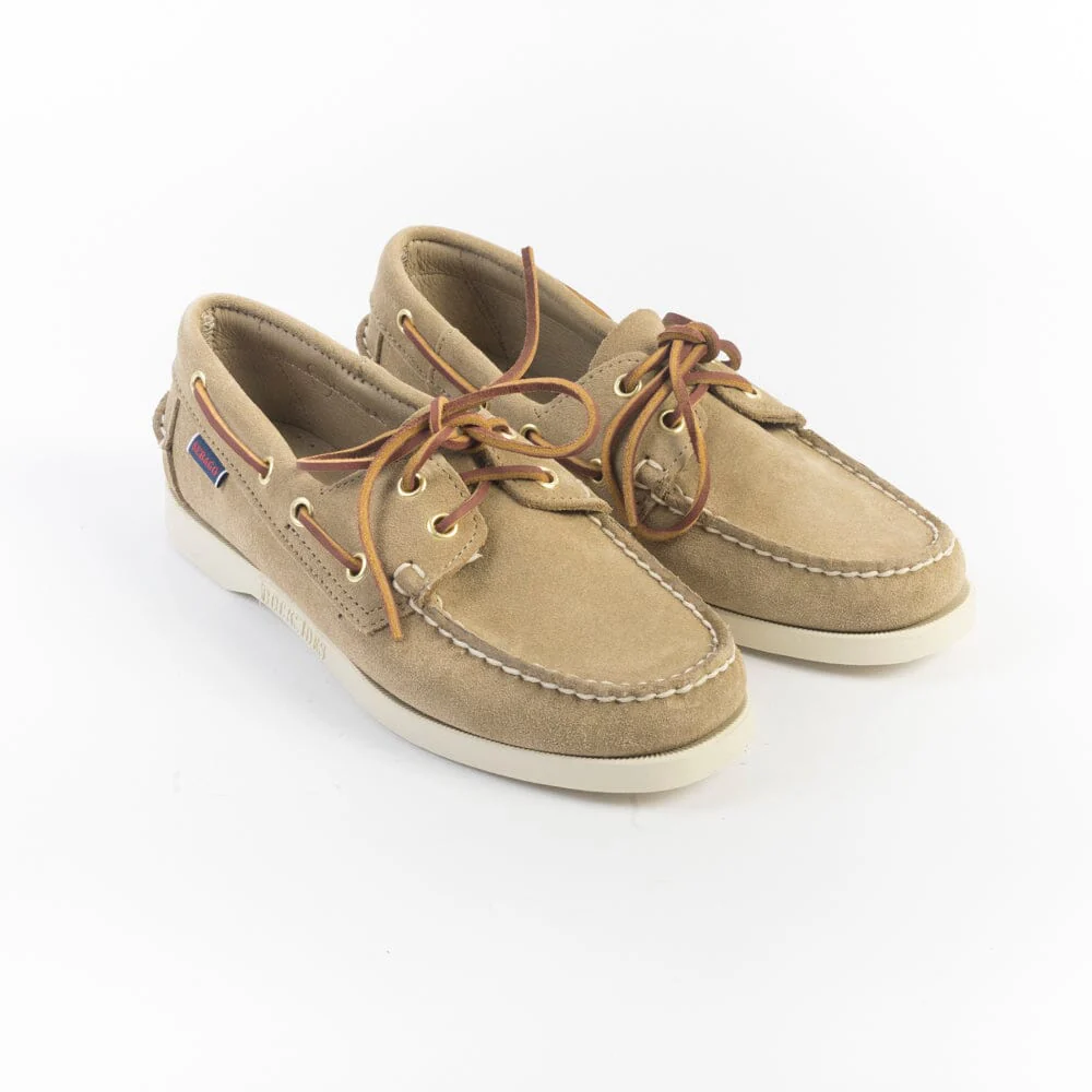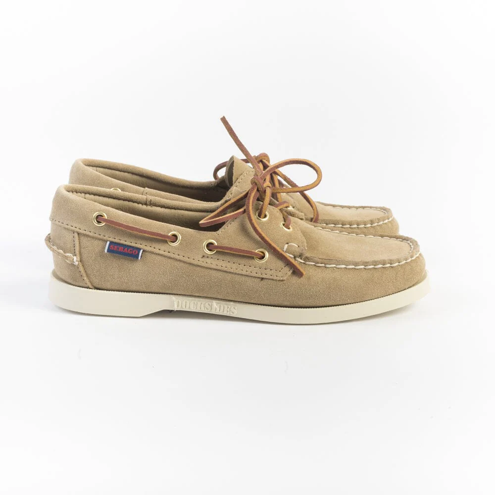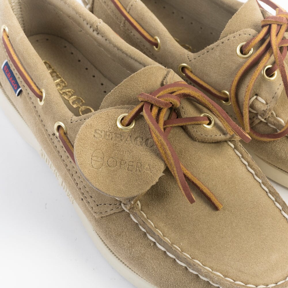 Scarpa da barca Sebago, facente parte della collezione OPERA. In particolare, la collezione viene creata utilizzando la parte più pregiata e morbida del pellame; inizialmente conciata al vegetale e successivamente conciata al cromo per donare alla calzatura una morbidezza senza precedenti. La scarpa è cucita a mano con la migliore lavorazione artigianale in pelle rovesciata di colore sabbia. Creata per avere un look esclusivo e durare a lungo, è dotata di soletta in pelle, sistema di allacciatura a 360° in camoscio in nuance e suola non- marking in gomma striata antiscivolo, per offrire una presa stabile in tutte le condizioni atmosferiche.