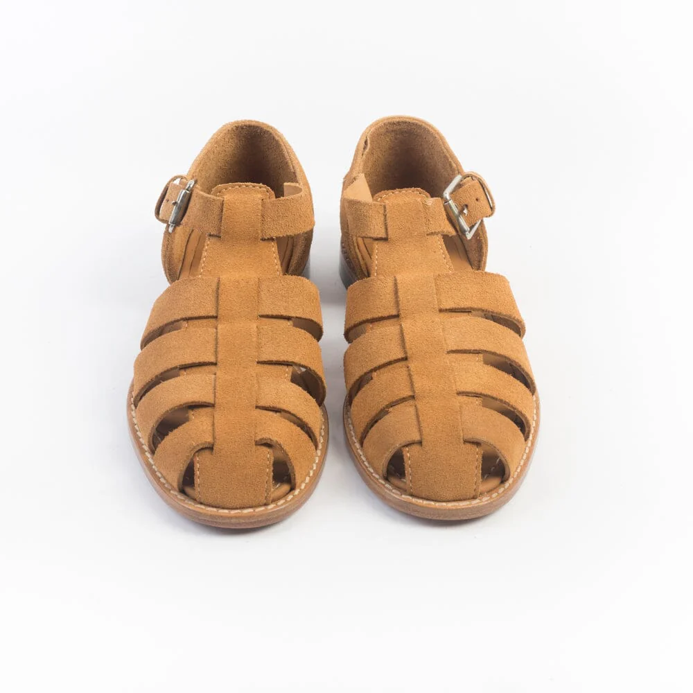 Sandalo di Sebago con tomaia a ragnetto realizzate in camoscio di colore cuioio. Morbido sottopiede imbottito in pelle in nuance. Suola in cuoio e tacco gomma.