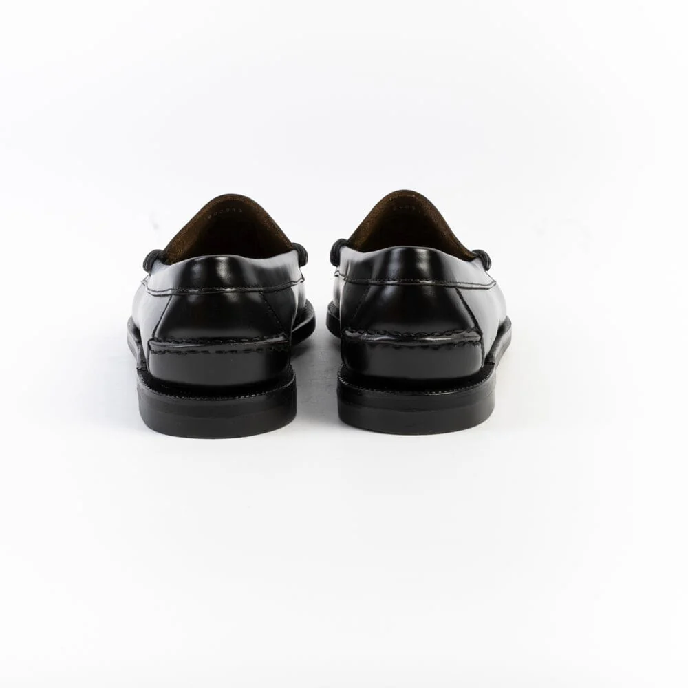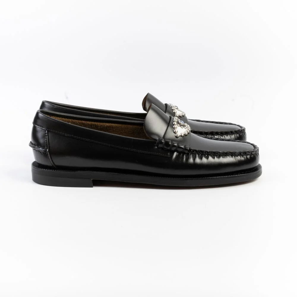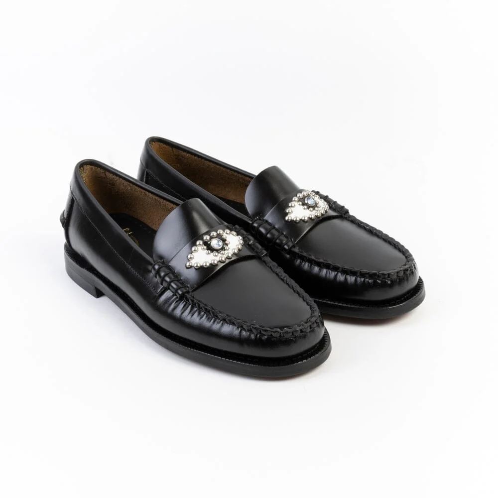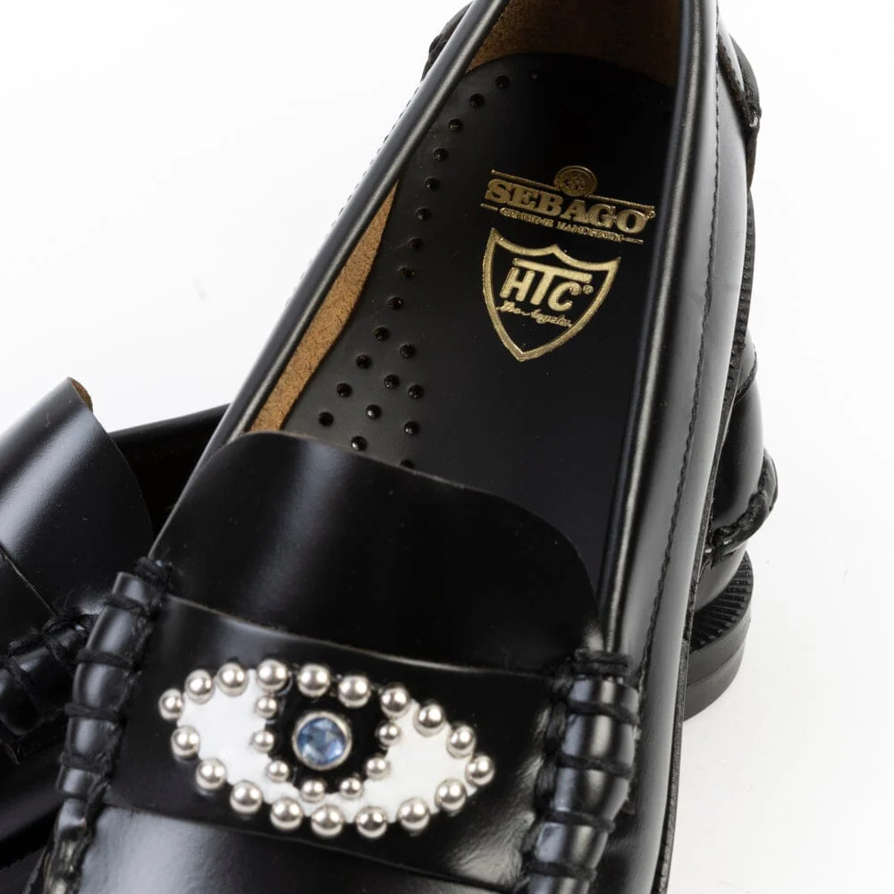Mocassino Sebago, edizione realizzata in collaborazione con HTC, realizzato in pelle pieno fiore spazzolata liscia per durare nel tempo e cucito a mano con la migliore lavorazione artigianale, dettaglio distintivo su mascherina con borchie a forma di occhio. Questo penny loafer è un mocassino 4 stagioni con tomaia in pelle sfoderata, tacco modellato in gomma e suola in cuoio trattato per offrire resistenza, flessibilità e impermeabilità. I mocassini “Dan” sono un omaggio alla passione dei fondatori del marchio Sebago.