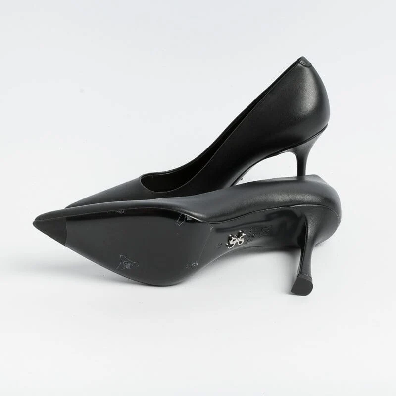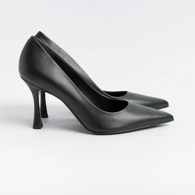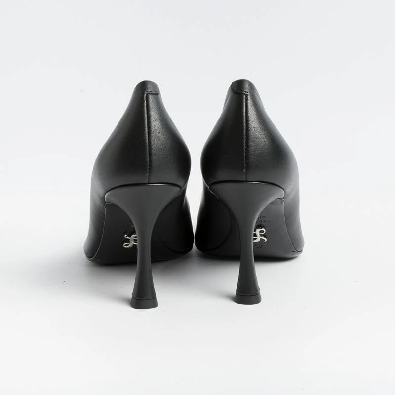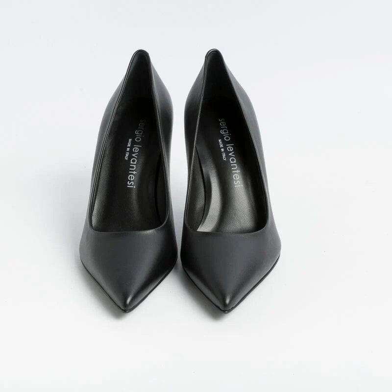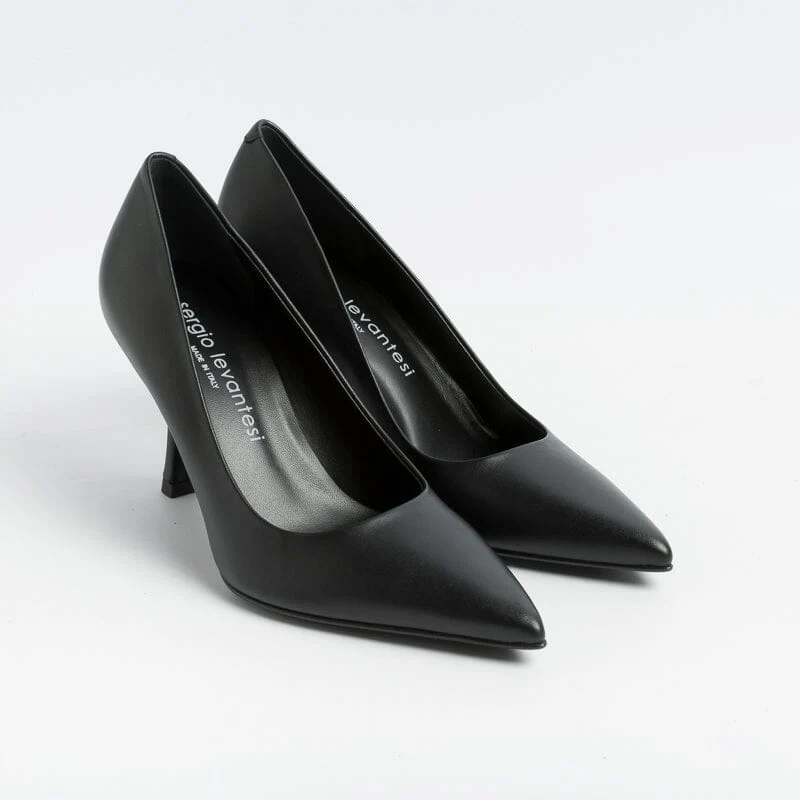 Elegante décolleté a punta di Sergio Levantesi realizzato in pelle di vitello di colore nero. Interno e sottopiede in pelle in nuance. Tacco rocchetto rivestito di 9 cm circa . Suola in cuoio.