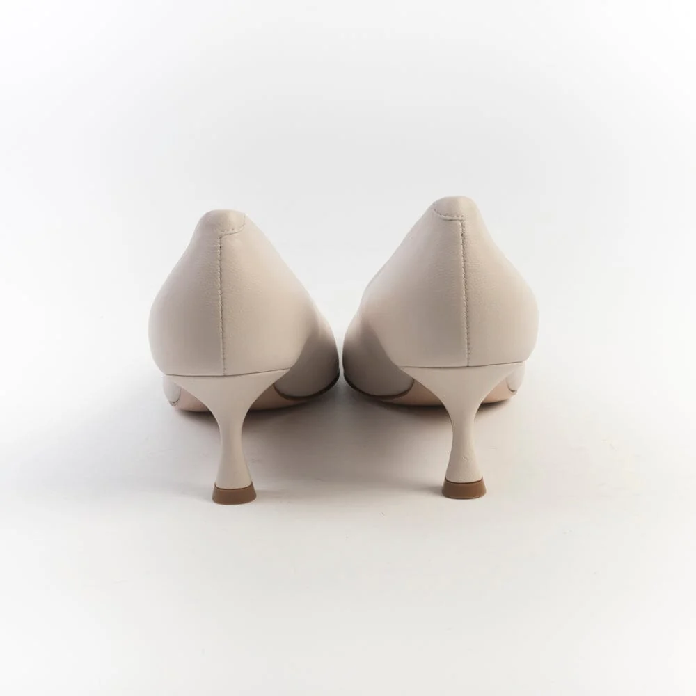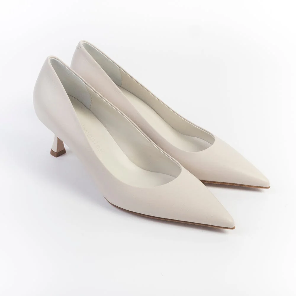 Décolleté di Sergio Levantesi realizzate in morbida pelle di vitello di colore avorio. Interno e sottopiede in pelle. Tacco rocchetto 6 cm. Suola in cuoio con inserto in gomma.