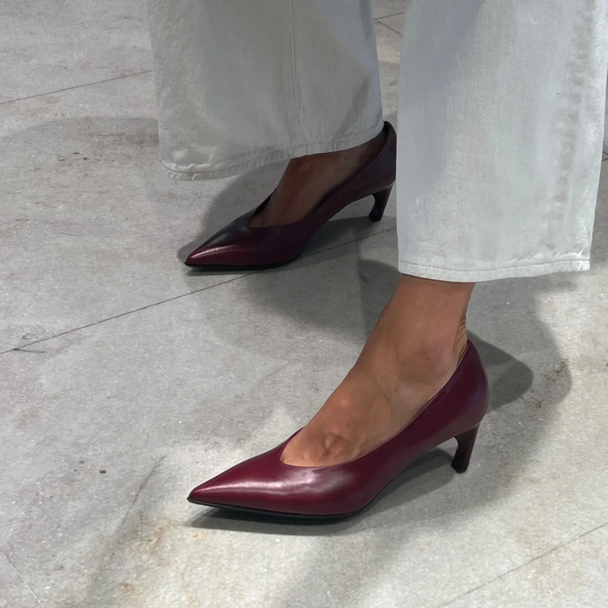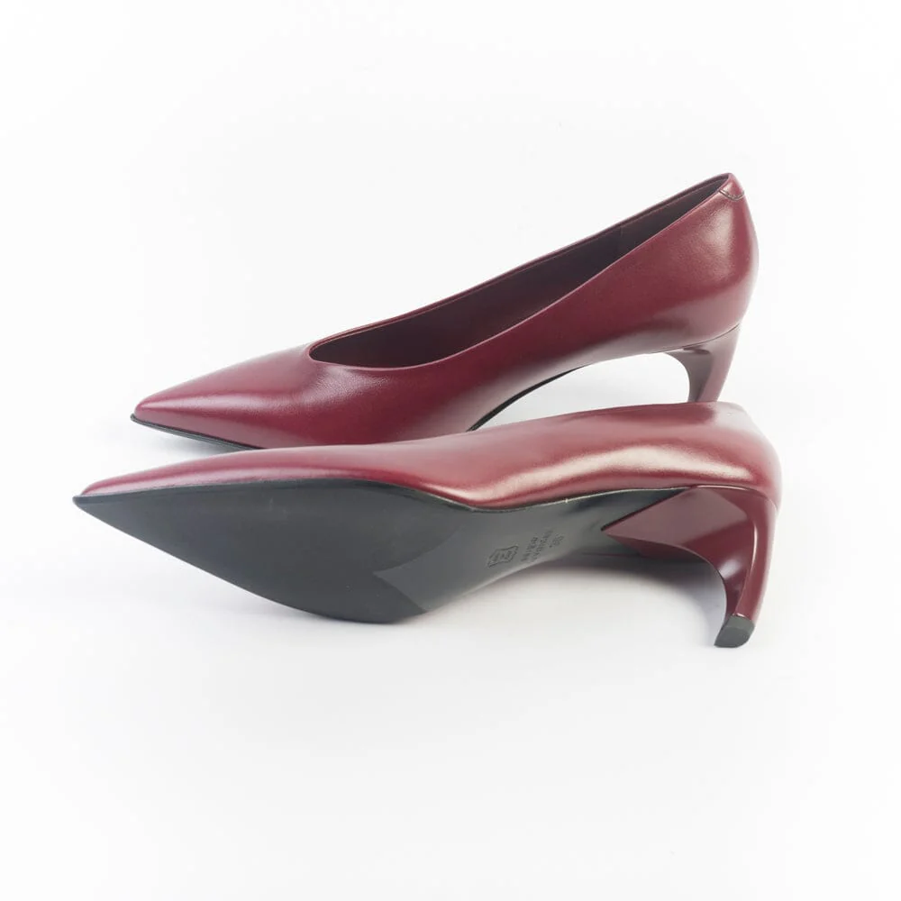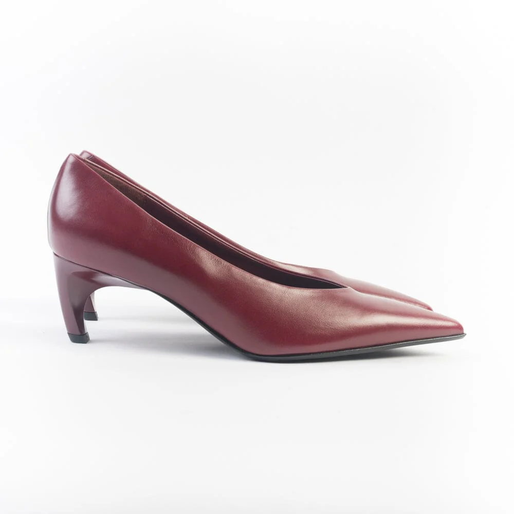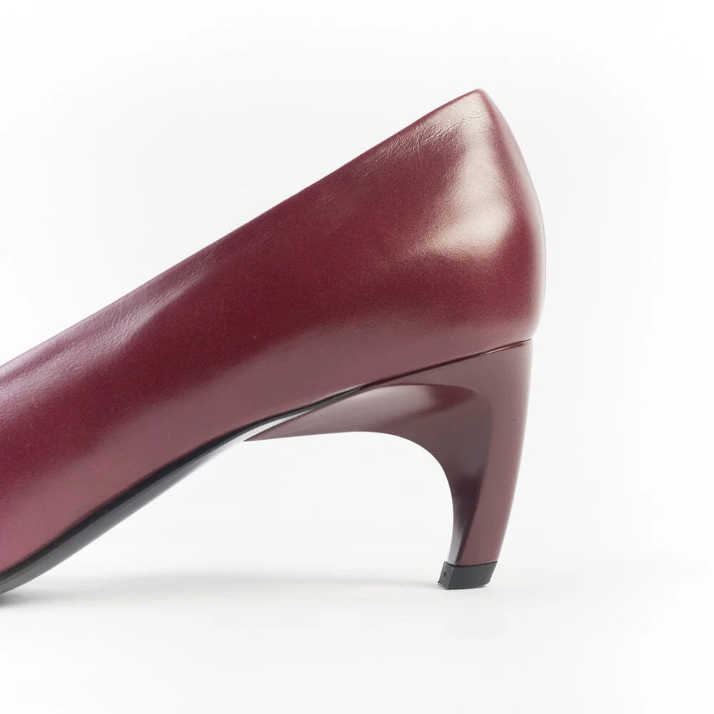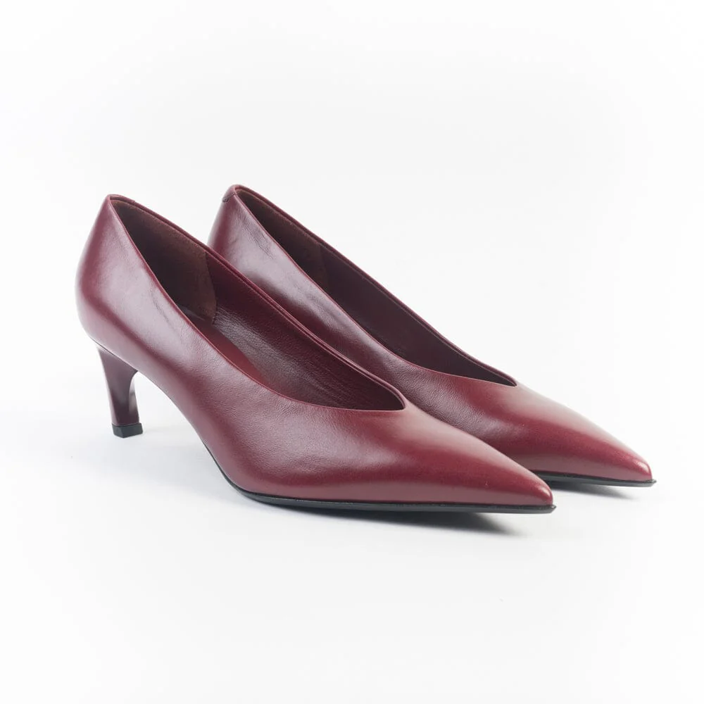 Décolleté di Sergio Levantesi realizzato in morbida pelle di vitello di colore bordeaux. Interno e sottopiede in pelle. Tacco di design di 6 cm. Suola in cuoio con inserti in gomma di colore nero.