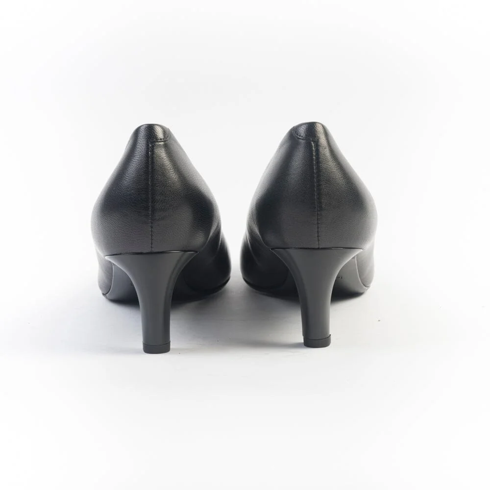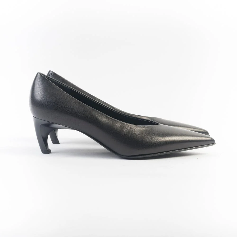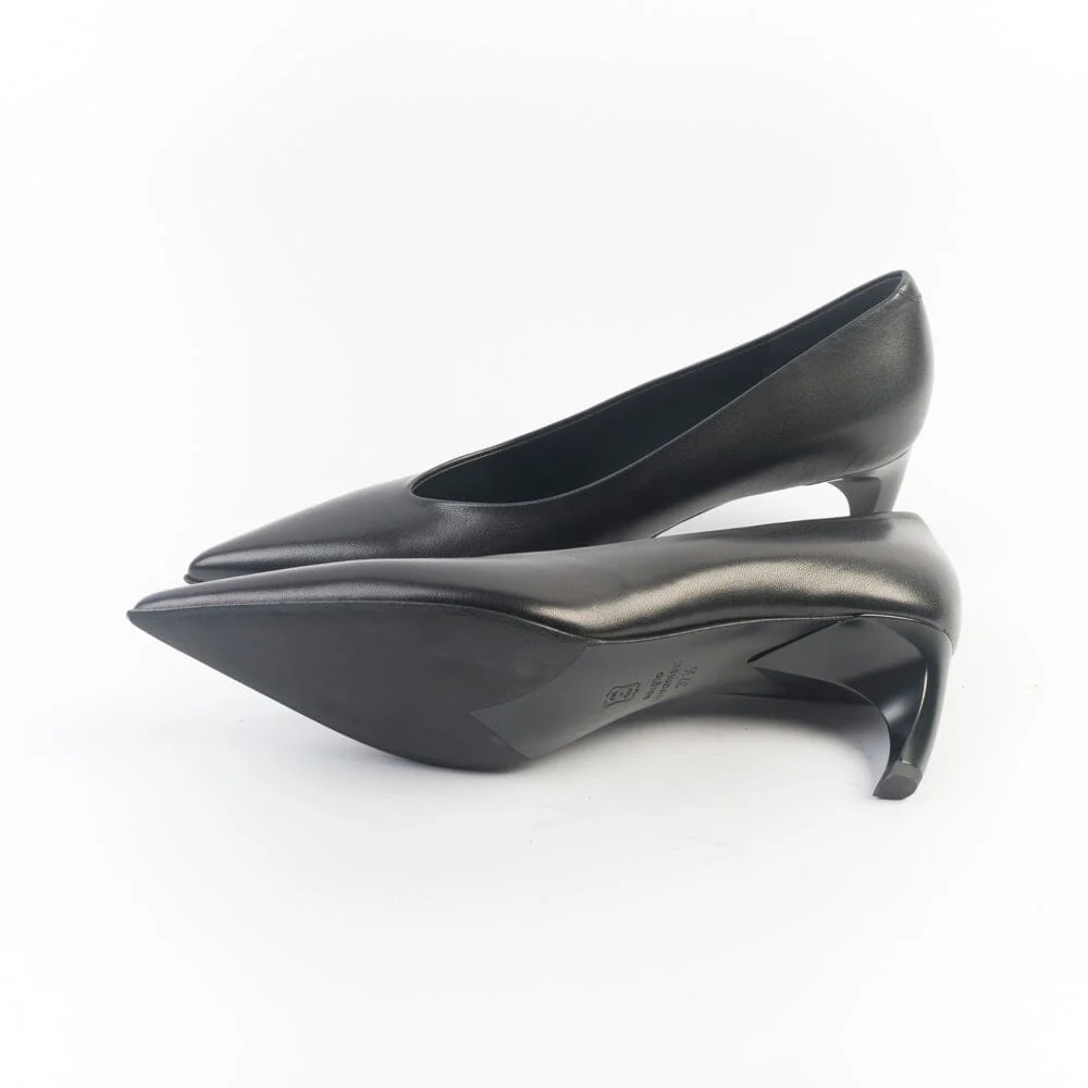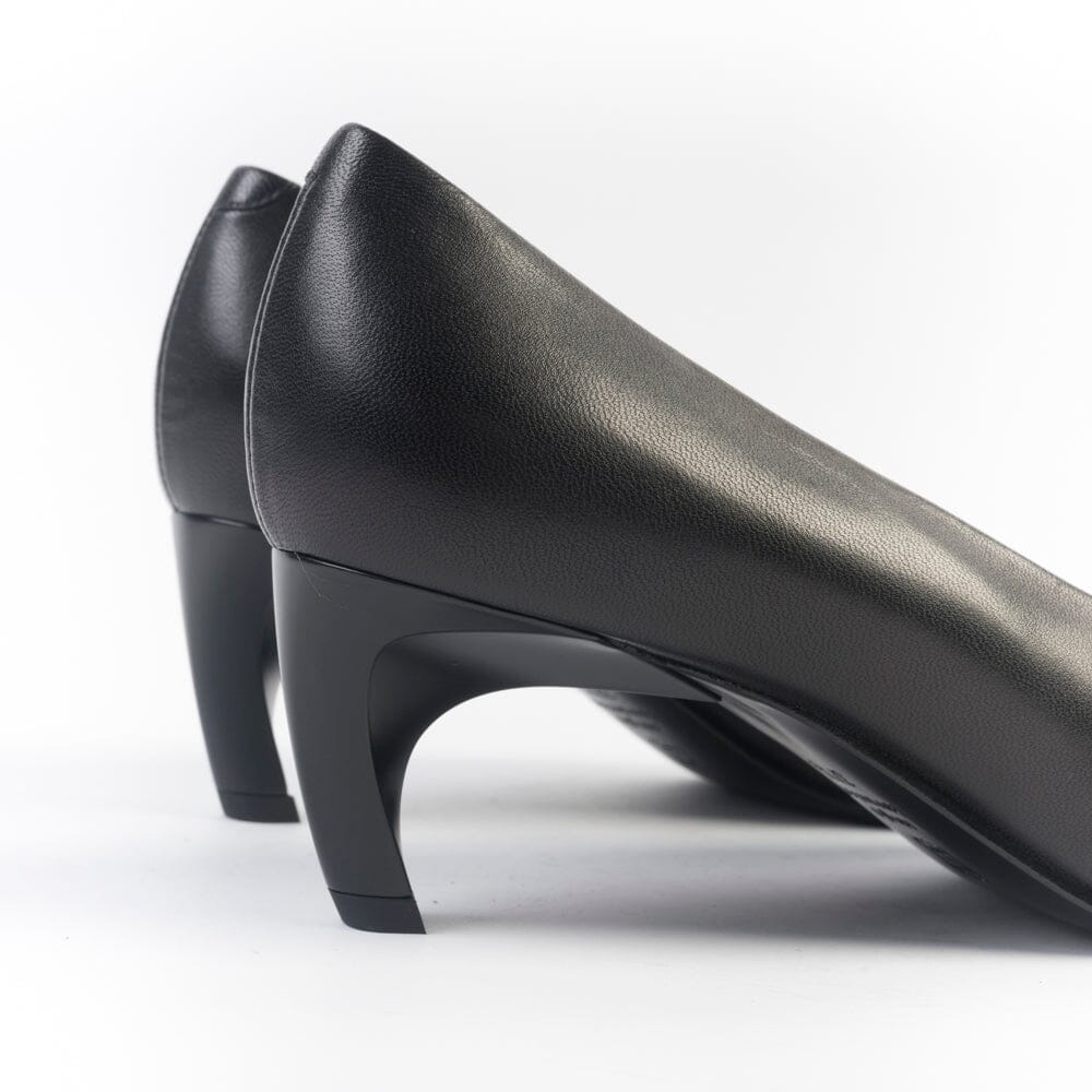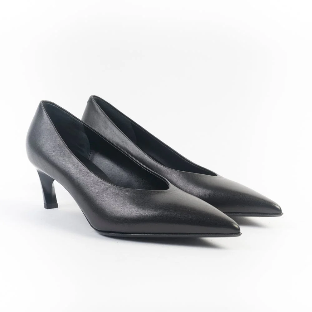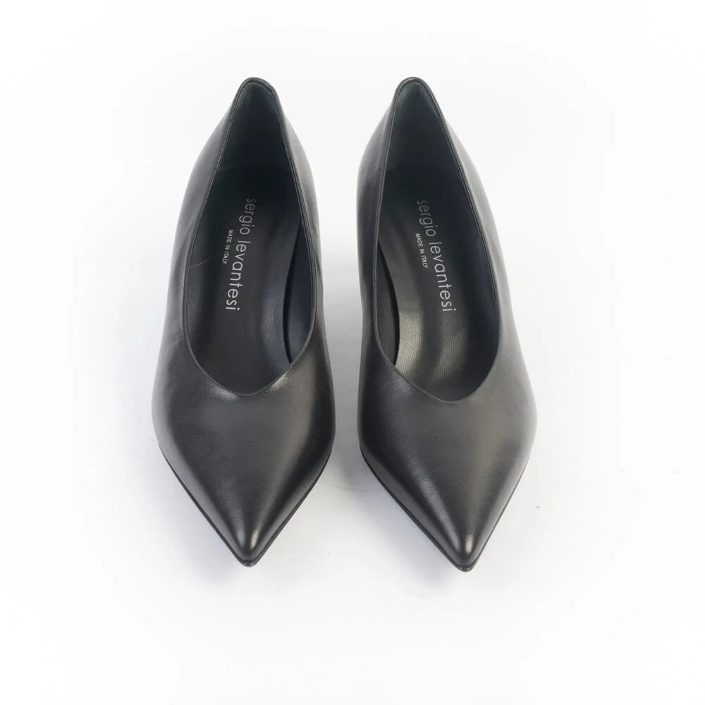 Décolleté di Sergio Levantesi realizzato in morbida pelle di vitello di colore nero. Interno e sottopiede in pelle. Tacco di design di 6 cm. Suola in cuoio con inserti in gomma di colore nero.