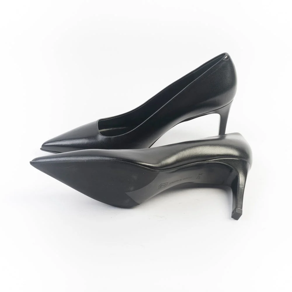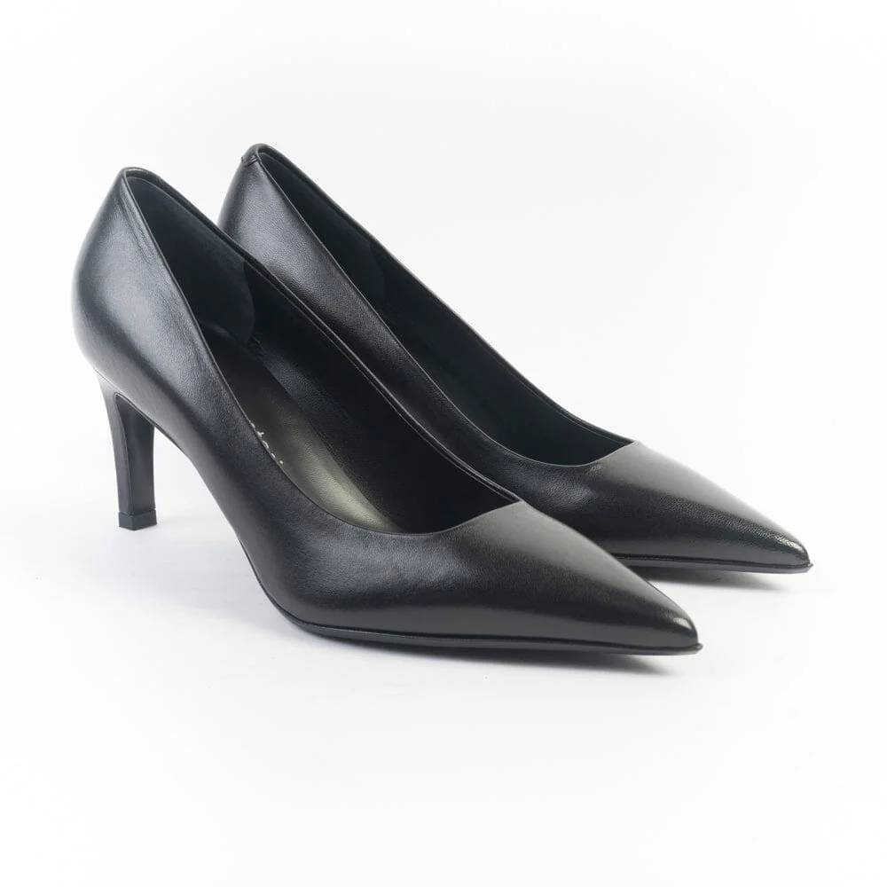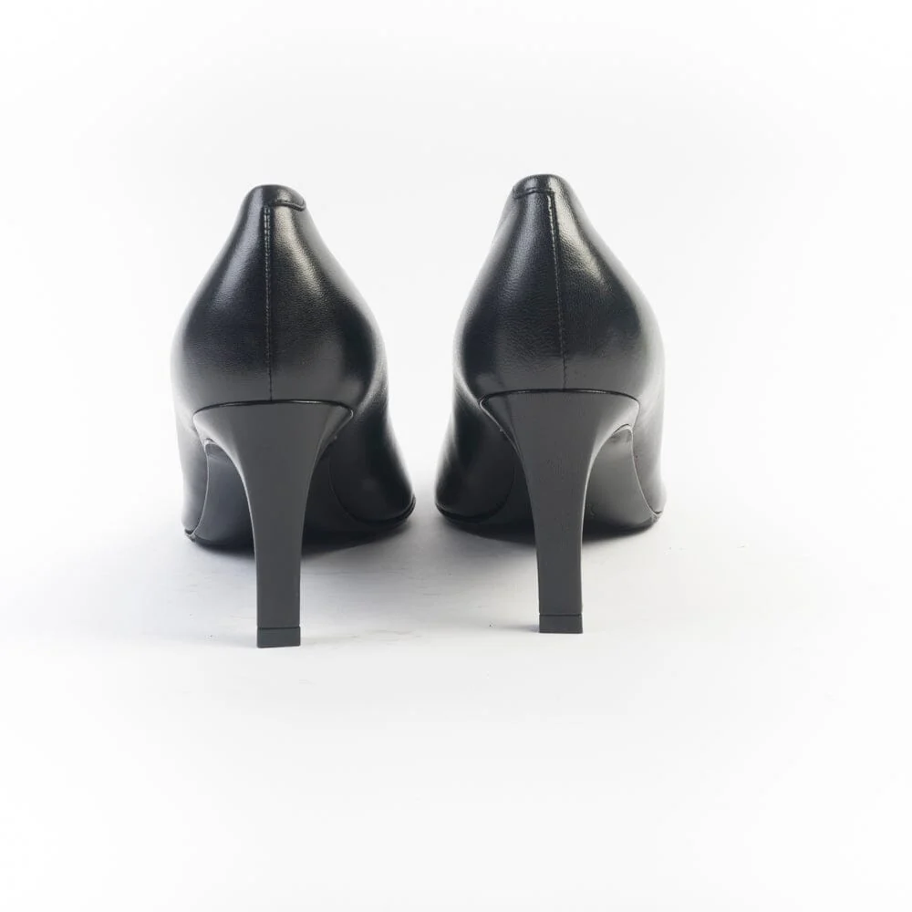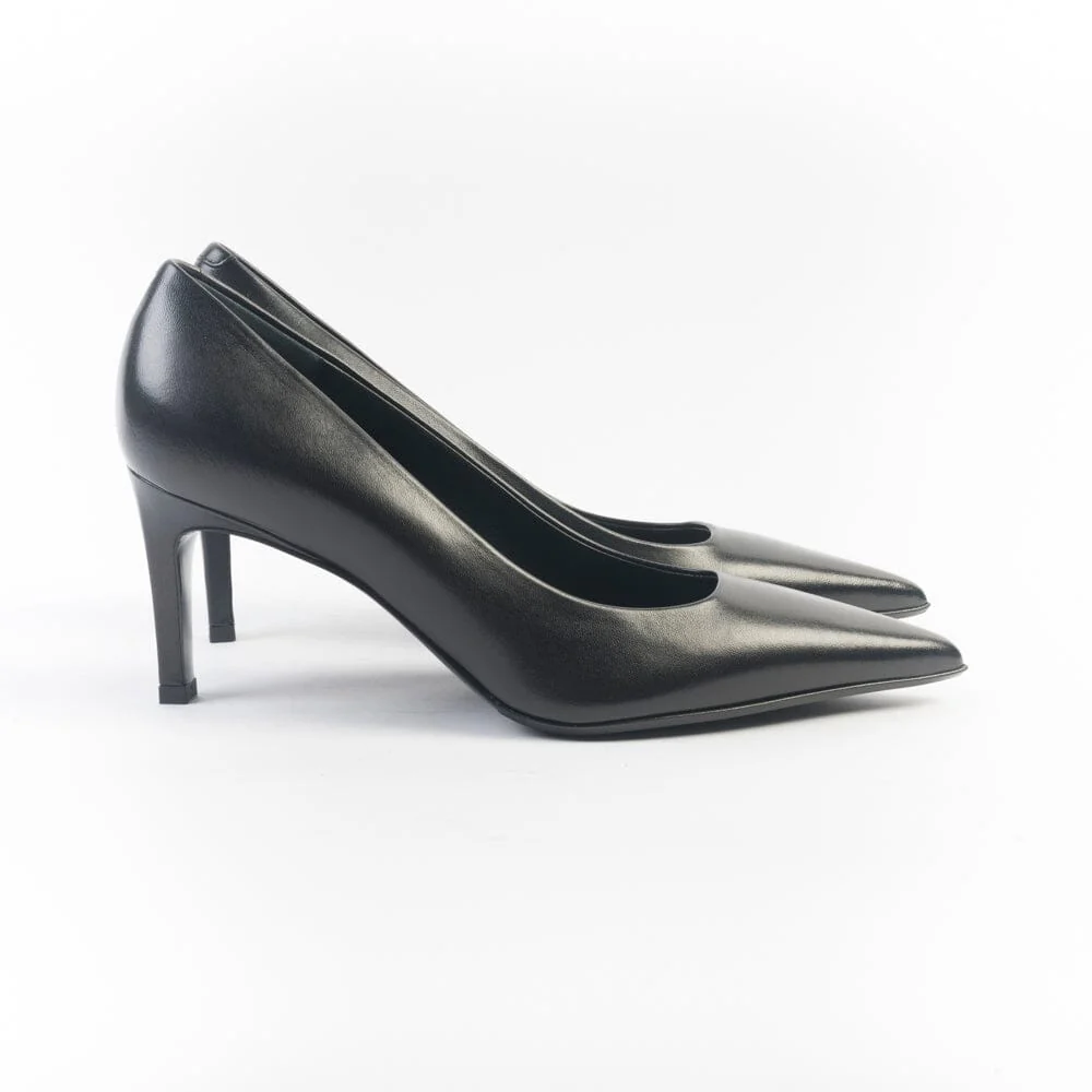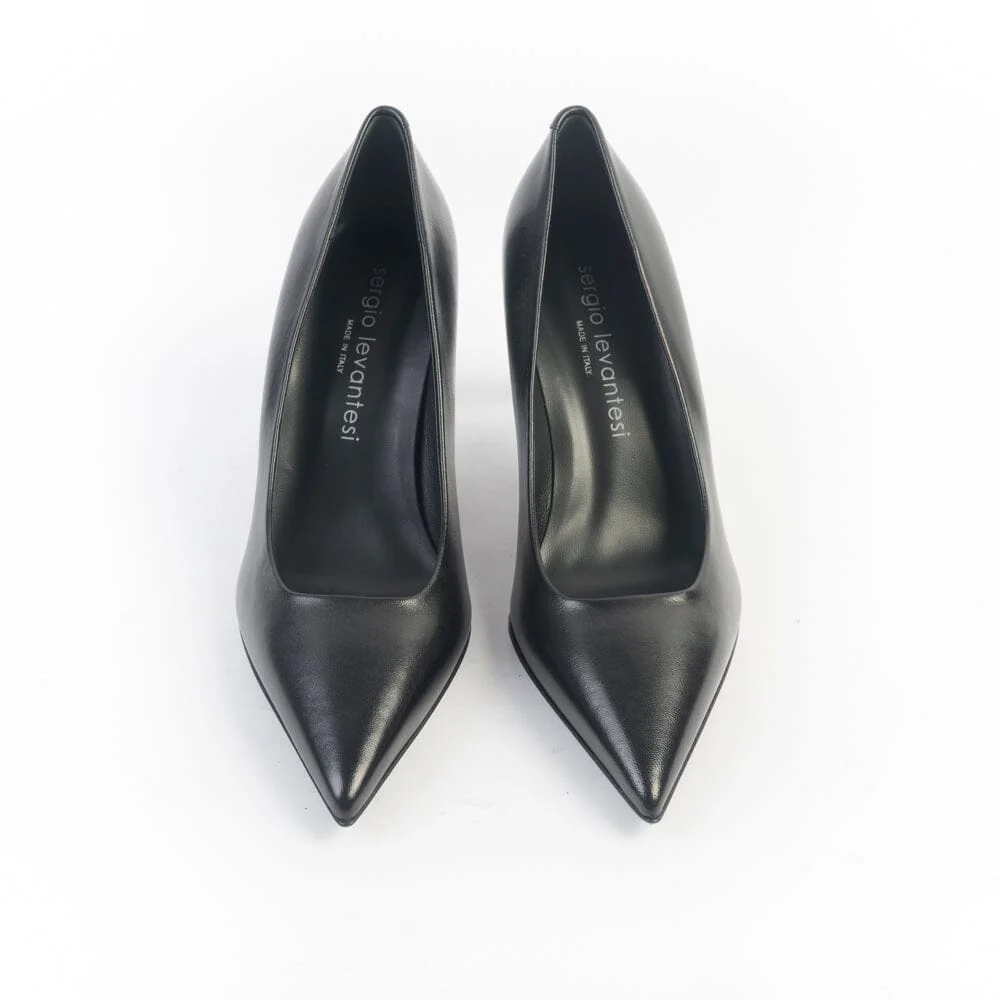 Décolleté di Sergio Levantesi realizzate in morbida pelle di vitello di colore nero. Interno e sottopiede in pelle. Tacco stiletto di 8 cm. Suola in cuoio con inserti in gomma di colore nero.