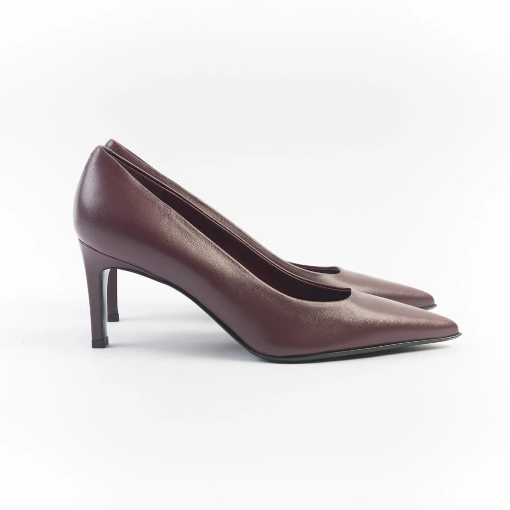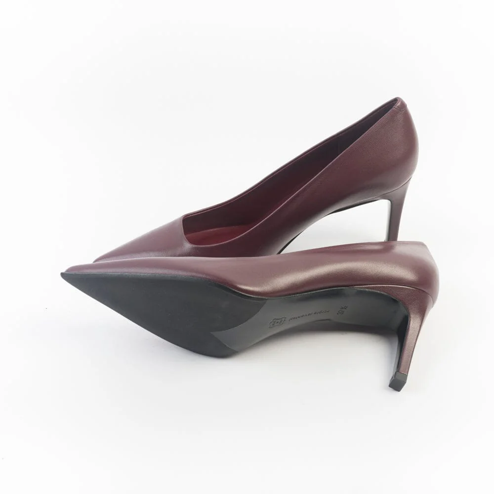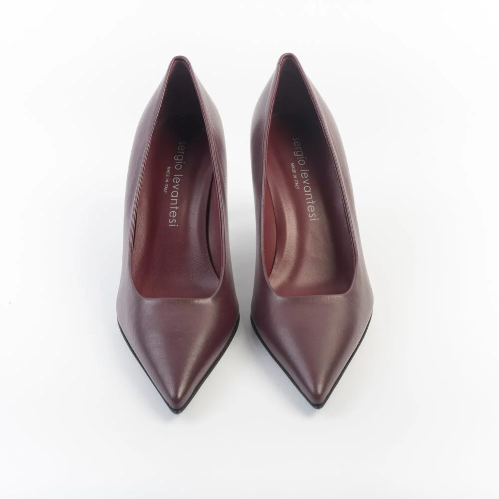 Décolleté di Sergio Levantesi realizzate in morbida pelle di vitello di colore rosso vino. Interno e sottopiede in pelle. Comodo tacco di design, leggermente squadrato, di 8 cm. Suola in cuoio con inserti in gomma di colore nero.