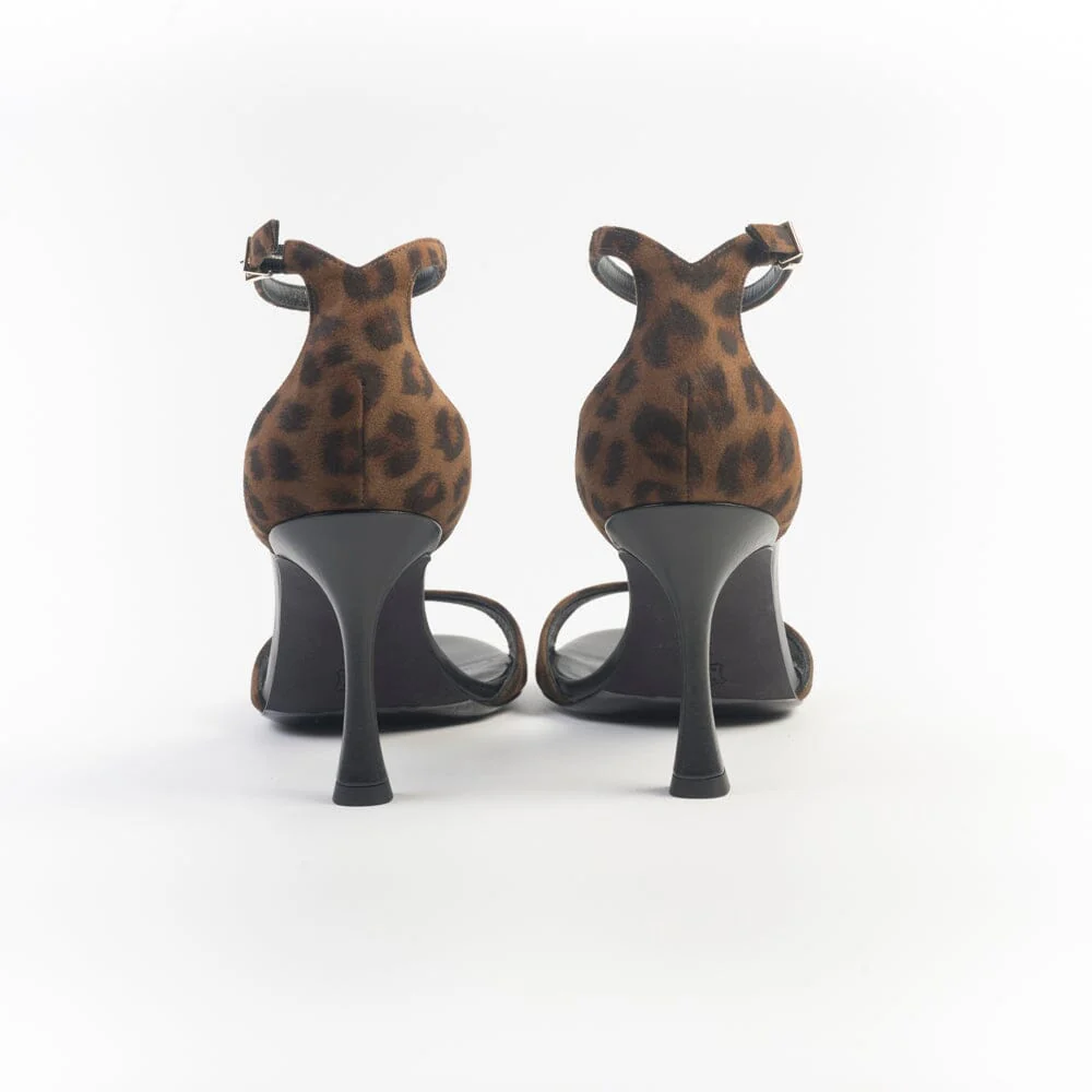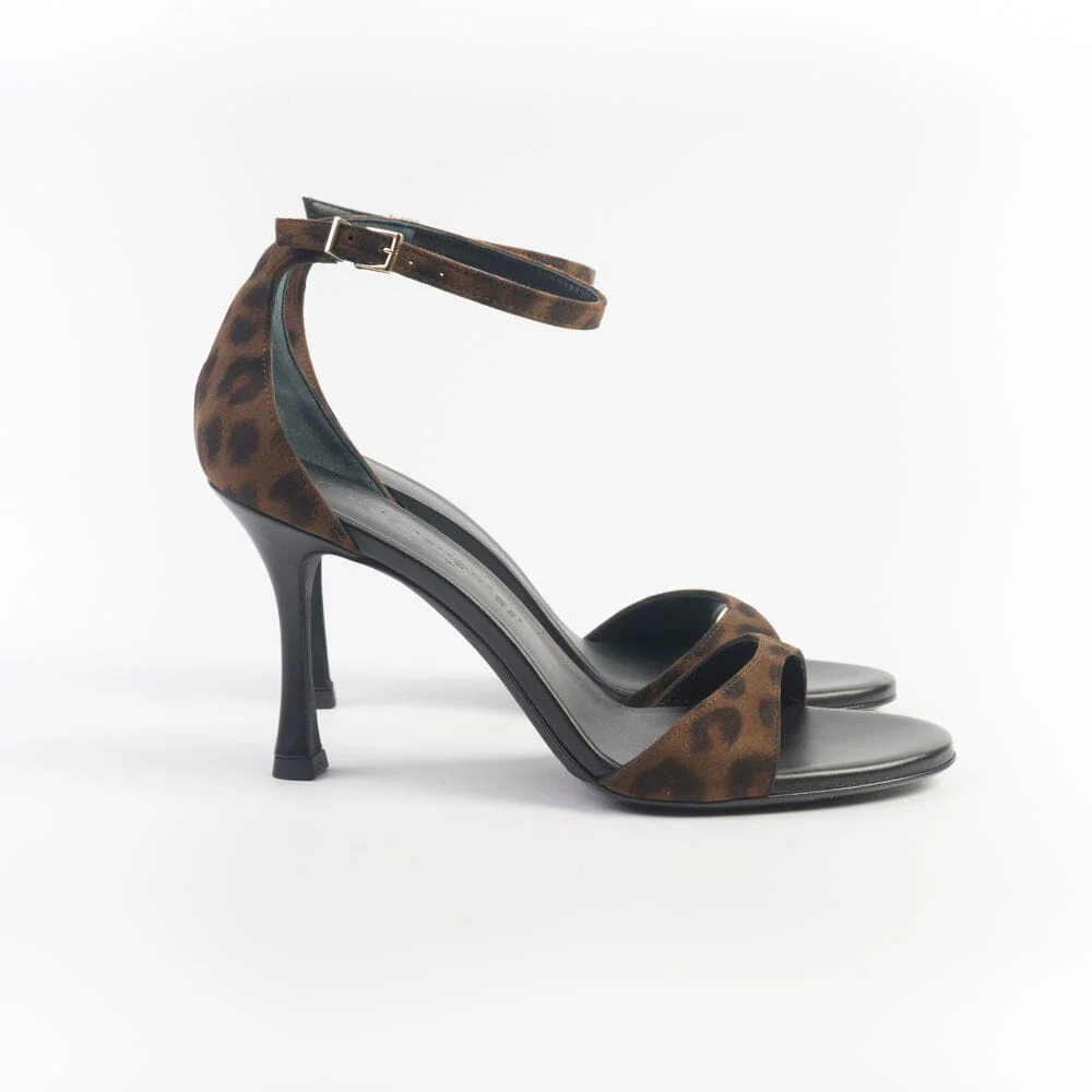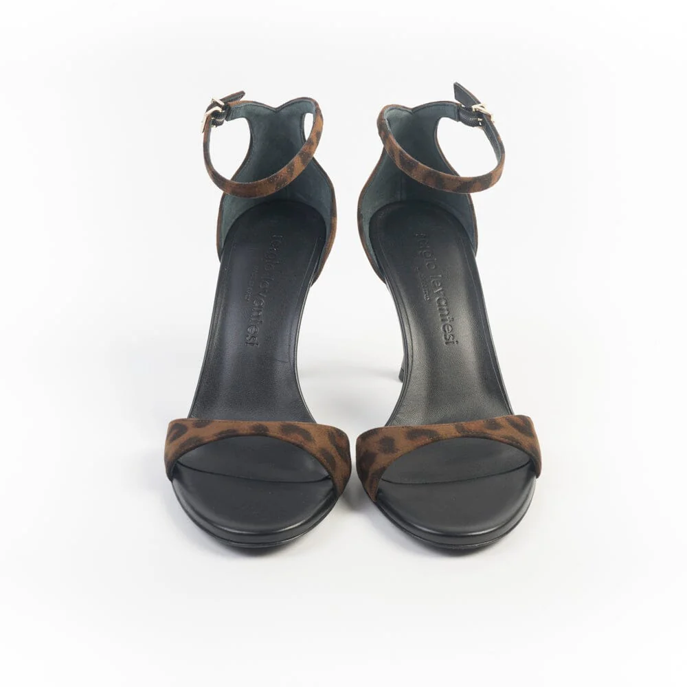 Sandali con tacco di Sergio Levantesi realizzati in morbido camoscio effetto velluto, a stampa maculata nei colori del marrone e nero, con fascia che avvolge bene l’avampiede. Cinturino alla caviglia regolabile e tallone chiuso. Sottopiede in pelle. Tacco stiletto di 9 cm. Suola in cuoio. Realizzato in Italia. Calzata regolare.