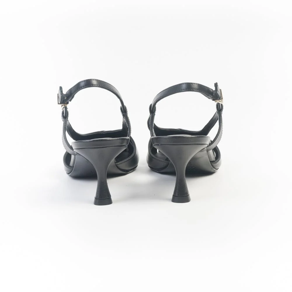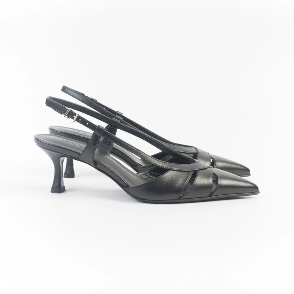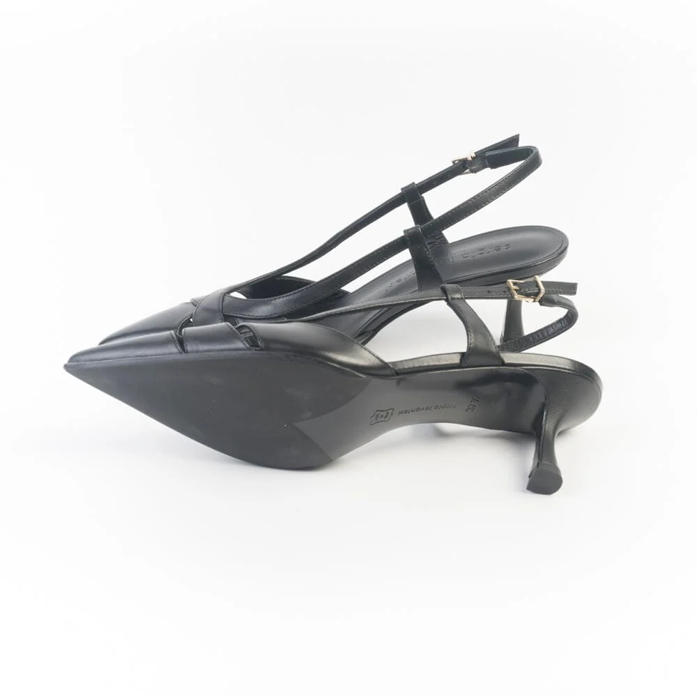 Sling Back di Sergio Levantesi realizzate in morbida pelle di colore nero. Cinturino regolabile alla caviglia. Interno e sottopiede in pelle. Tacco rocchetto di 6 cm circa. Suola in cuoio con inserto in gomma.