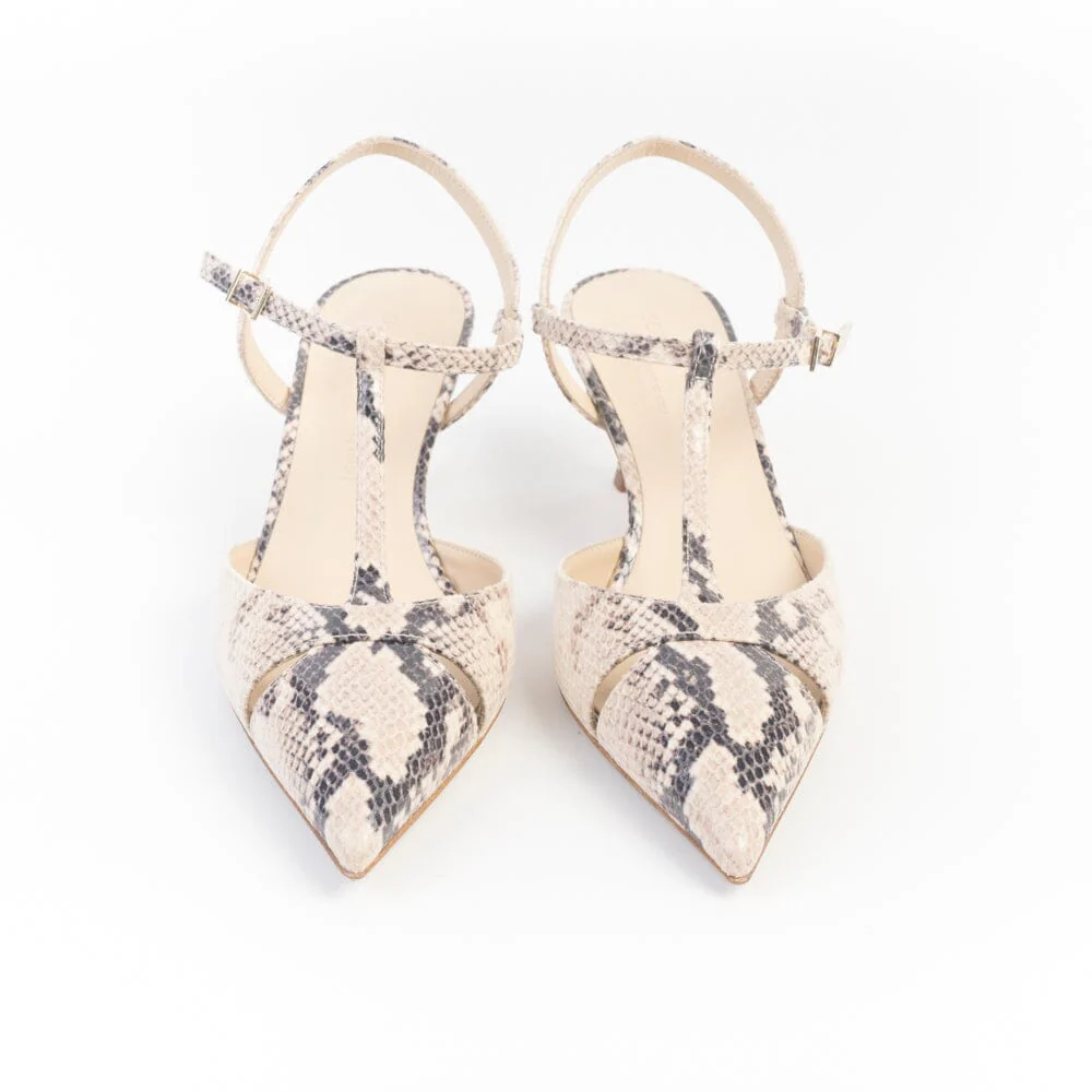 Sling Back di Sergio Levantesi realizzate in morbida pelle lucida, con stampa effetto rettile, di colore sabbia. Cinturino regolabile alla caviglia e incrocio a T su collo del piede. Interno e sottopiede in pelle. Tacco rocchetto 6 cm circa. Suola in cuoio con inserto in gomma.