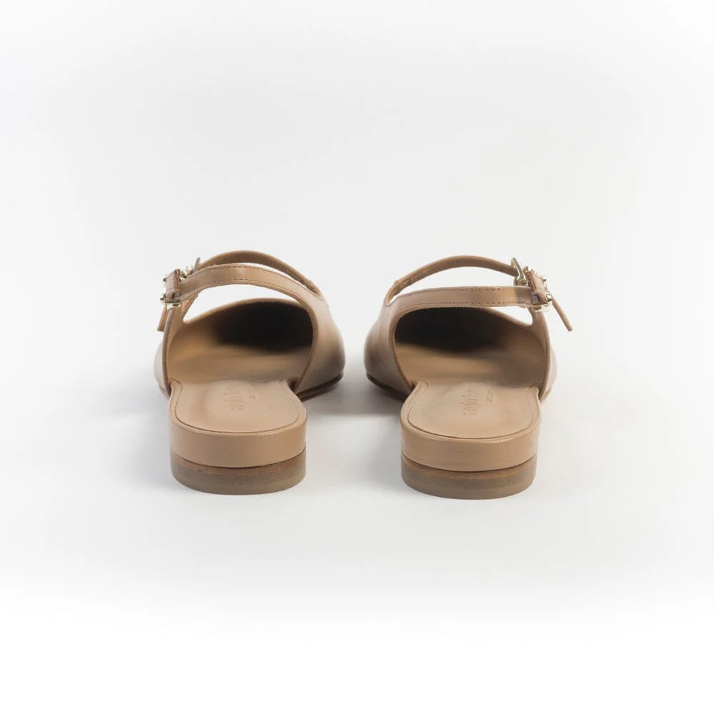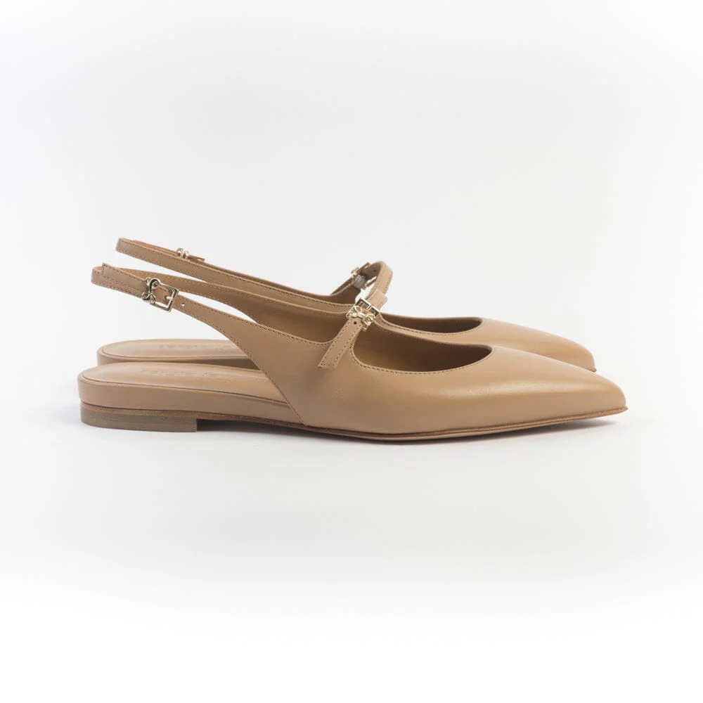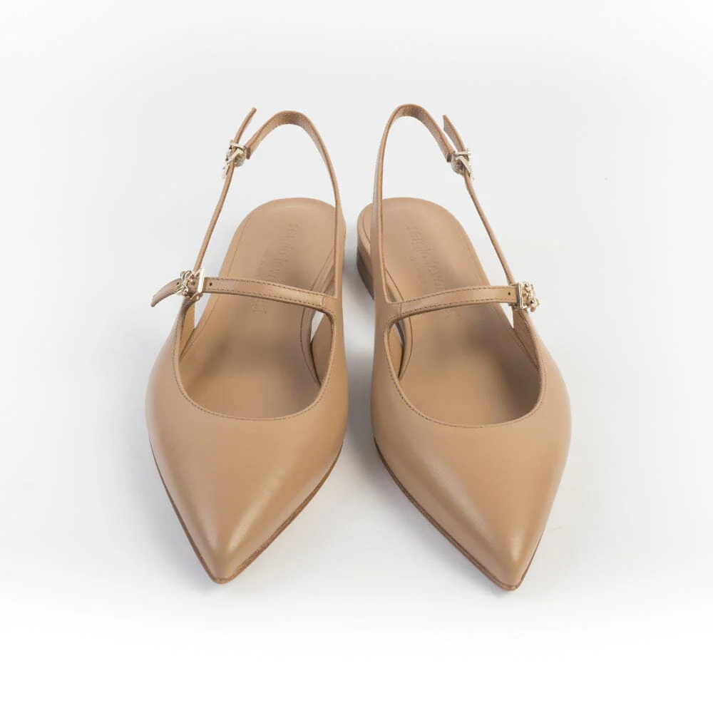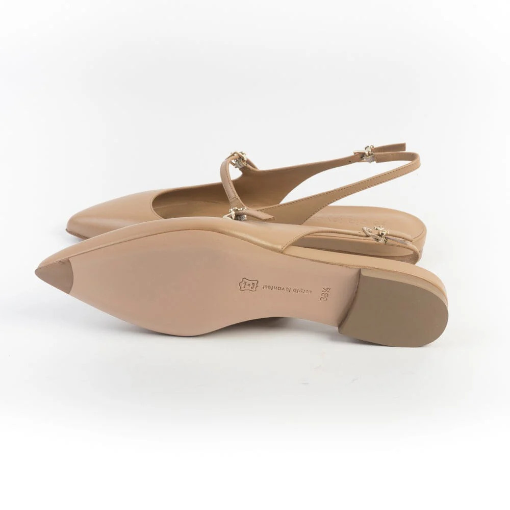 Sling Back di Sergio Levantesi, realizzate in pelle di colore nocciola . Cinturino regolabile alla caviglia e sul collo del piede. Interno e sottopiede in pelle in nuance. Suola in cuoio con inserto in gomma.