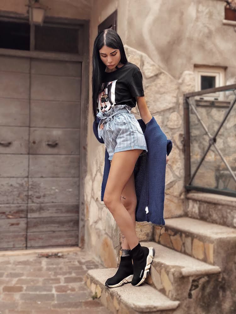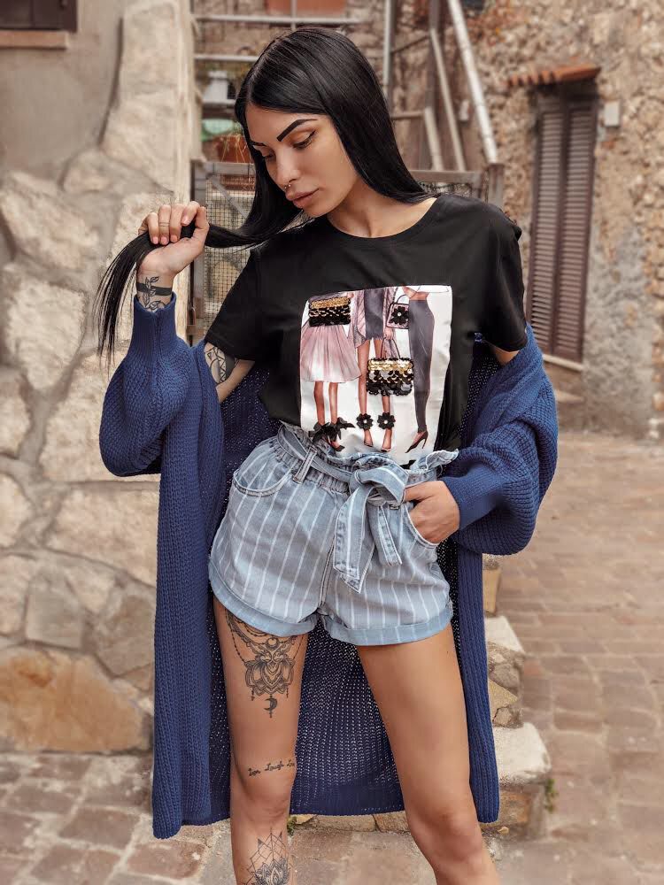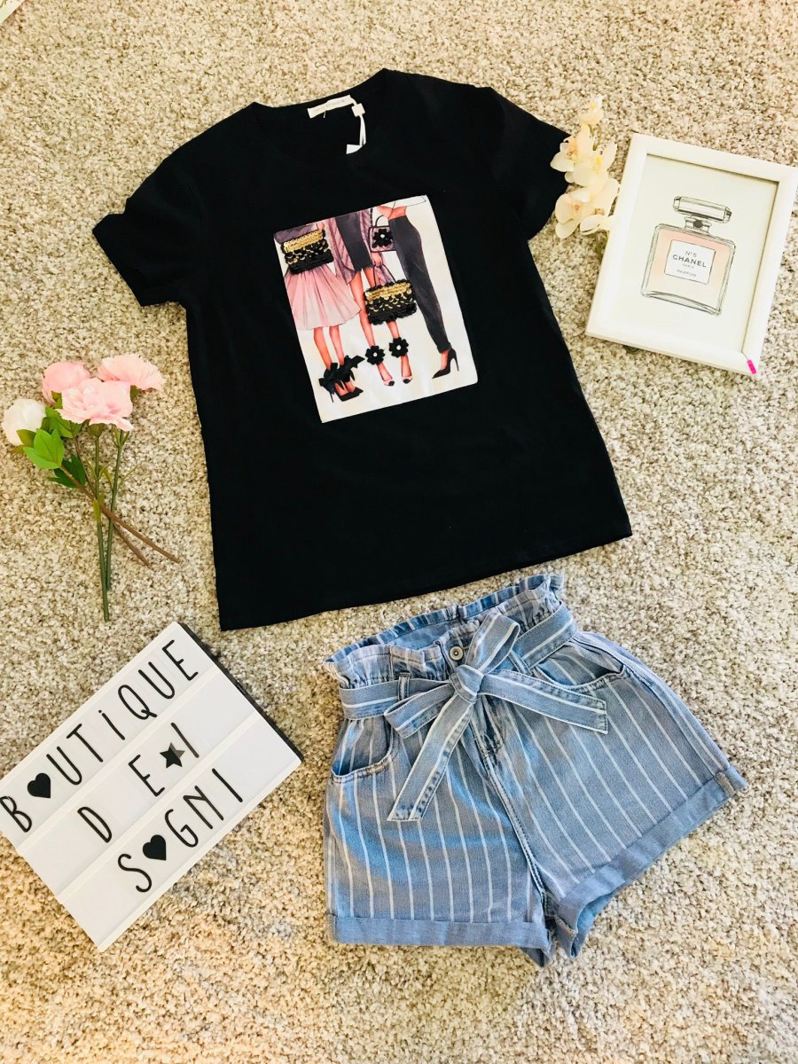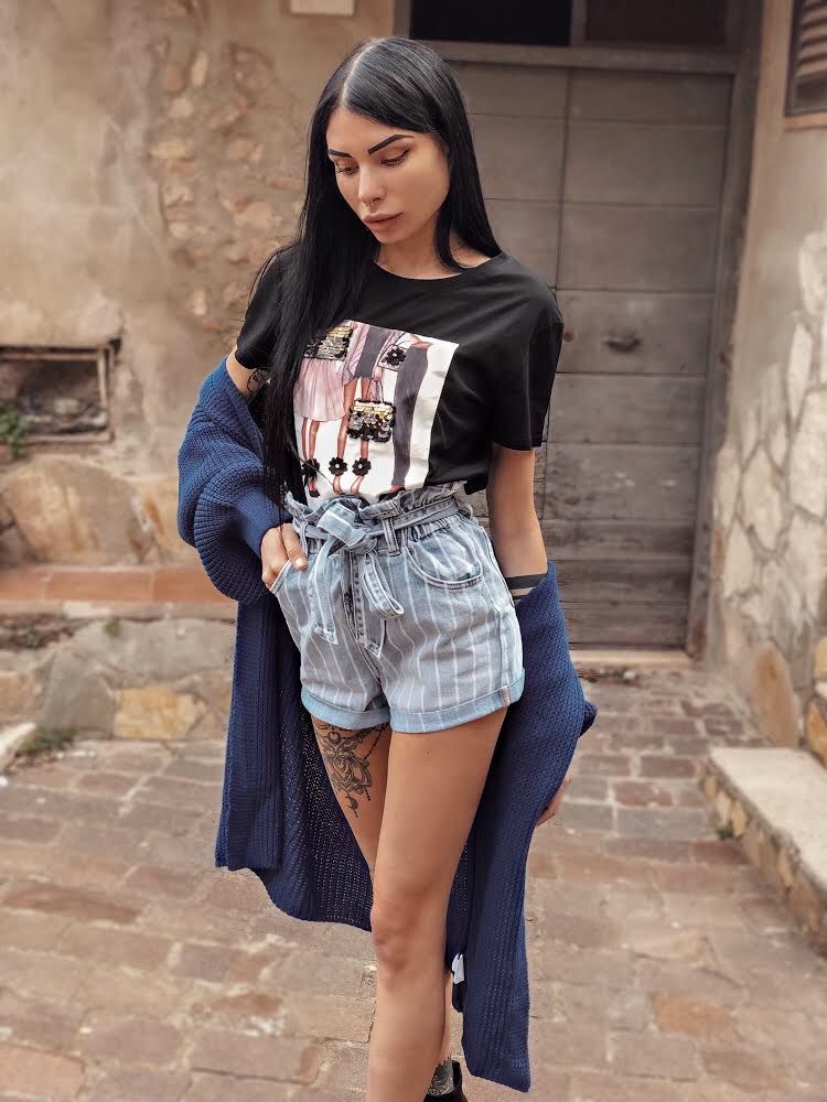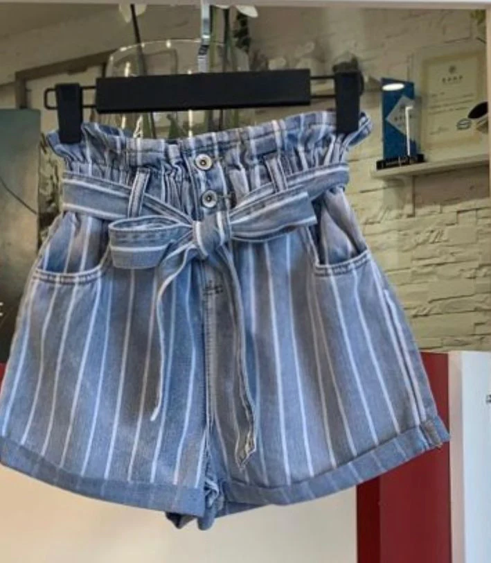 Shorts in jeans a righe modello a caramella con cinta e bottoni a vita alta con elastico.