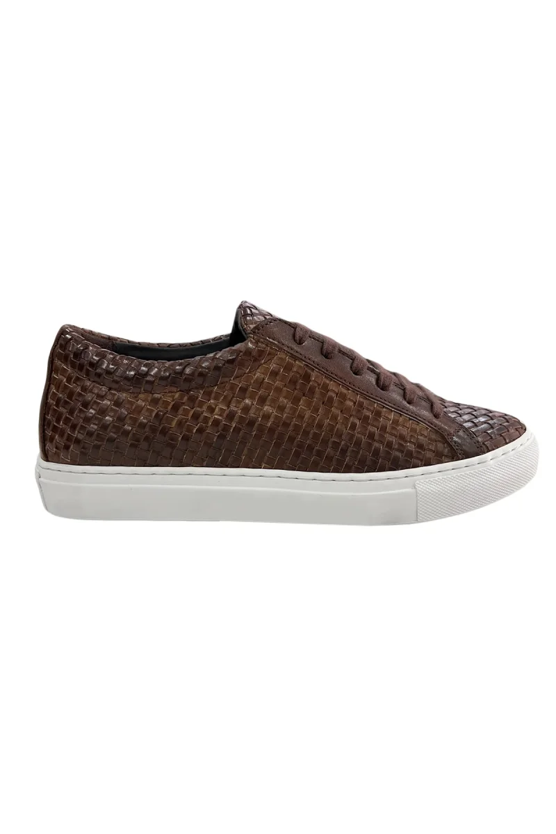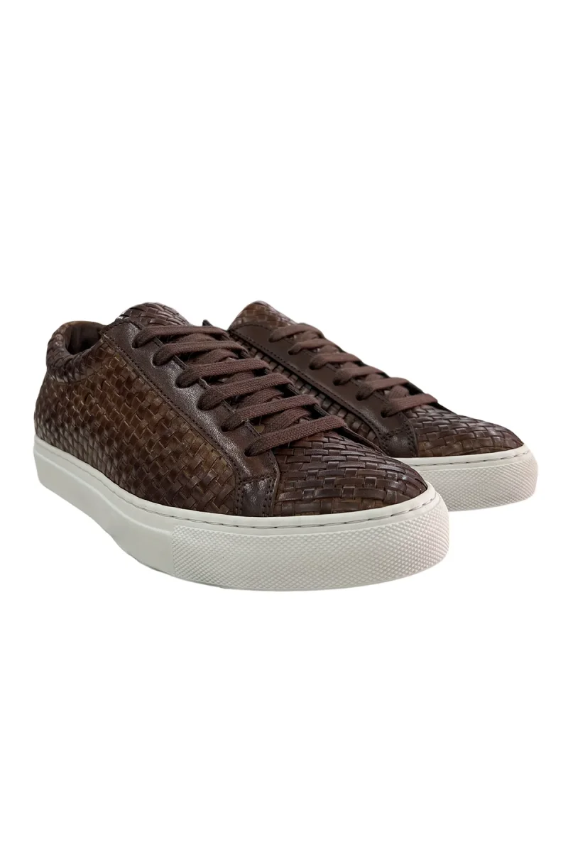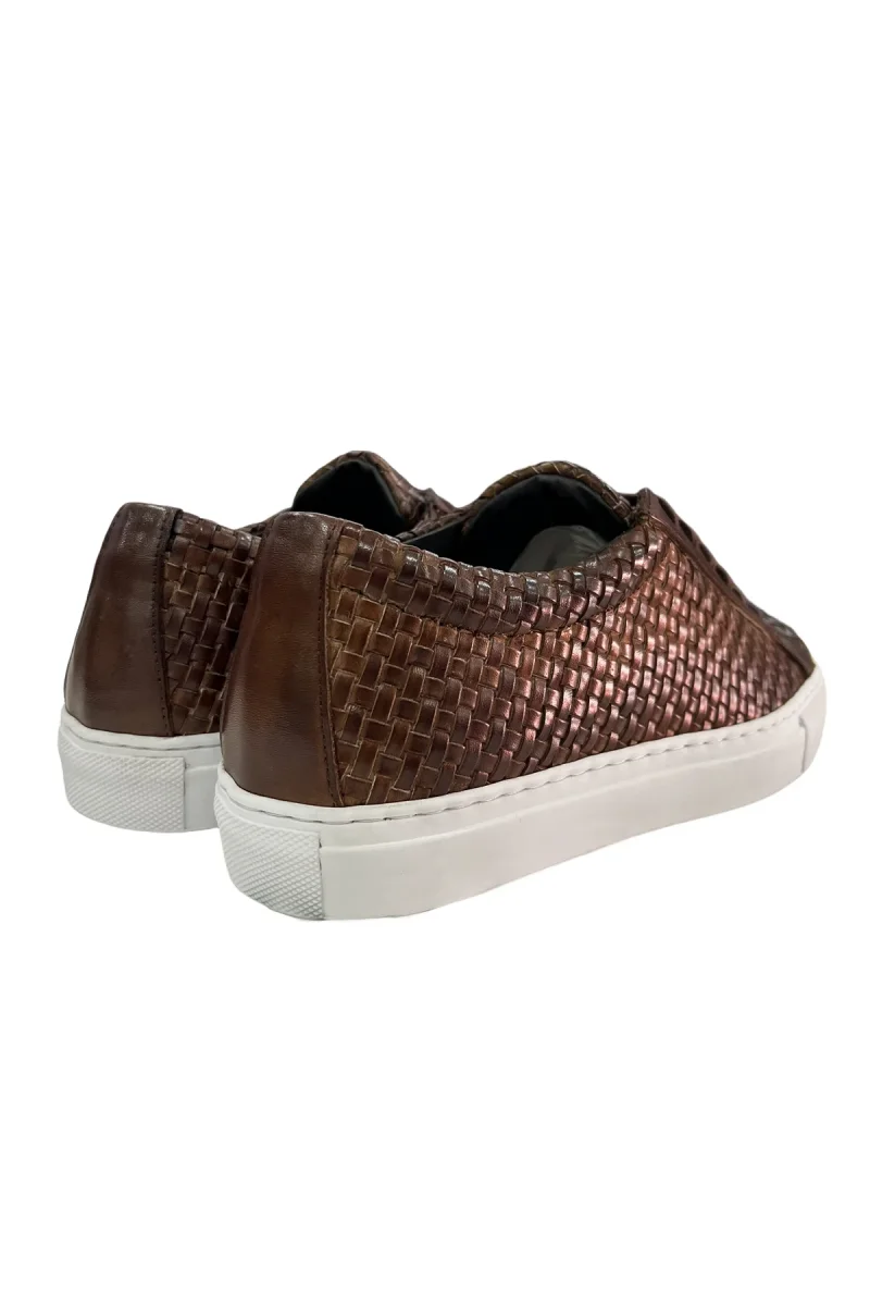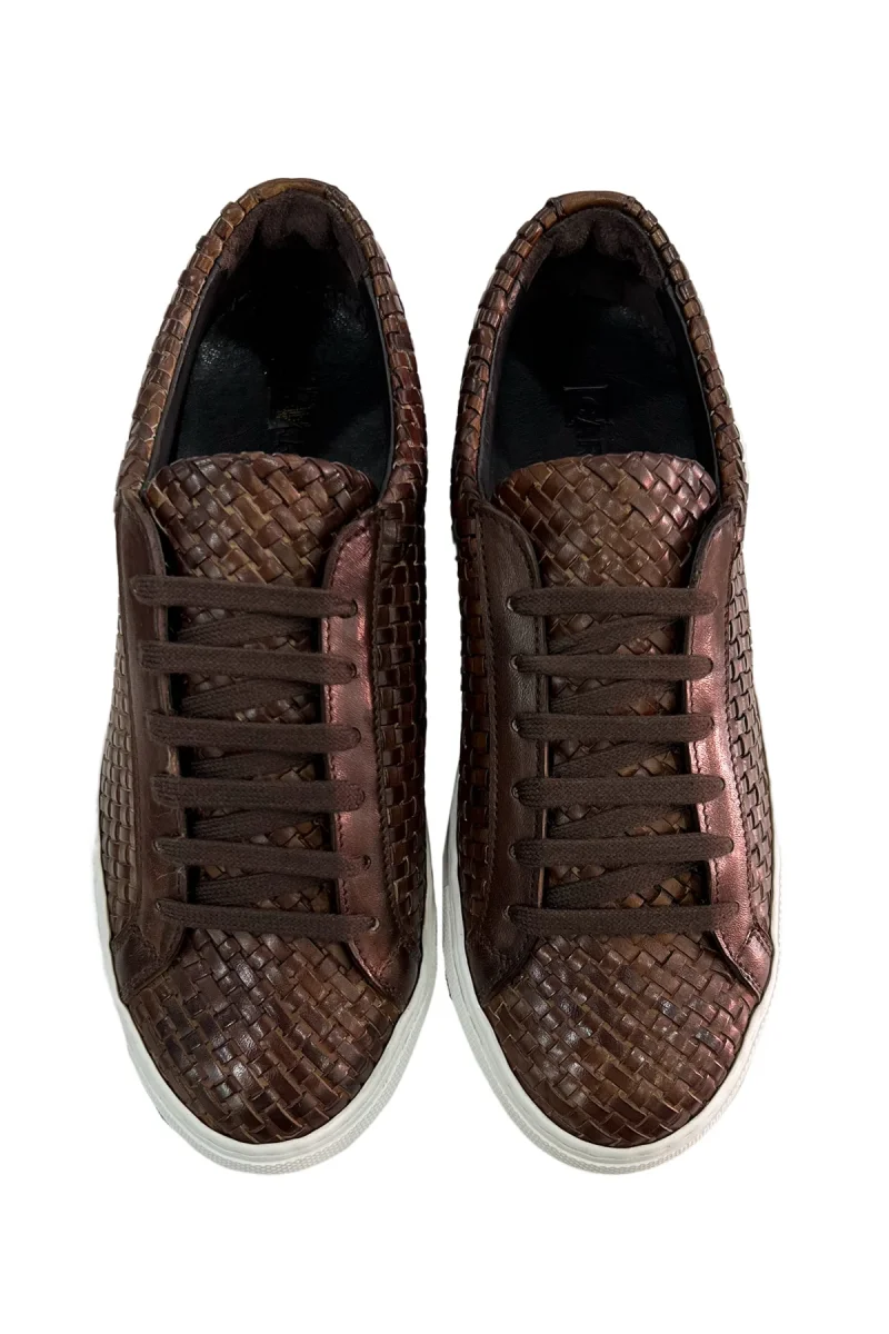 Sneakers uomo marroni in vera pelle intrecciata con suola in gomma bianca made in italy