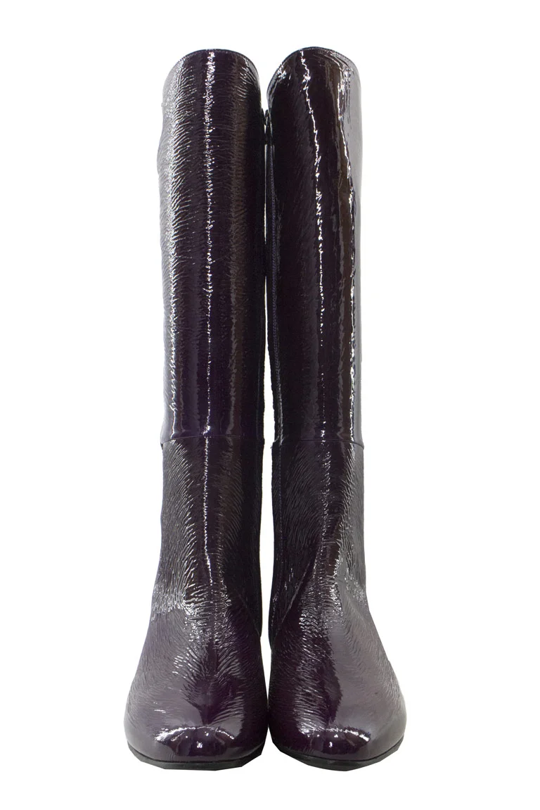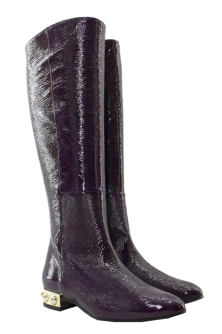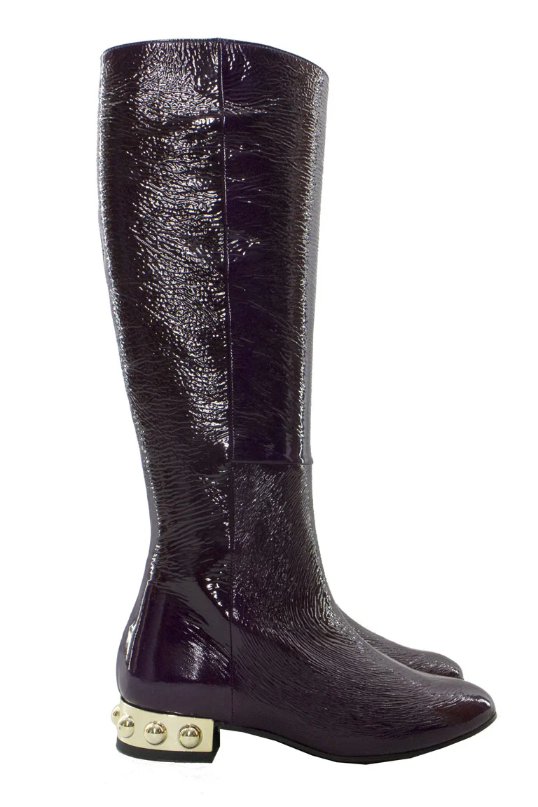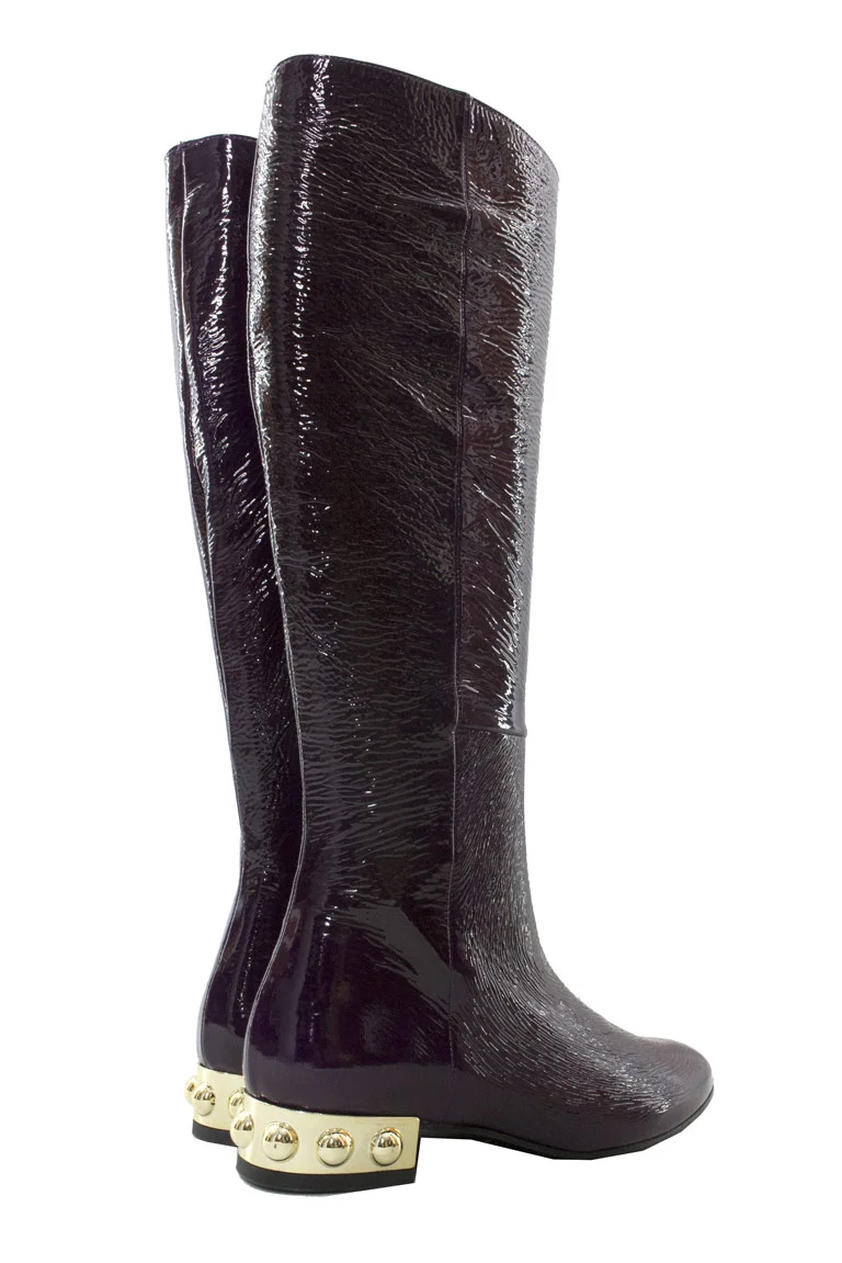 Scarpe invernali da donna modello stivale in vernice altezza ginocchio con tacco quadrato basso e placchetta oro sul tacco made in Italy