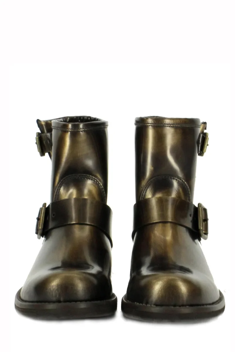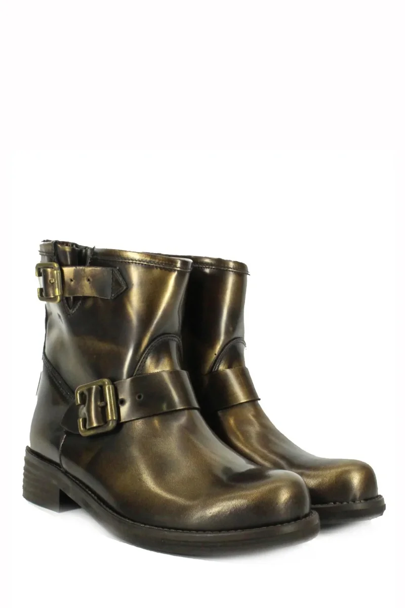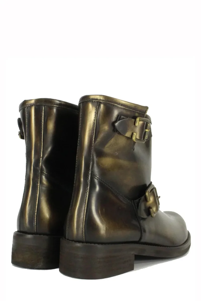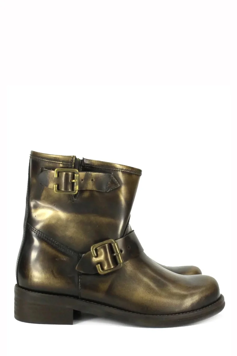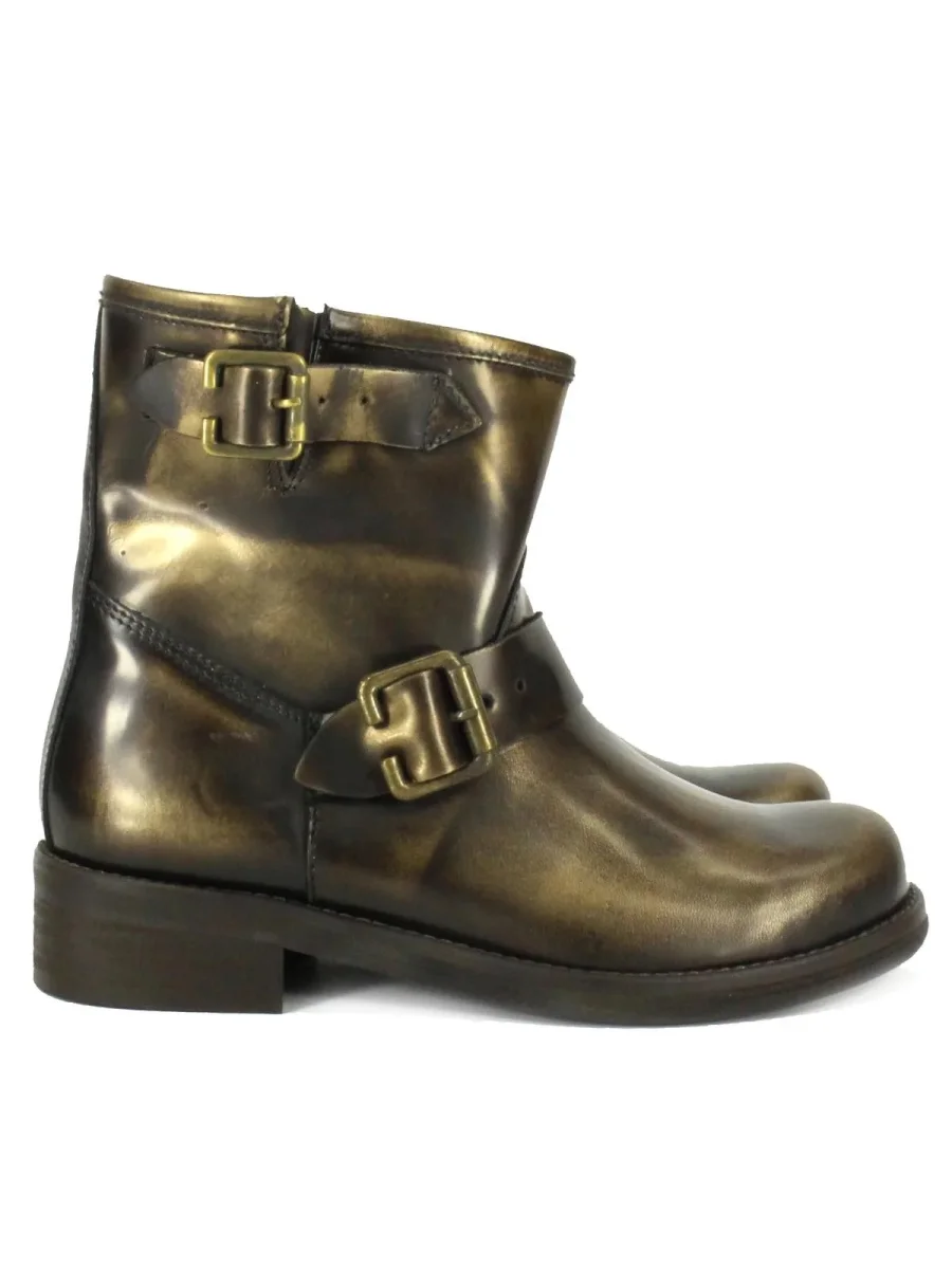 Stivaletto donna basso in pelle abrasivata bronzo tinta unita con fibbia lateralle