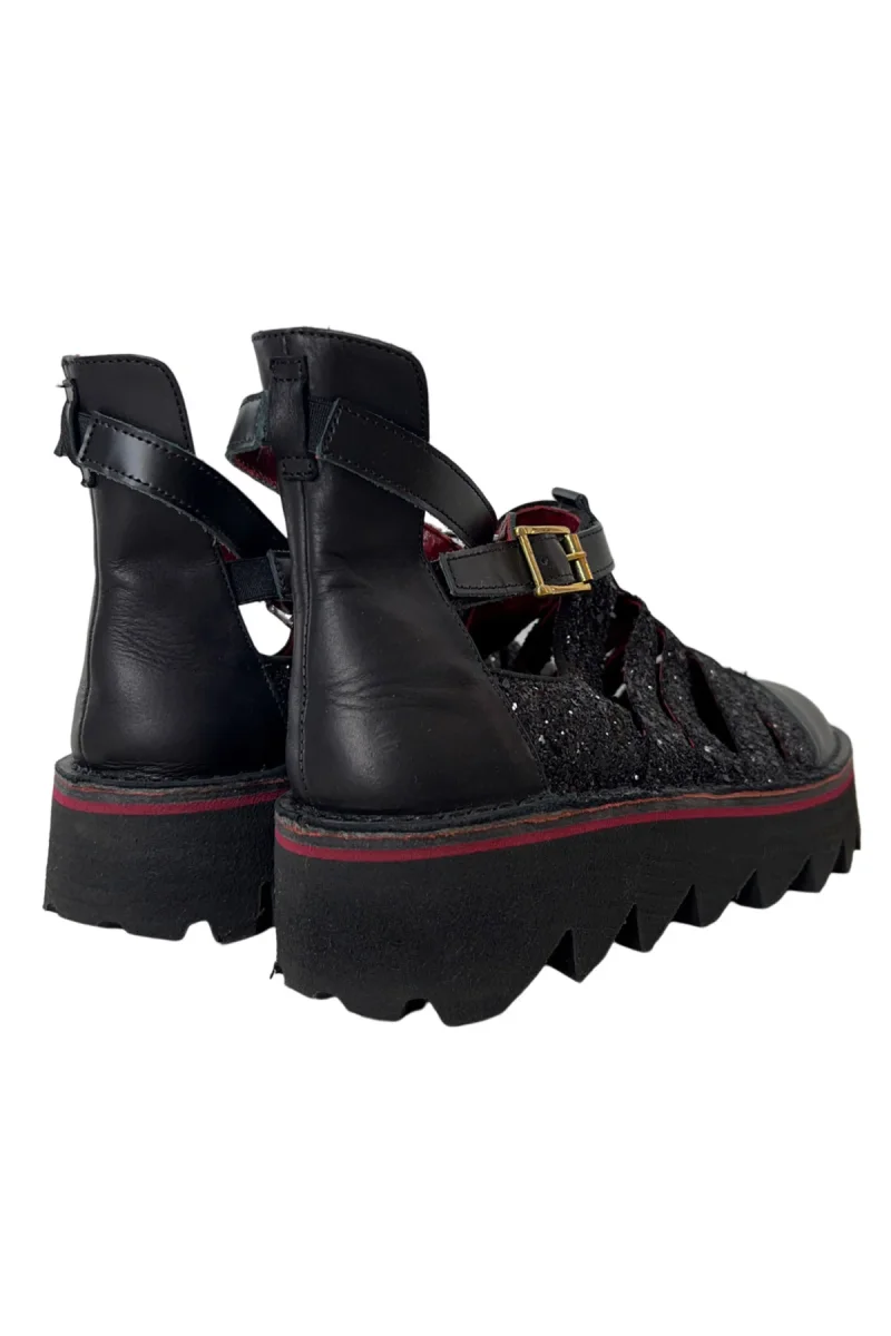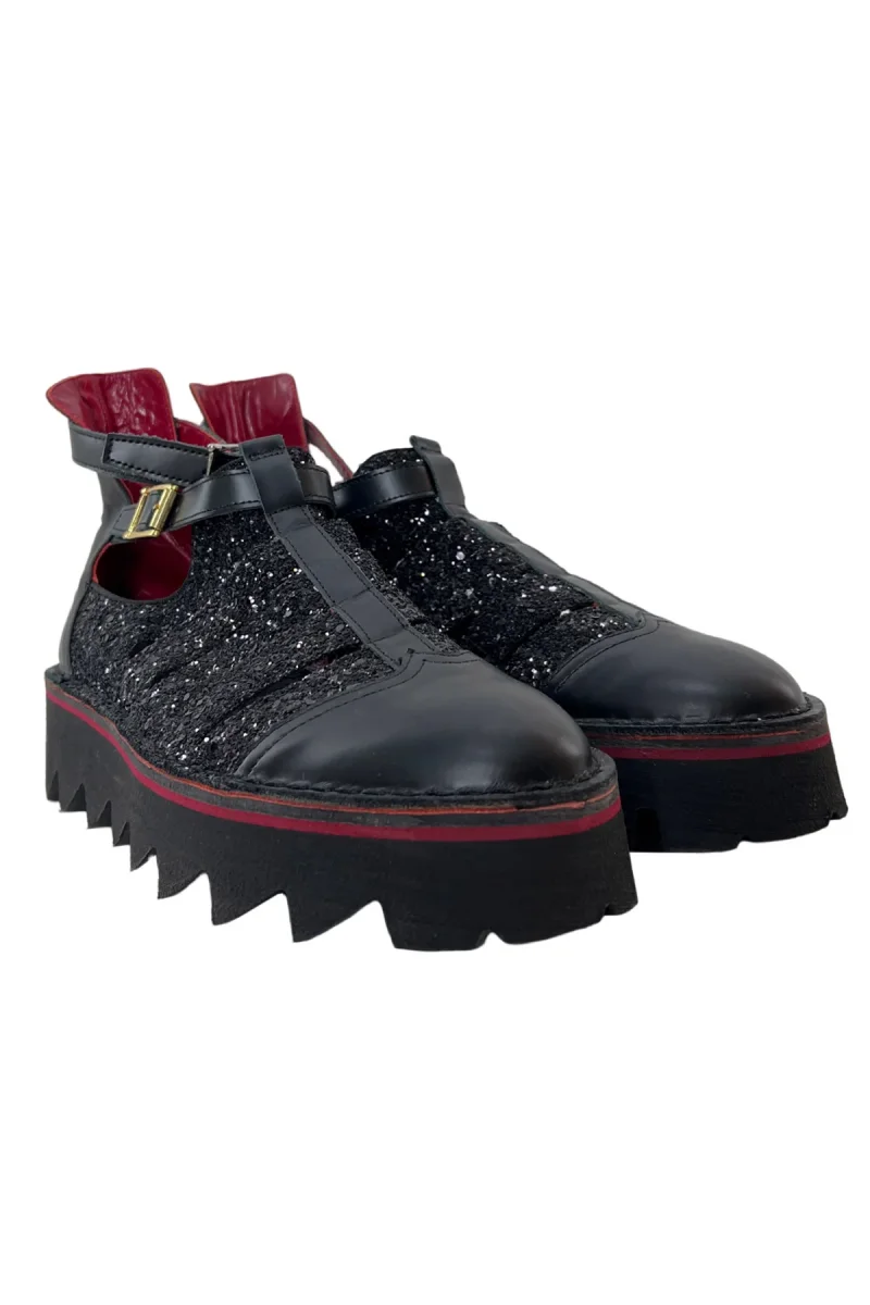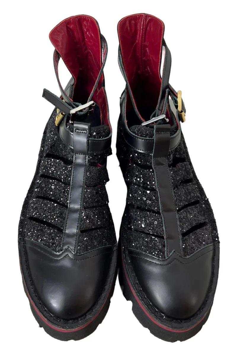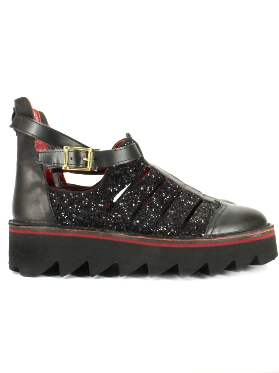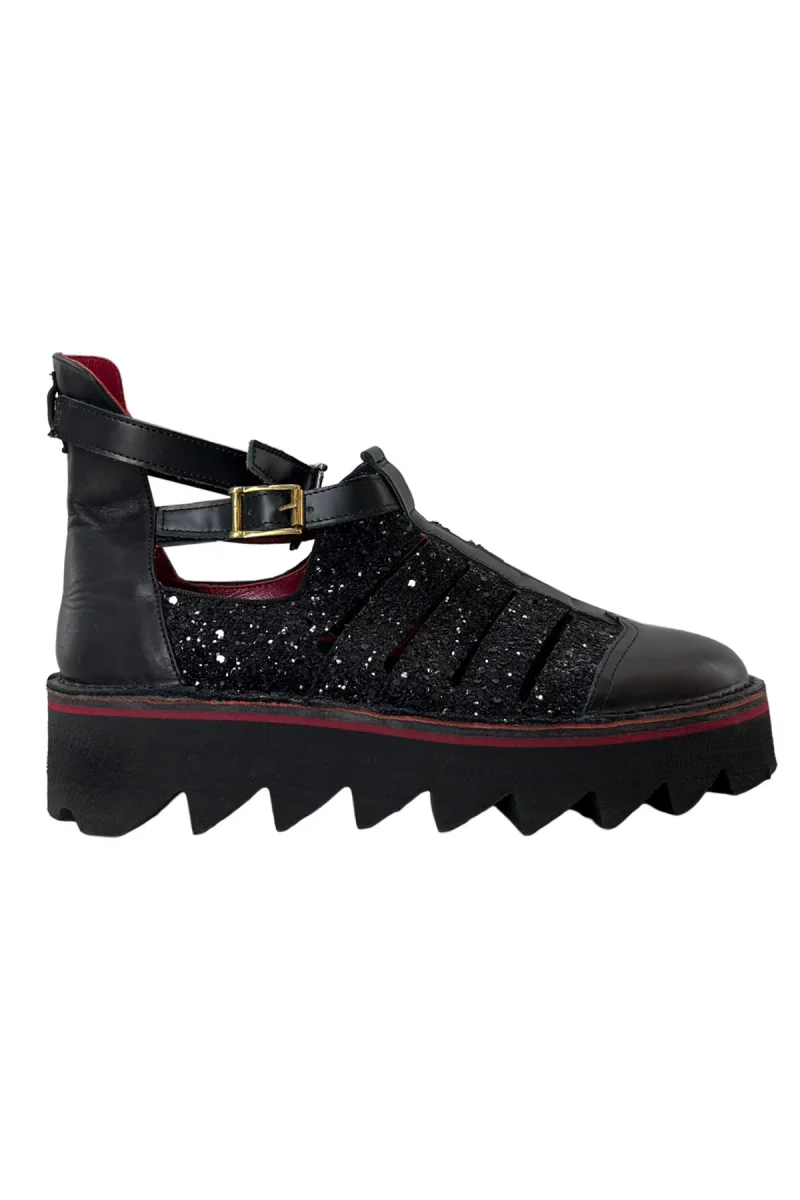 Stivaletti glitter in pelle, traforati, con chiusura zip sul retro e doppia fibbia alla caviglia. Suola alta in gomma.