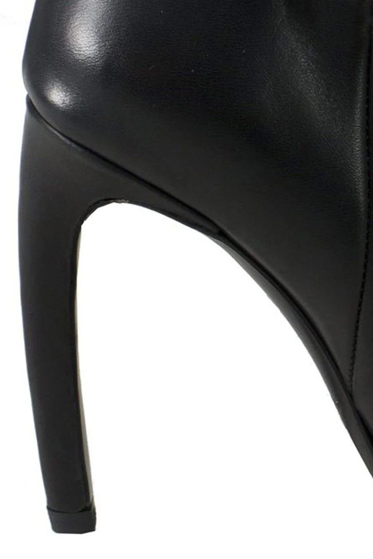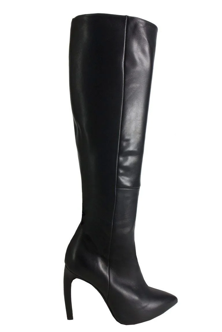 Stivali alti pelle a punta con catena argento removibile tacco a spillo curvo altezza 11cm, chiusura con zip.