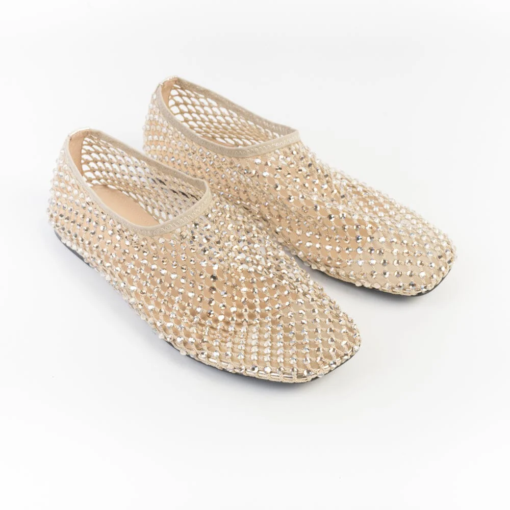 Ballerine bijoux di Strategia, realizzate in rete e Swarovski di colore beige /oro con elastico in nuance. Morbido sottopiede in pelle, suola in cuoio.
