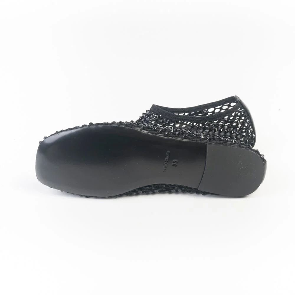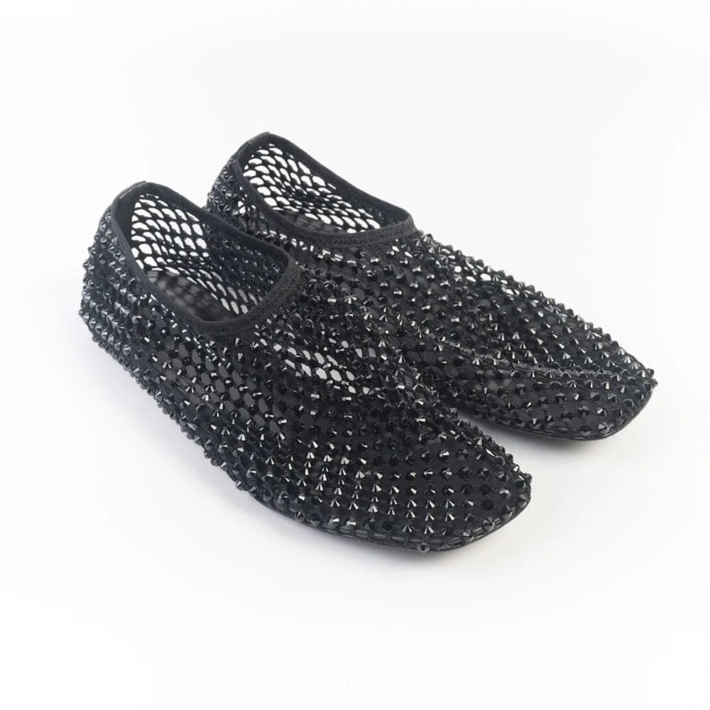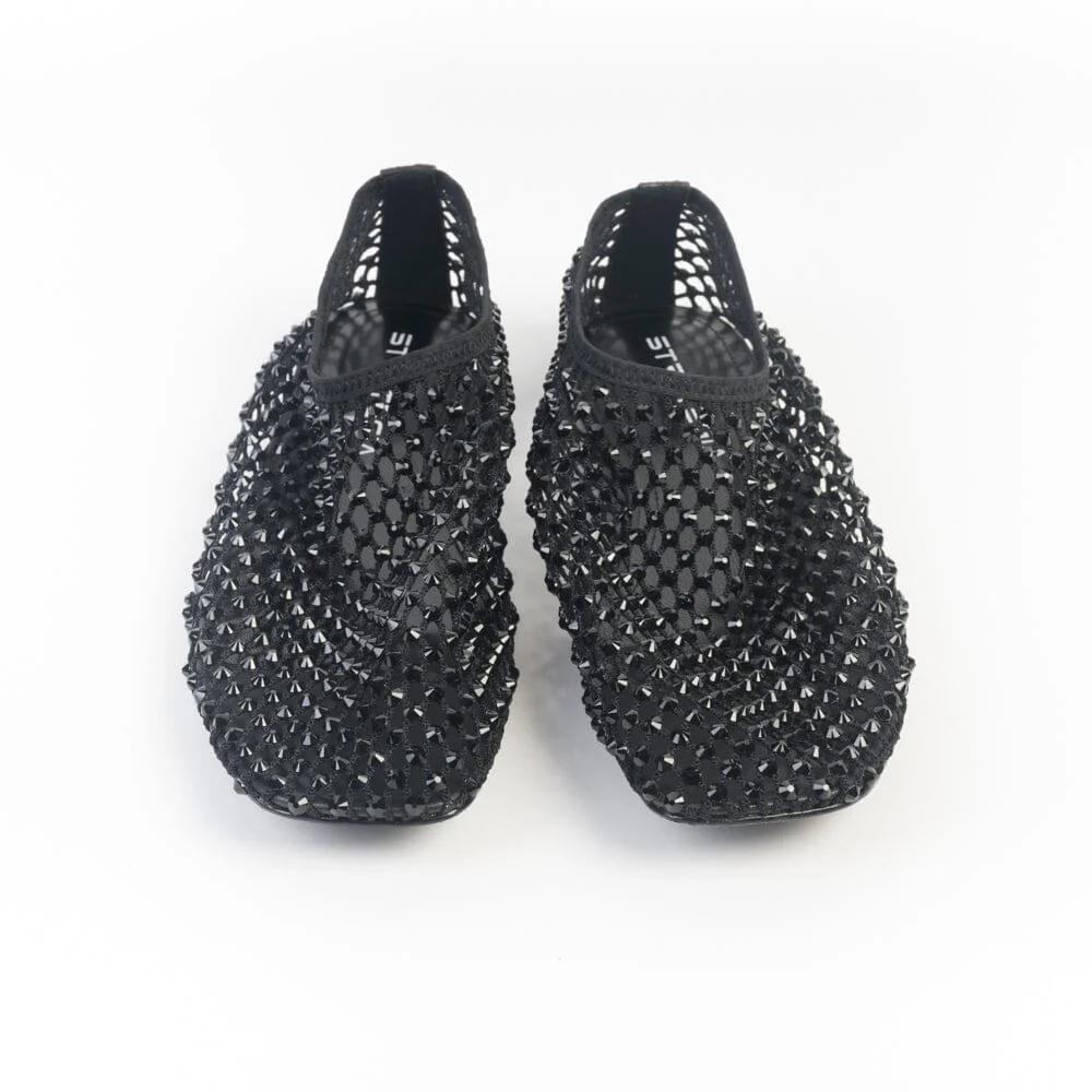 Ballerine bijoux di Strategia, realizzate in rete e Swarovski di colore nero con elastico in nuance. Morbido sottopiede in pelle, suola in cuoio.