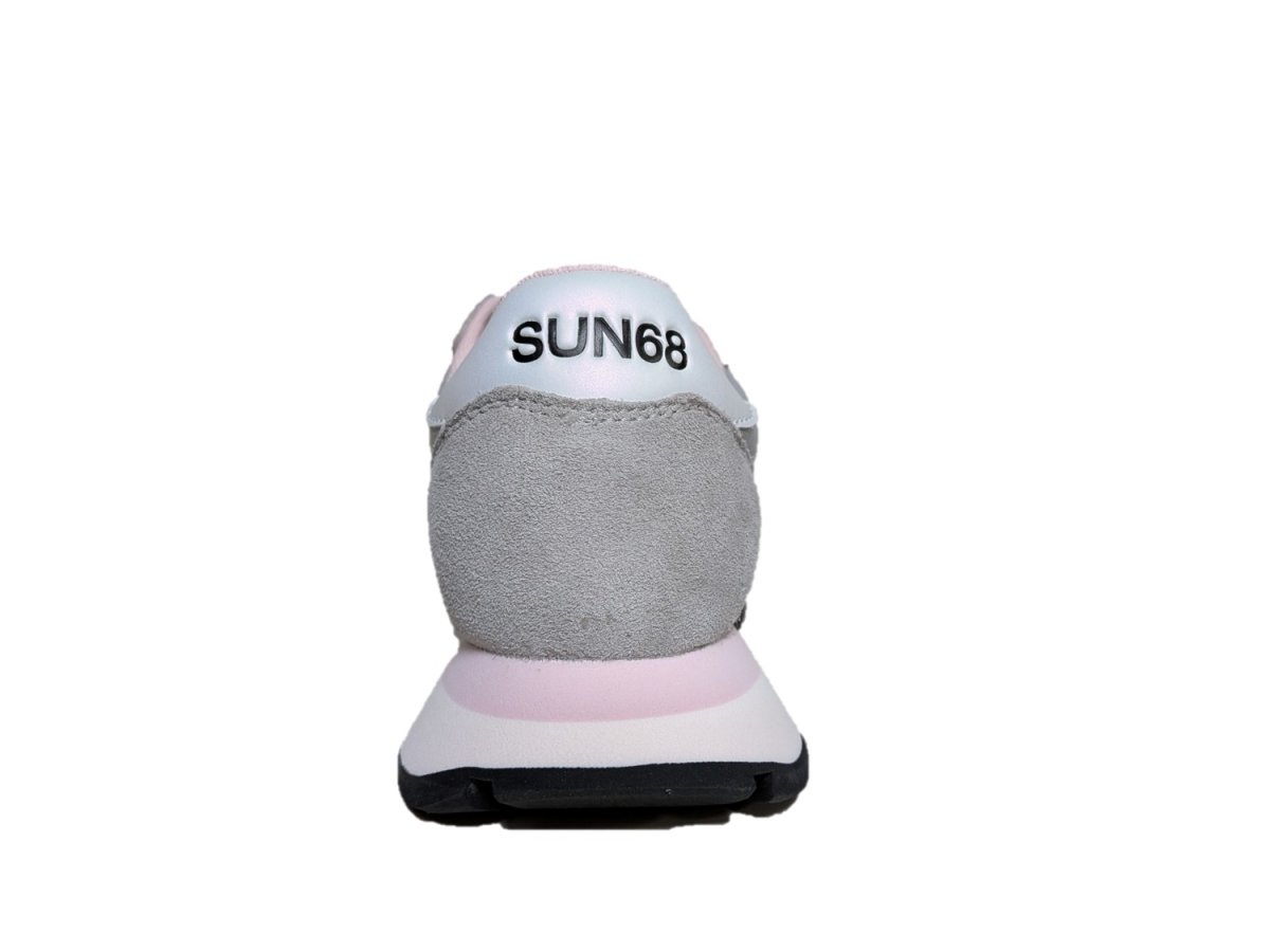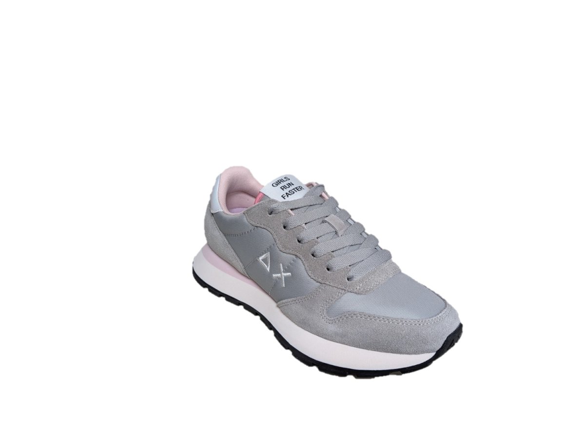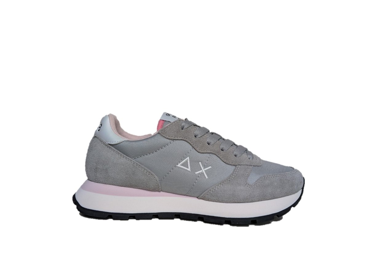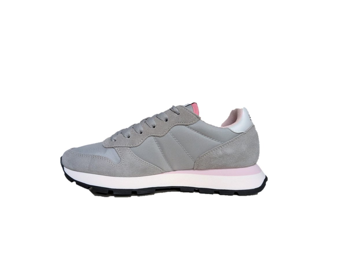 Sneakers in pelle scamosciata e tessuto colore grigio chiaro, suola in gomma, fodera in tessuto, in regalo nella scatola un paio di lacci rosa.