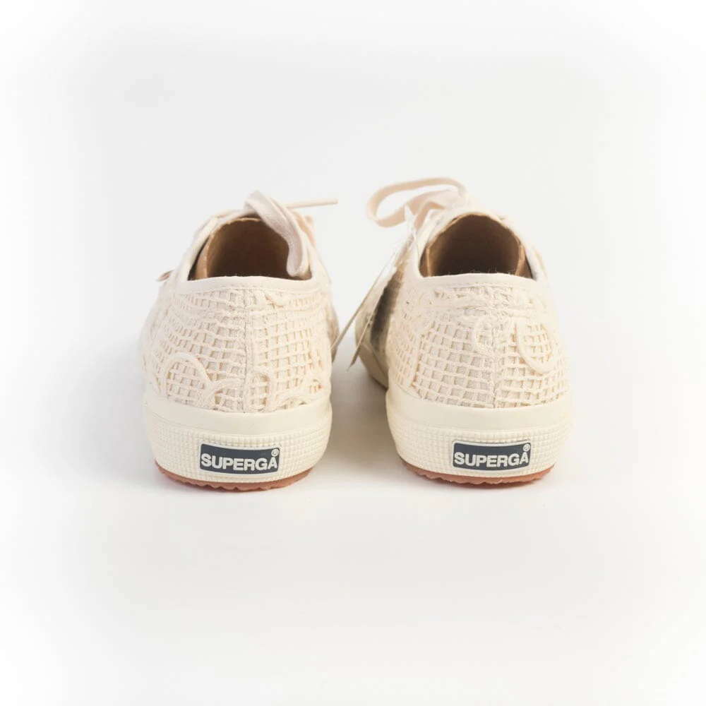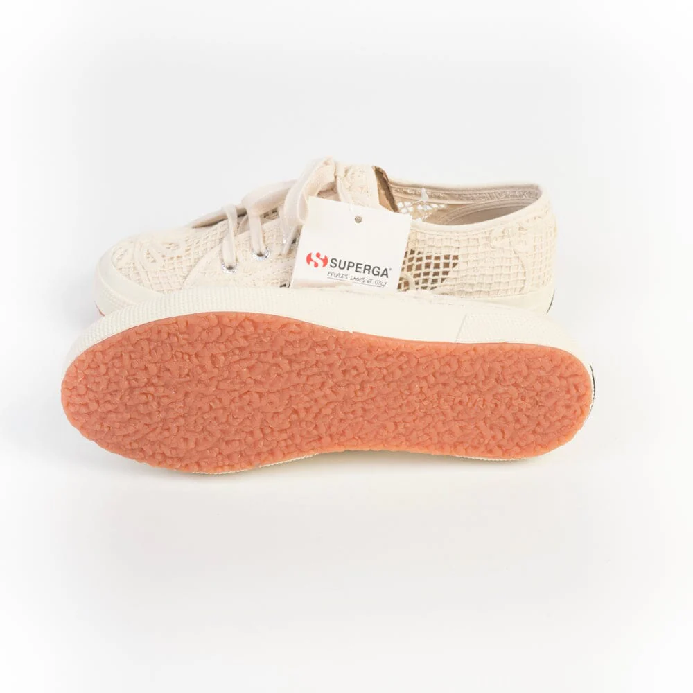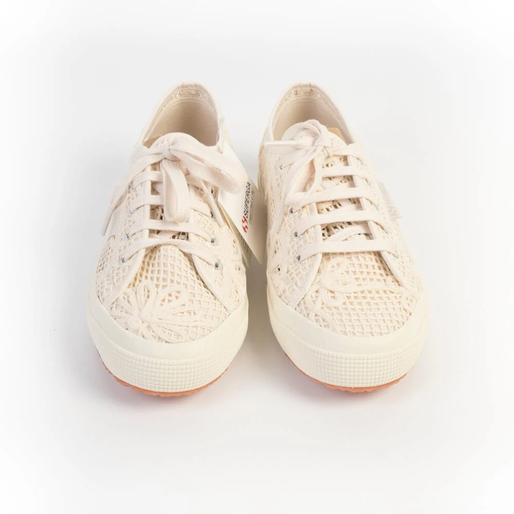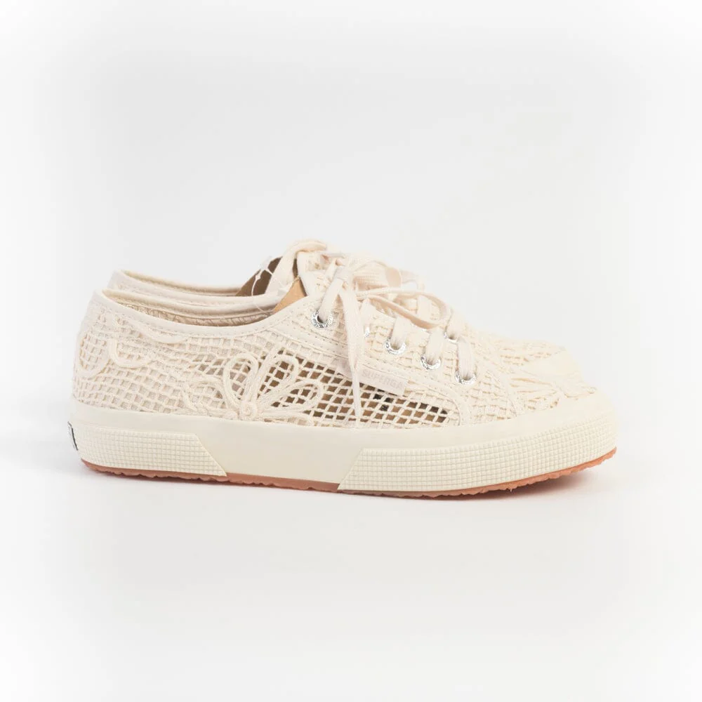 Iconiche Sneakers 2750 di Superga realizzate in pregiato tessuto crochet di colore avorio, con applicazione in nuance di motivi floreali. Soletta interna in sughero. Cinque occhielli con lacci piatti in cotone in nuance. Etichetta con logo del marchio sui lati esterni. Suola marmorizzata di colore naturale.