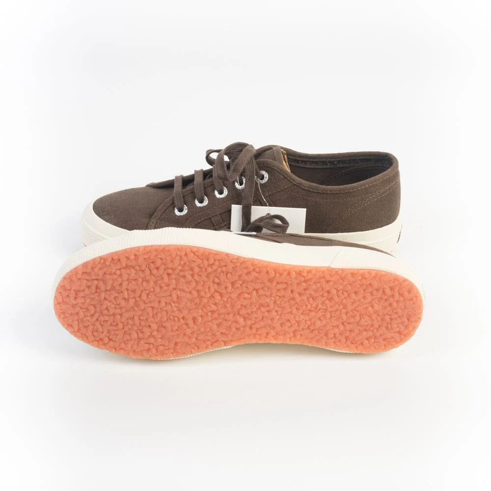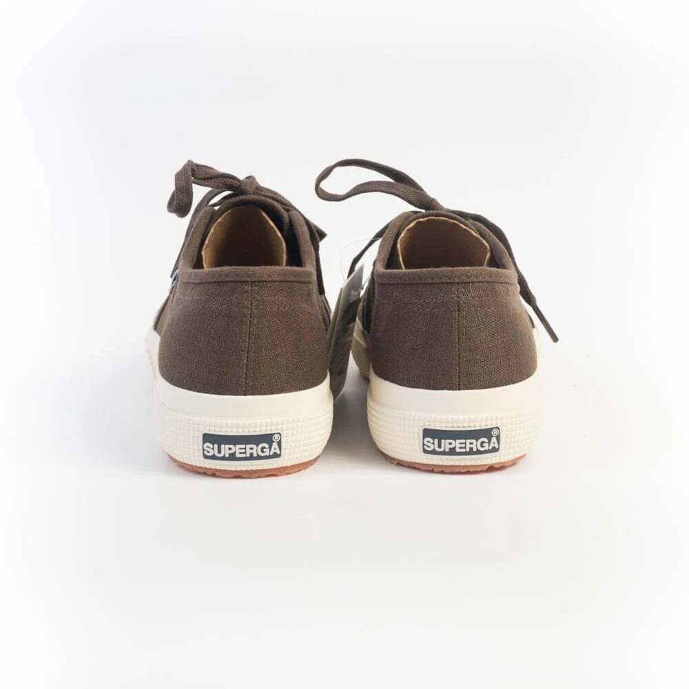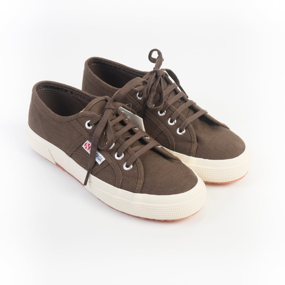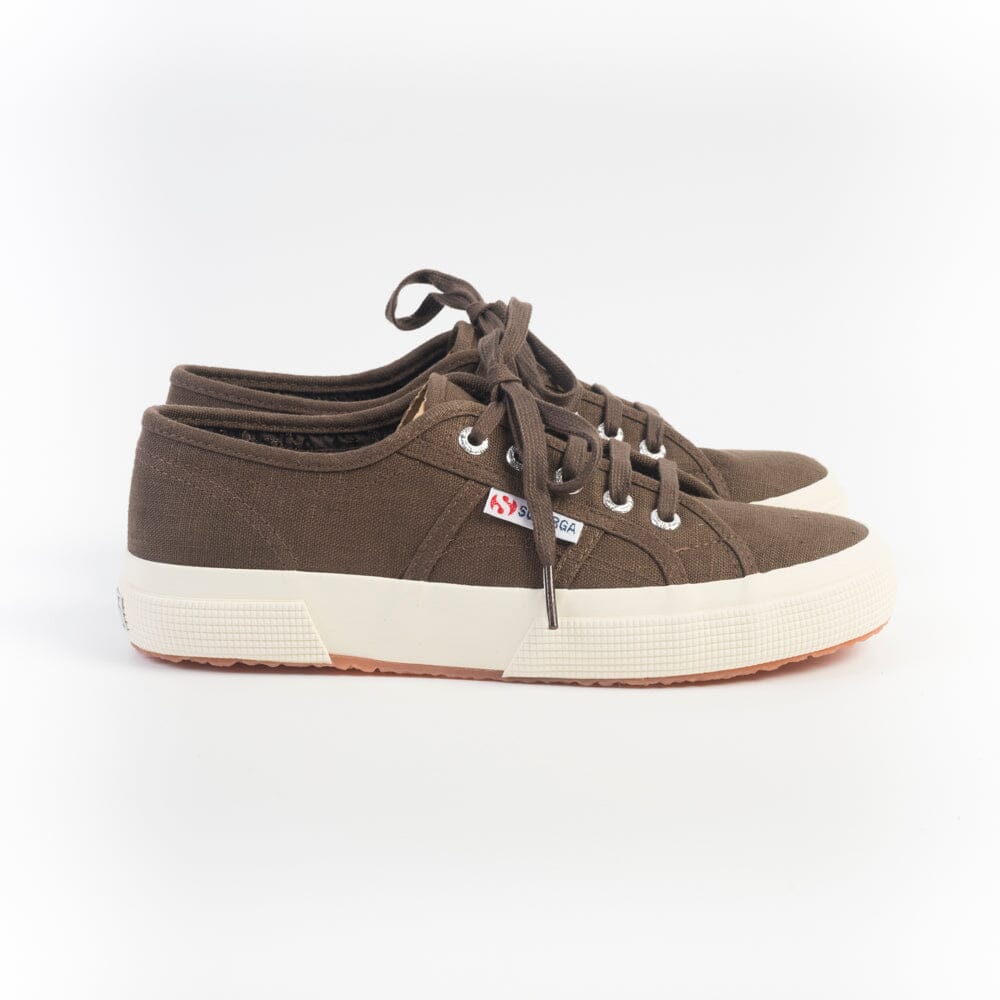Iconiche Sneakers 2750 di Superga realizzate in lino di colore marrone, soletta interna originale in nuance. Cinque occhielli con lacci piatti in cotone in nuance. Etichetta con logo del marchio sui lati esterni. Suola marmorizzata di colore naturale.